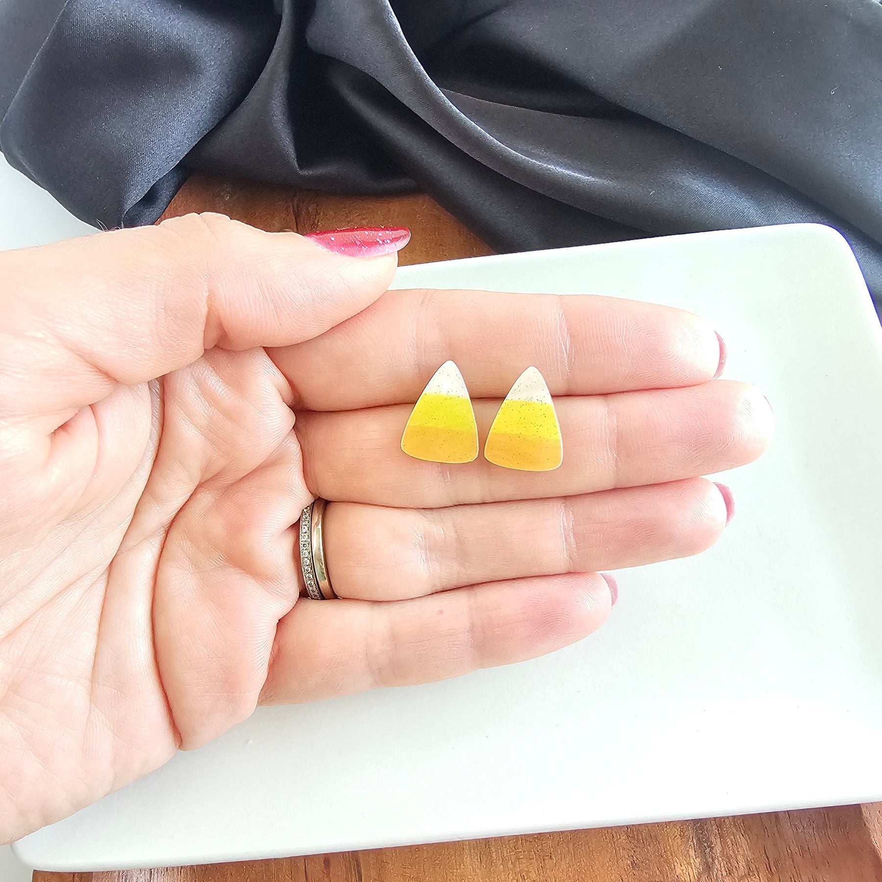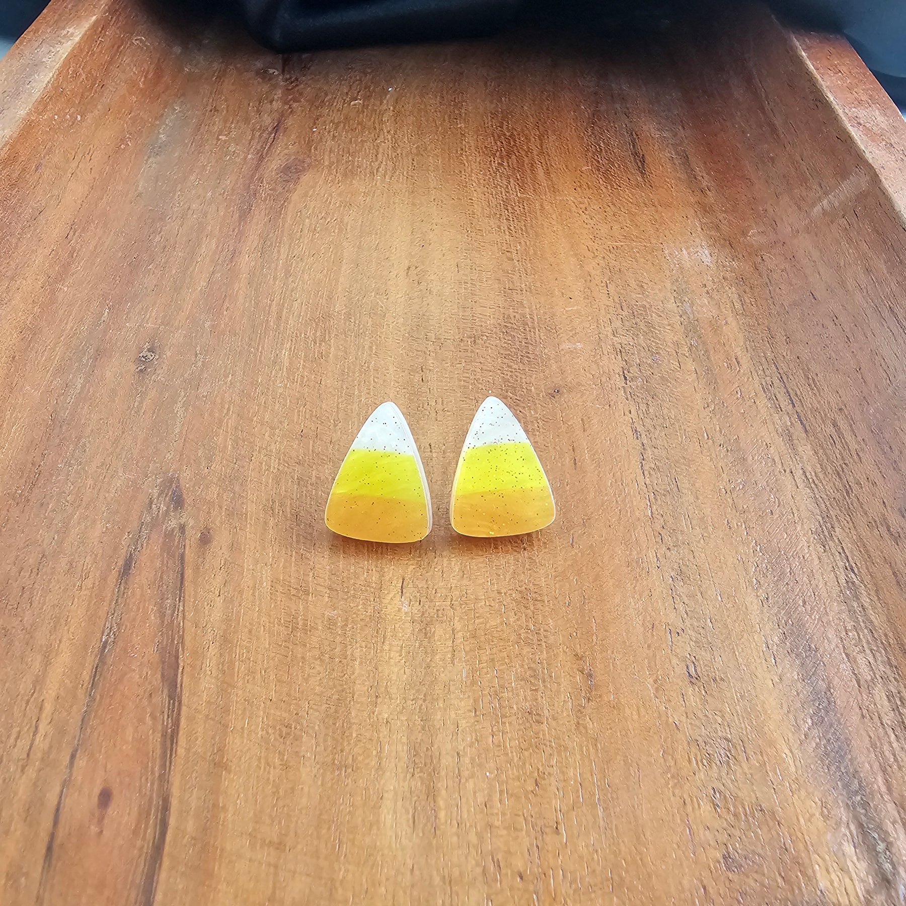 Get ready for some festive fun with our new Candy Corn Studs! These earrings are a charming and playful way to celebrate the spooky season. Their iconic shape and classic colors make them the perfect little pop of seasonal style, and since they're crafted from lightweight shimmer acrylic, they'll catch the light with a subtle sparkle.