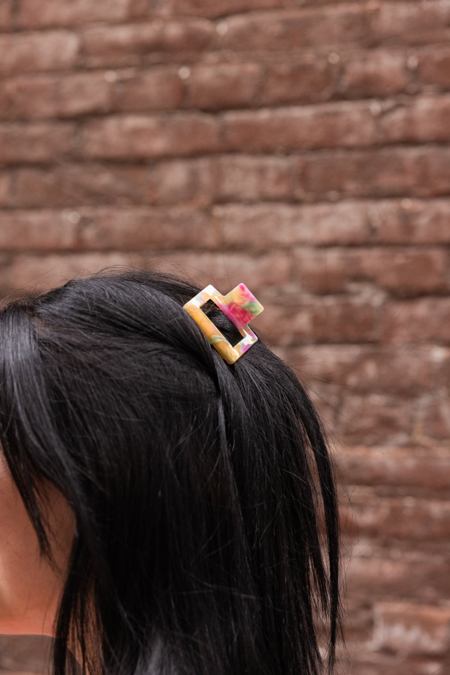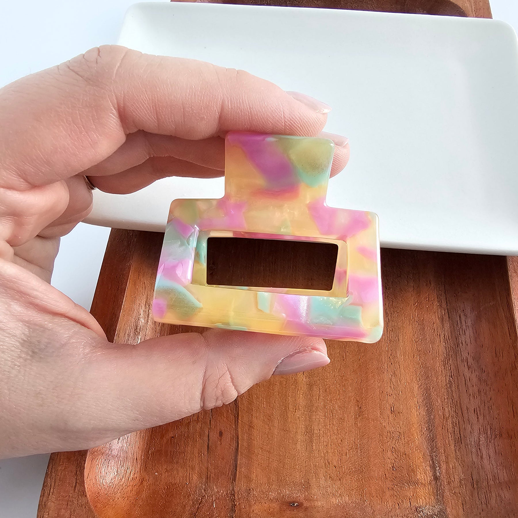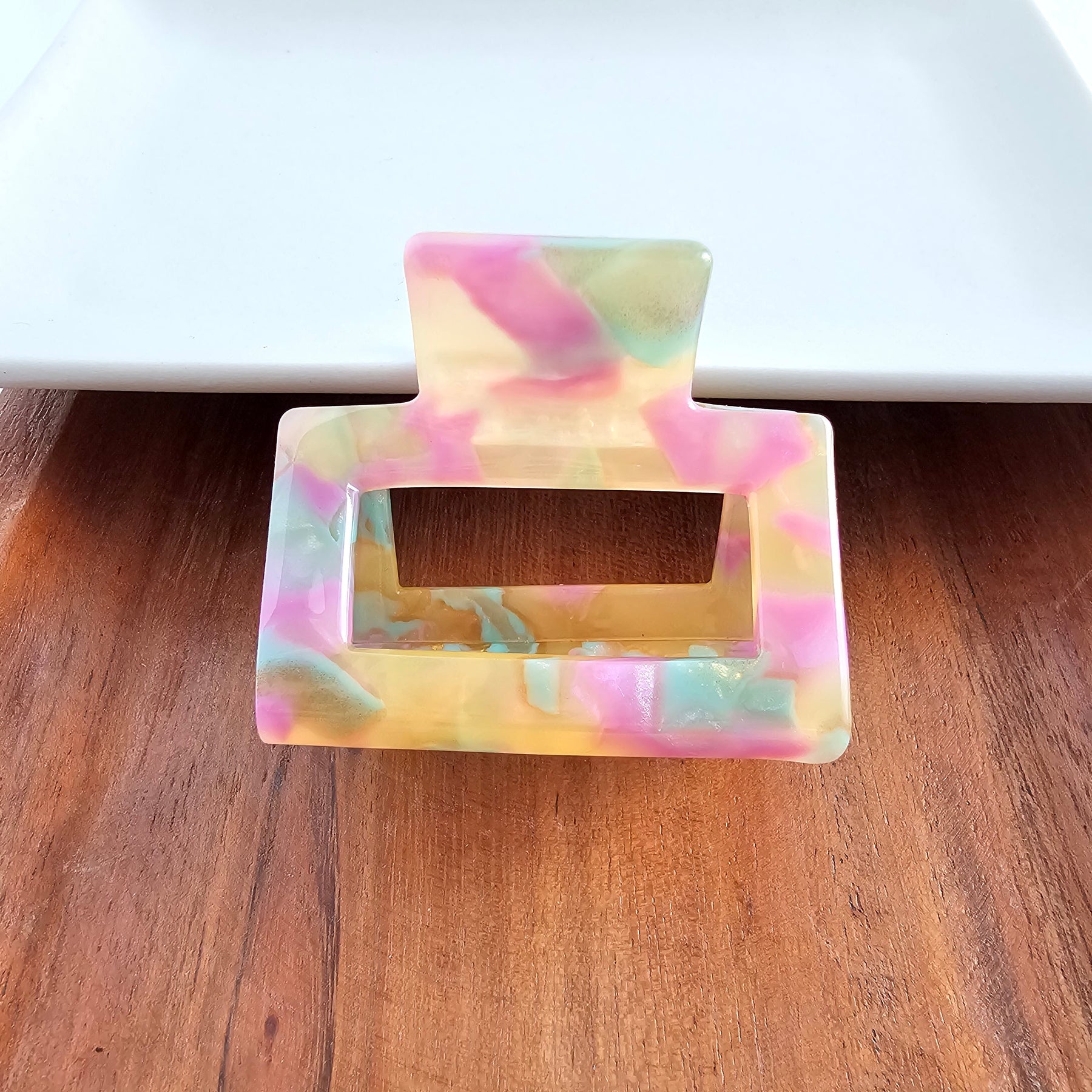 • Plant-based acetate acrylic hair claw with a clear protective cover over the spring.