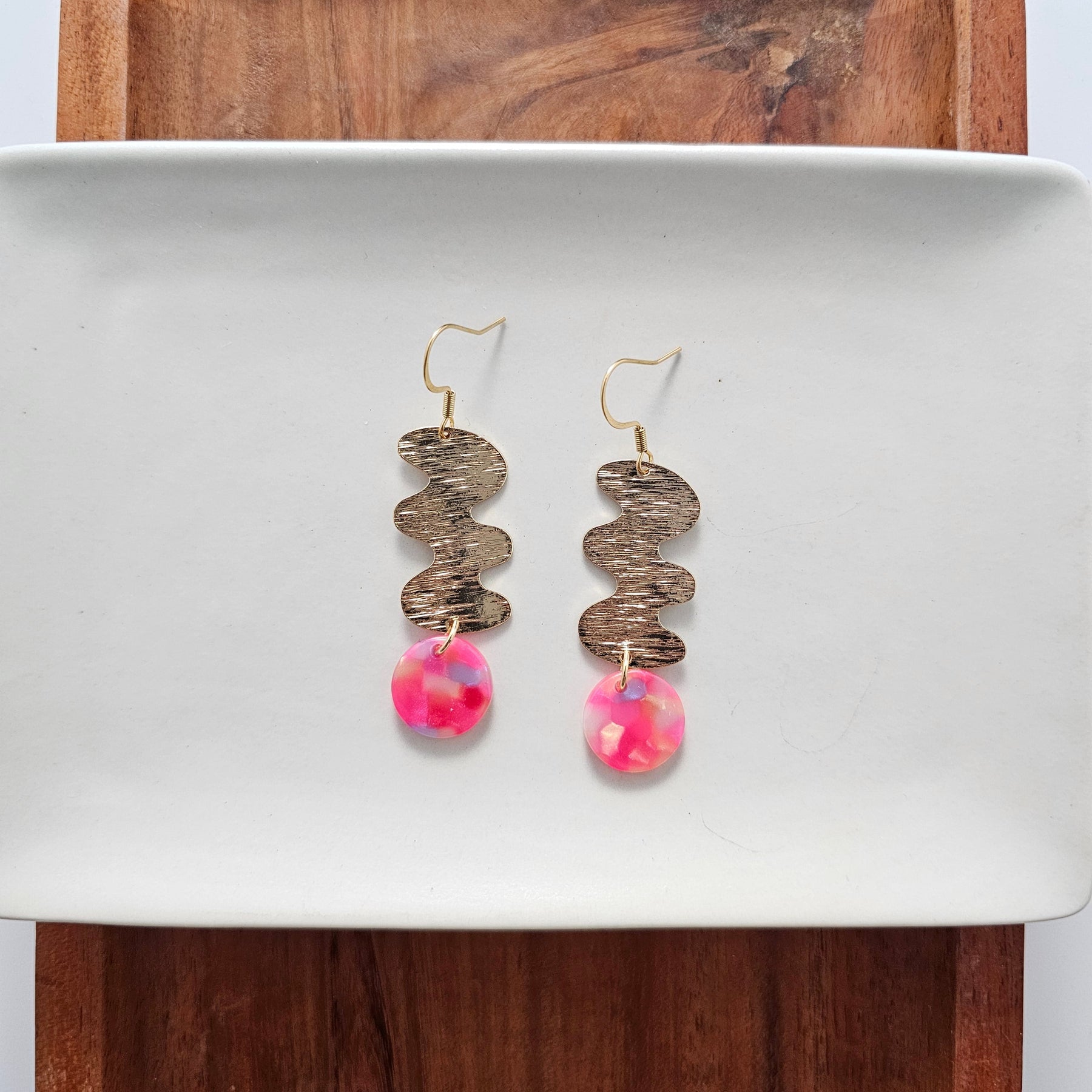 Add a touch of whimsy to your outfit with our Hazel Earrings! These playful earrings feature a delicate acrylic accent paired with a bold gold statement piece. Perfect for adding some fun to your jewelry collection.