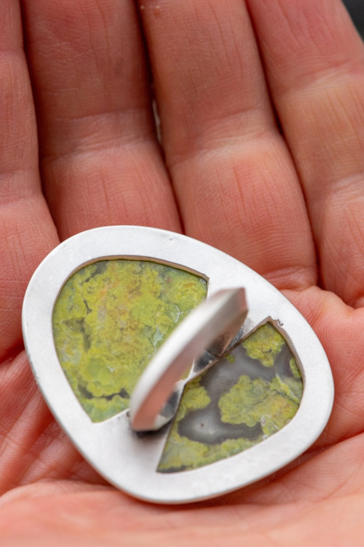 One of the coolest most incredible stones I have ever set. Green opal is a form of common opal blended with Nontronite which is this crazy bubbly smectite that is lime green lime green! You can tell I love this color and I love this ring.