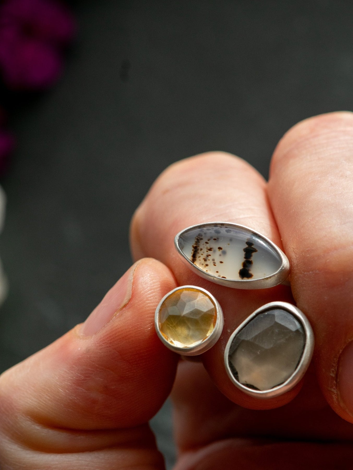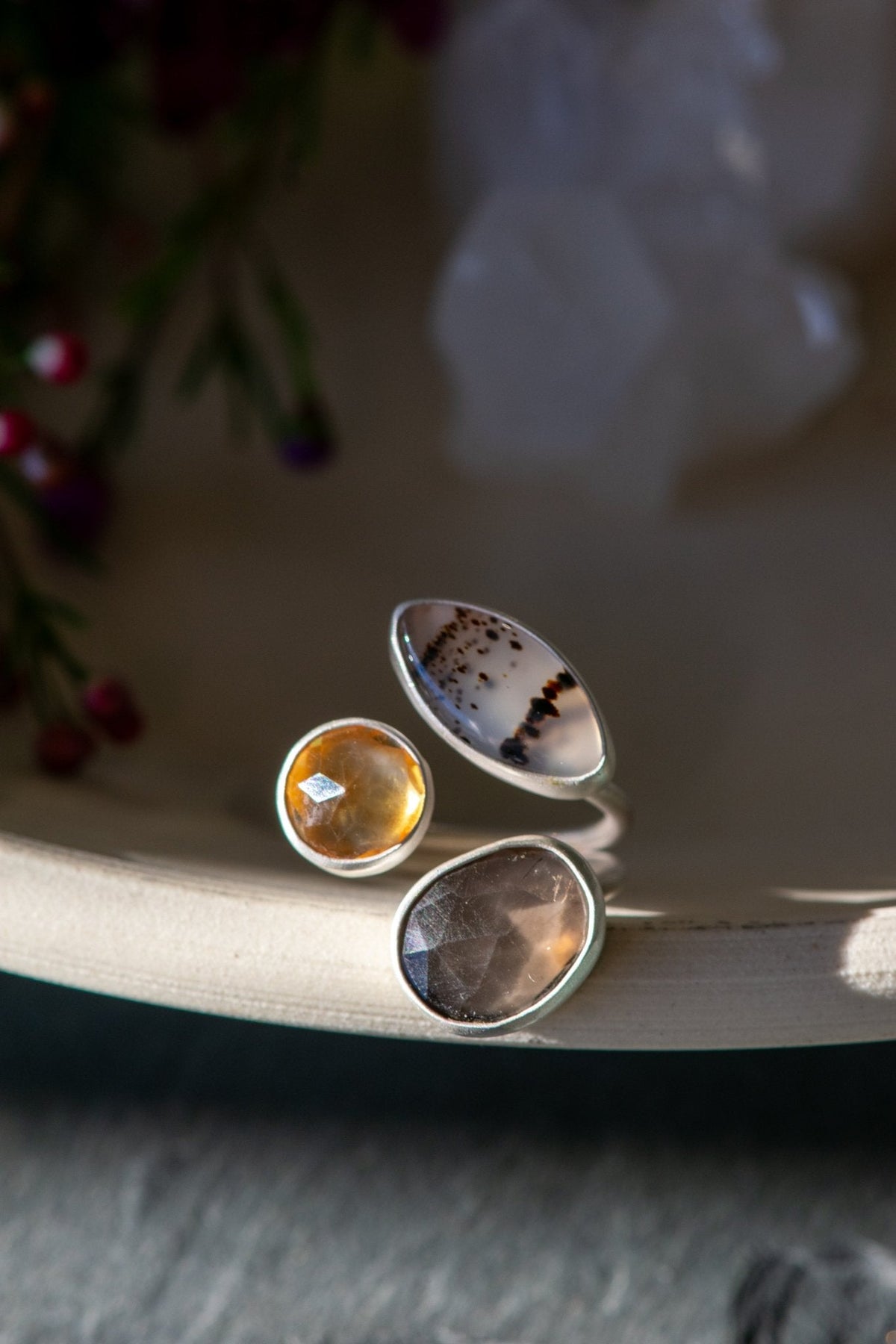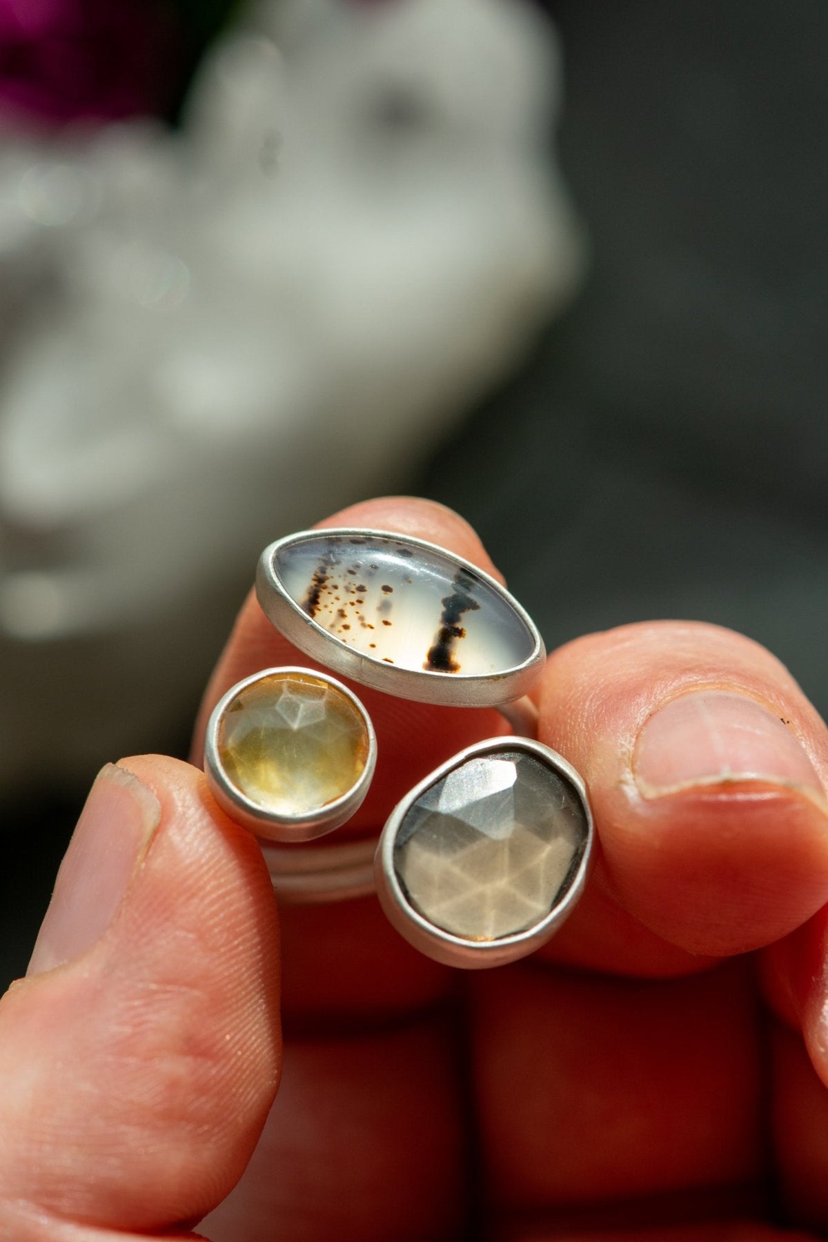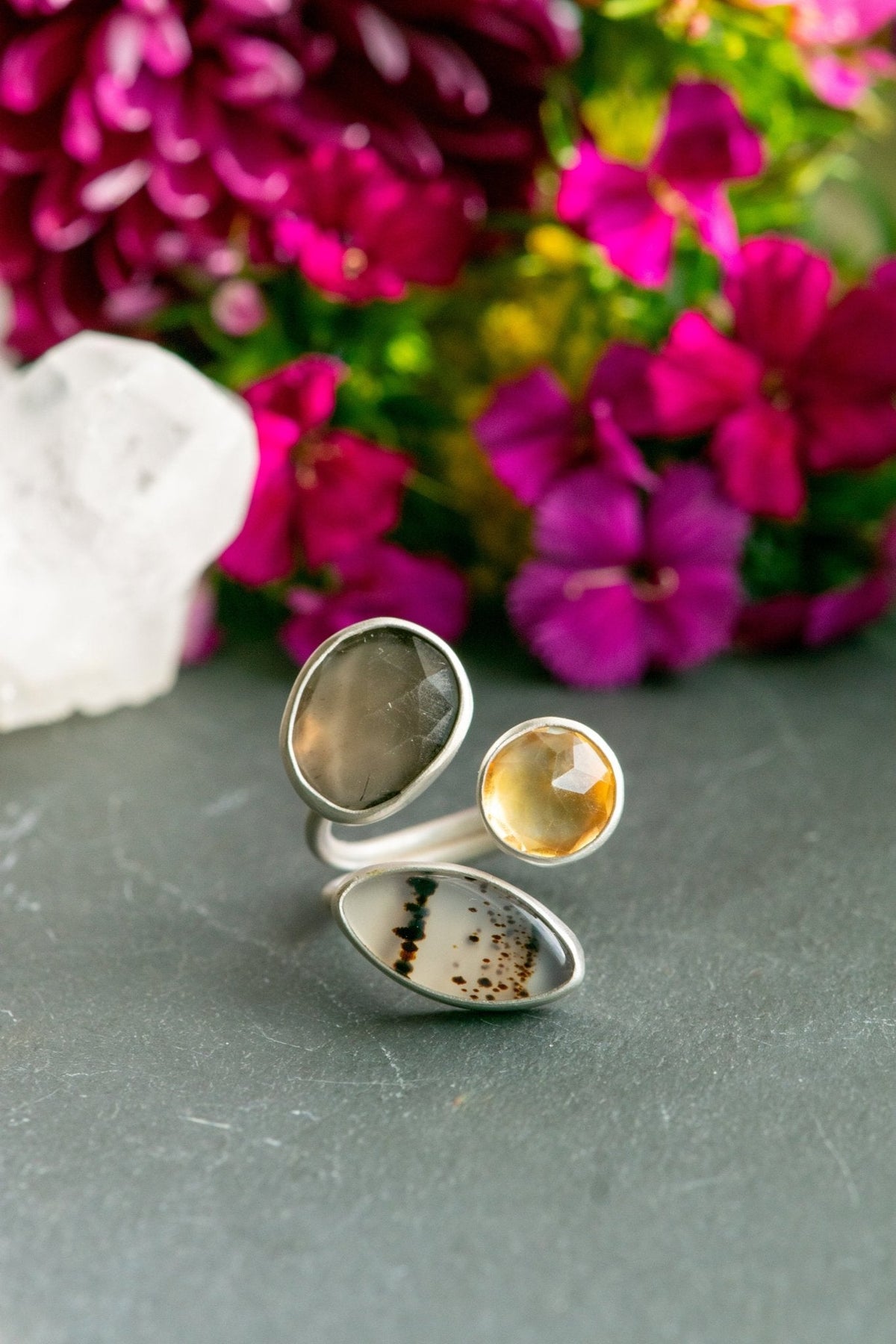 Young Montana agate for opening communication, a citrine as a means of truce and good intentions, a smoky quartz for joining the wind.