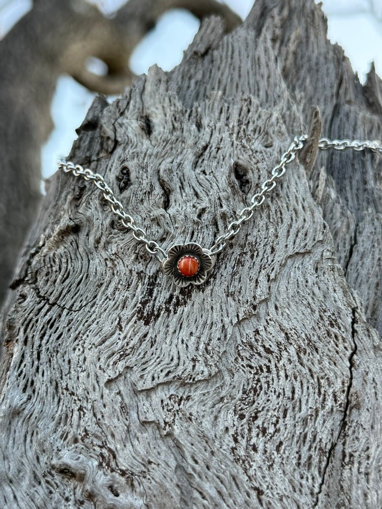 Rooted in the Southwest and blooming with boldness, the Authentic Spiny Oyster Flower Necklace is a statement piece that turns heads and tells stories. Featuring a genuine Spiny Oyster turquoise, this floral beauty captures the untamed elegance of desert blooms. Set in gleaming silver, it brings a perfect blend of rustic charm and refined edge.