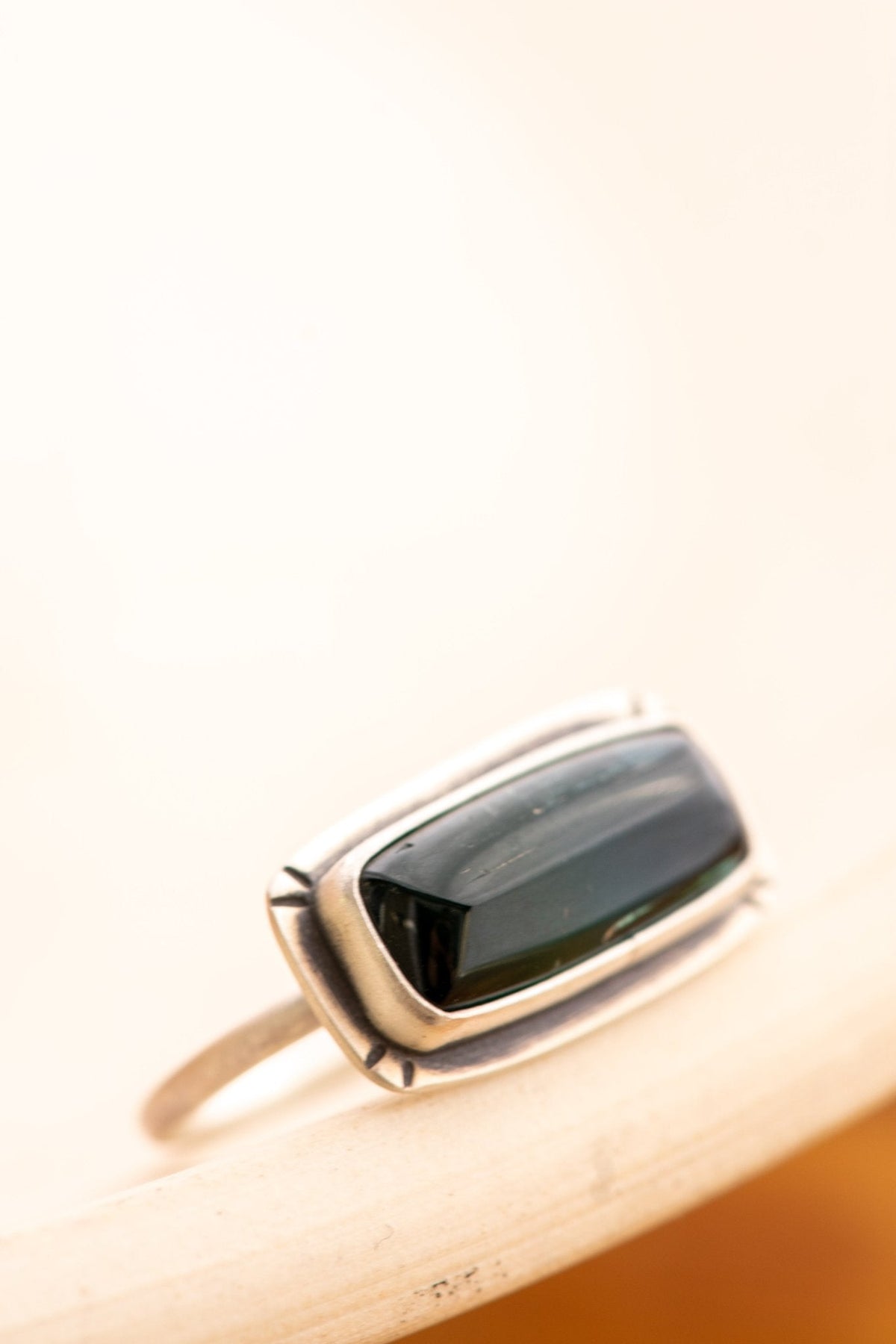 Under filtered/indoor light, this stone looks dark green, almost black. But when sunlight comes in?! This deep ombre of green and teal. It's a stunner.