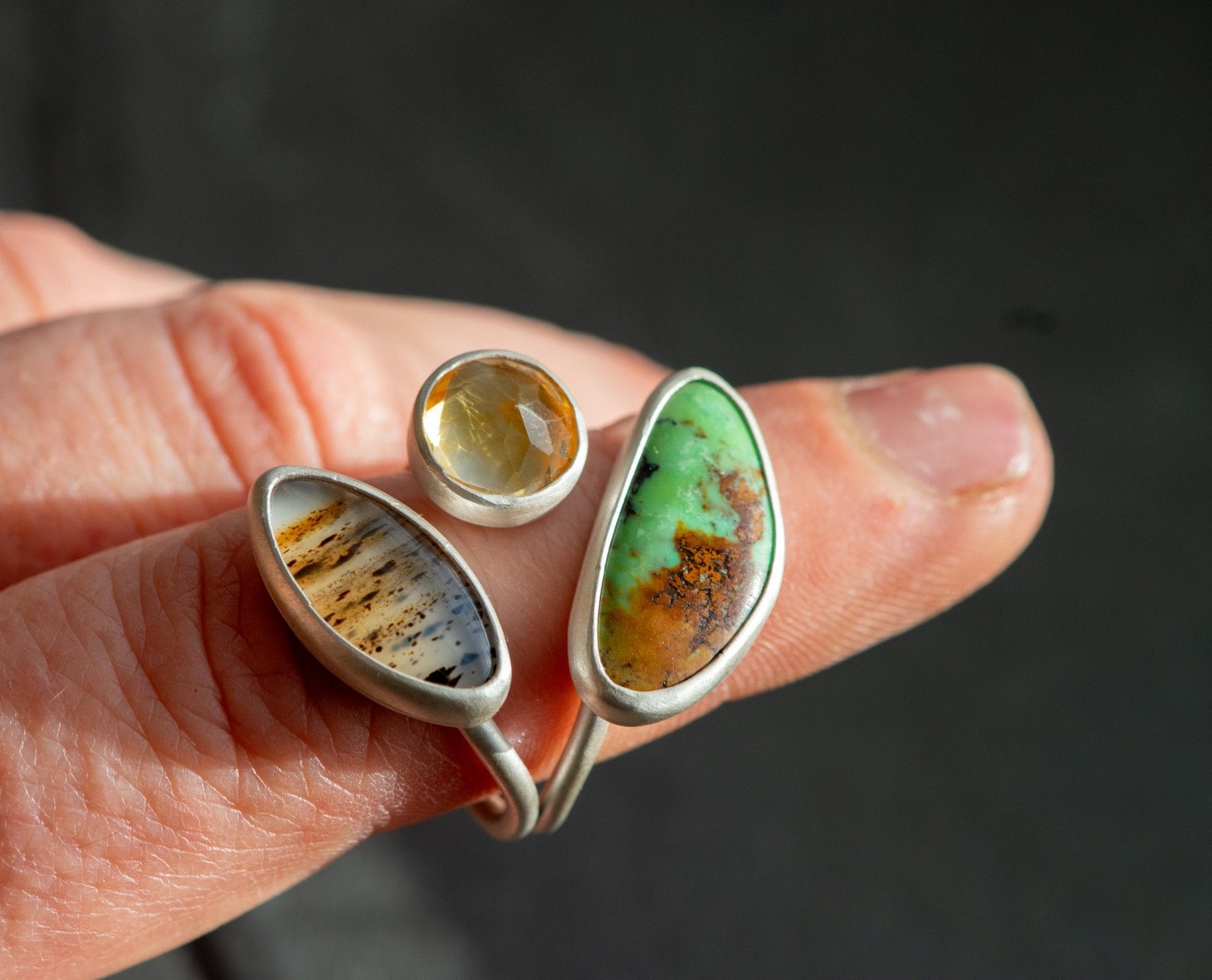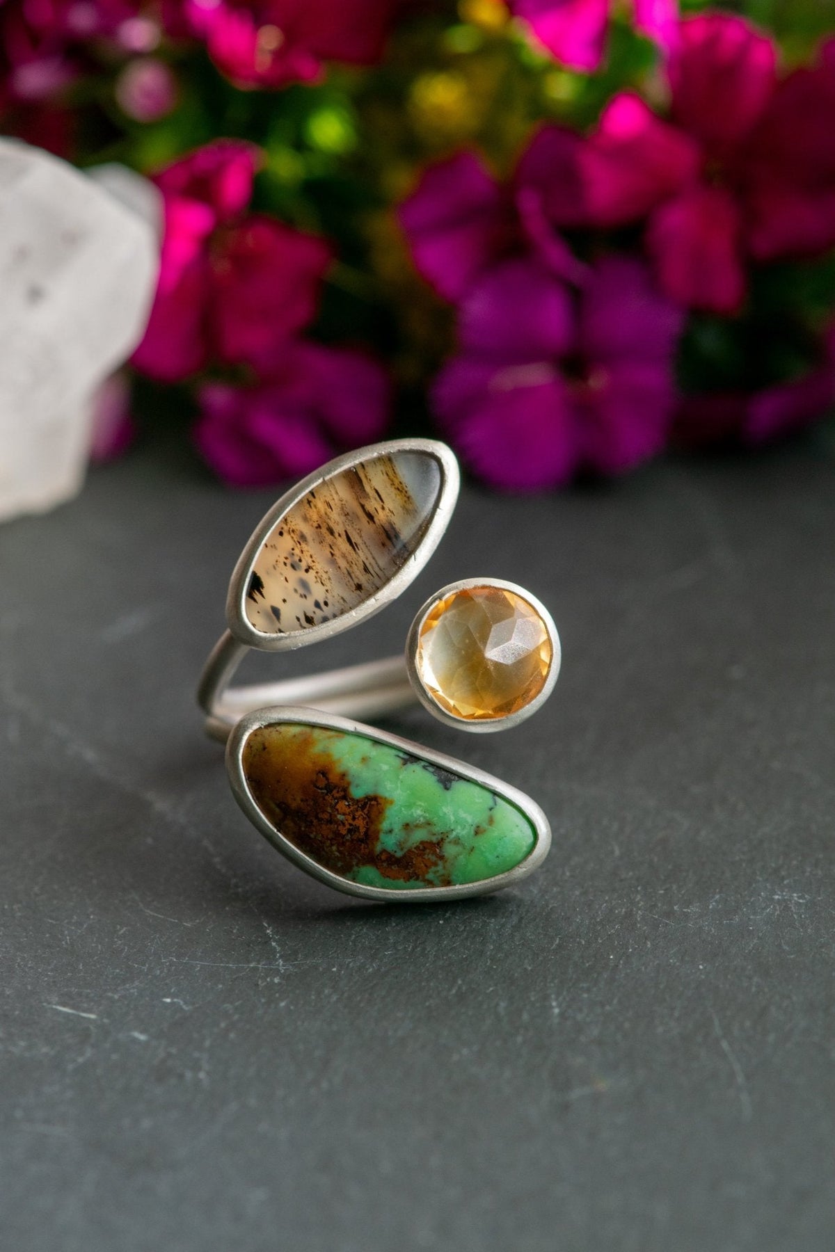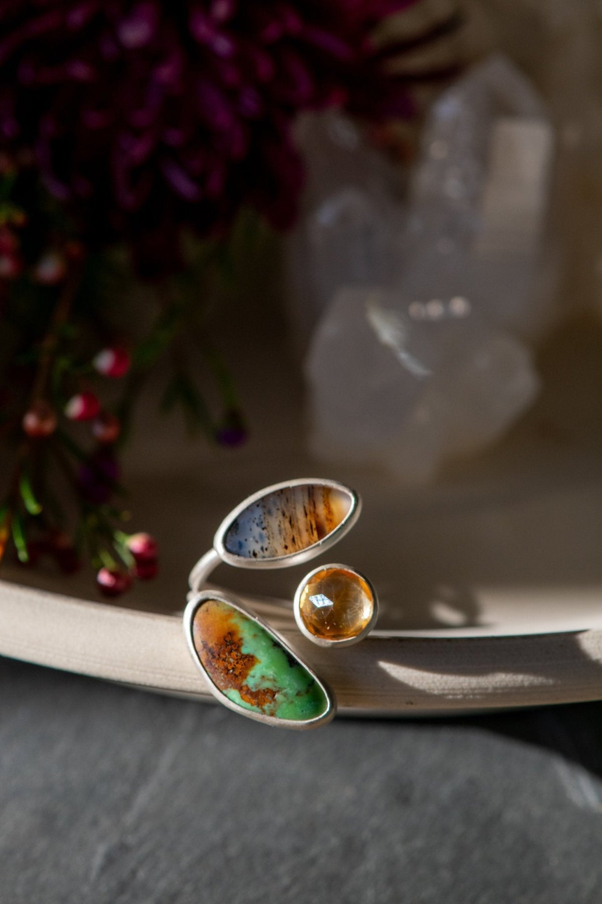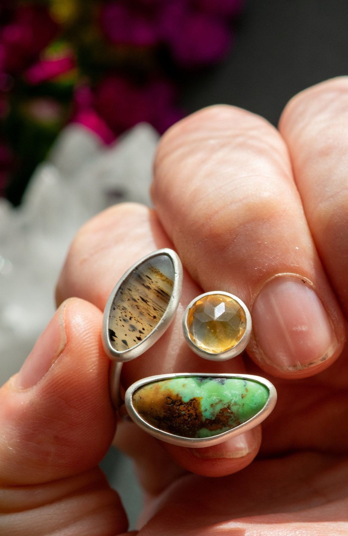 Montana agate for warm earth, sparkling dancing citrine for illumination and stoic strong turquoise to make the steps solid as the path keeps unfolding.