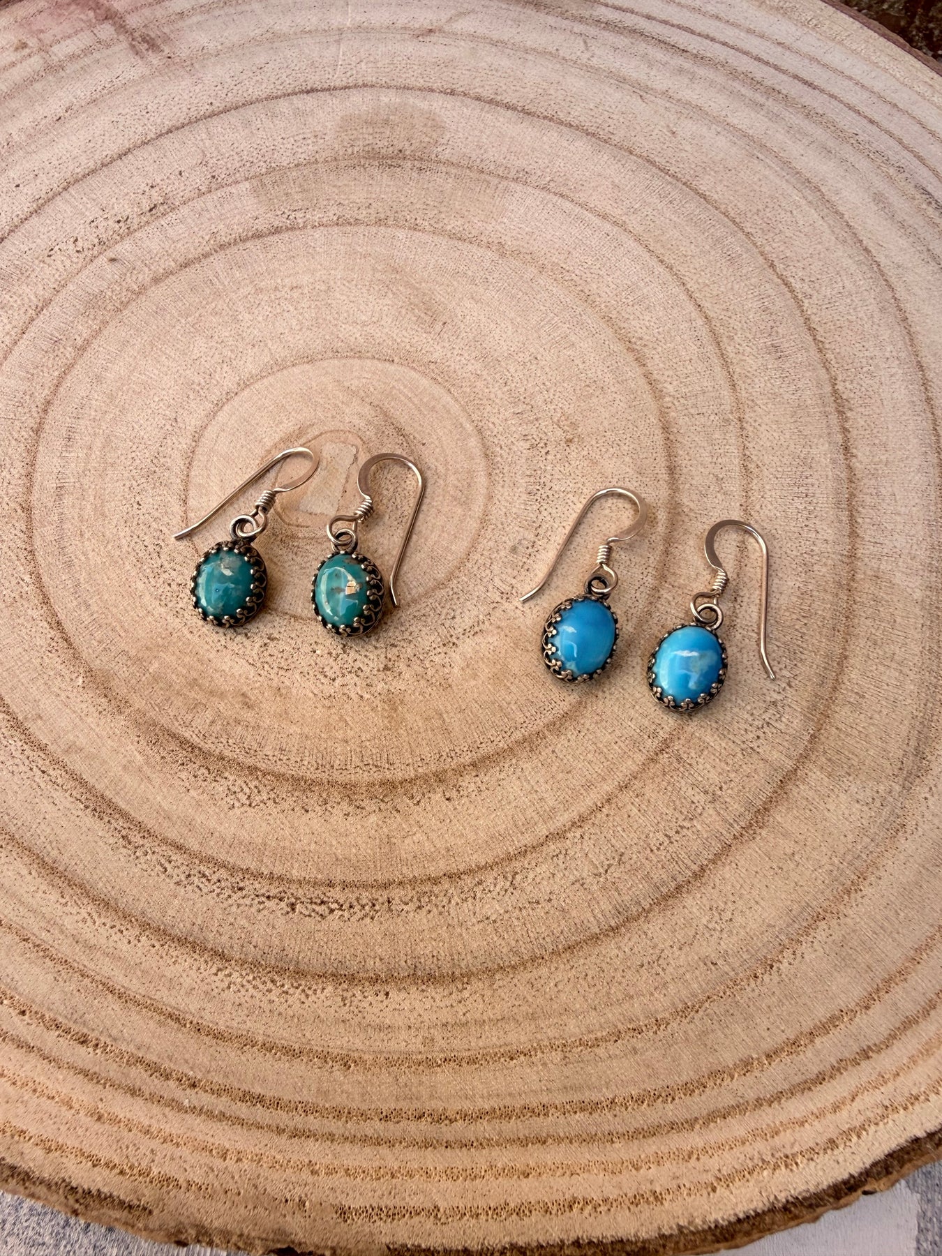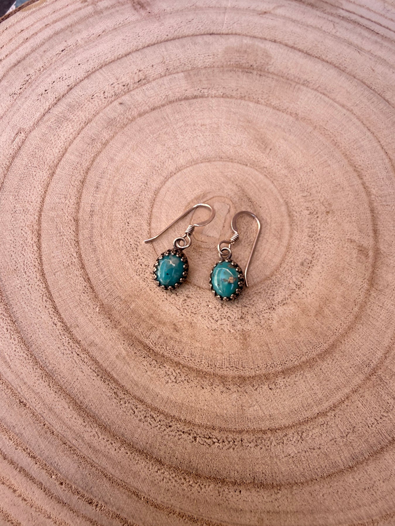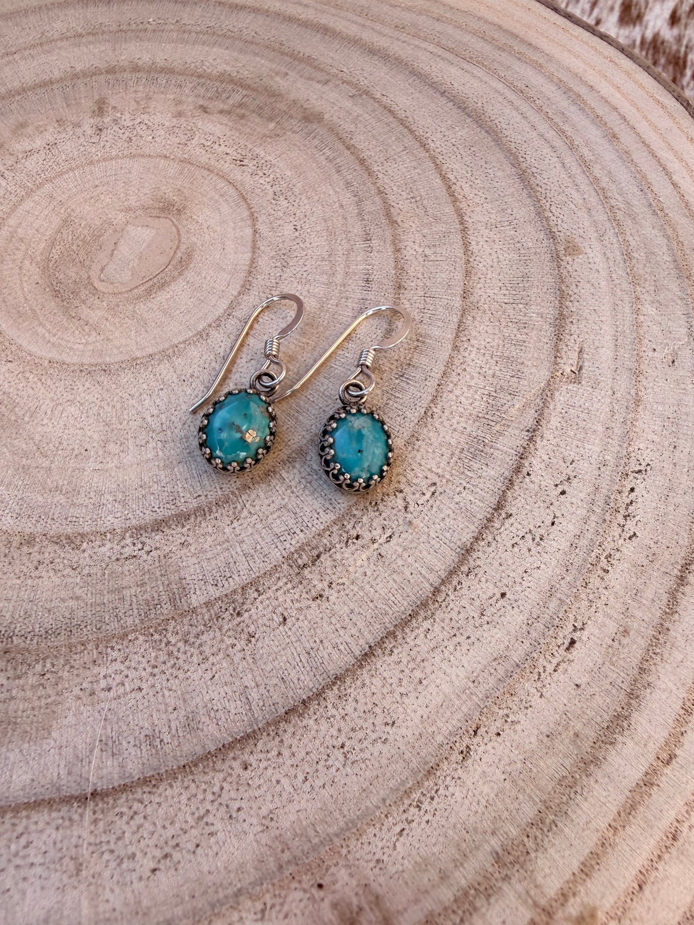.925 sterling crown bezels and genuine Kingman turquoise. These are a perfect everyday wear earring. Available in green or blue turquoise.