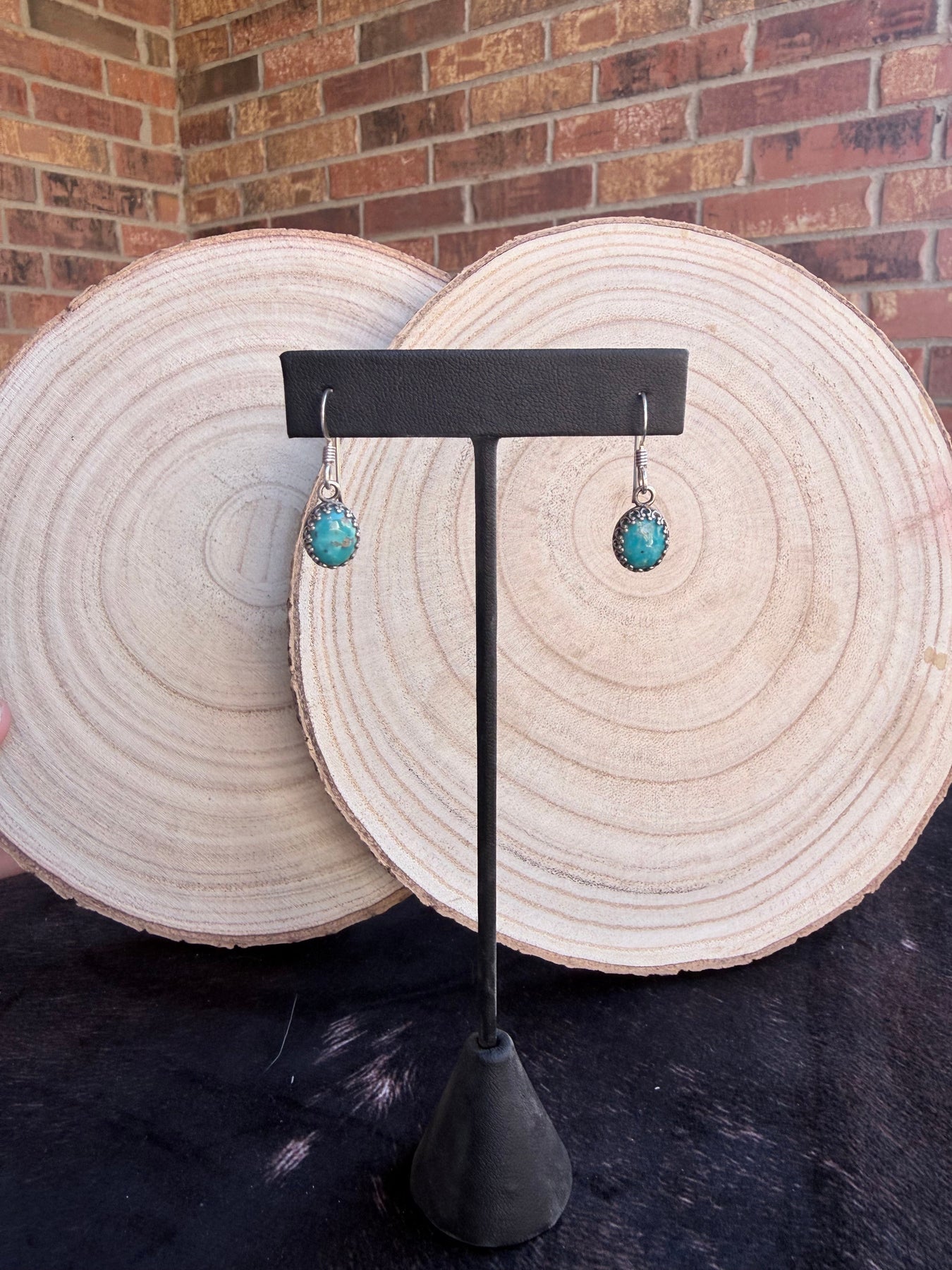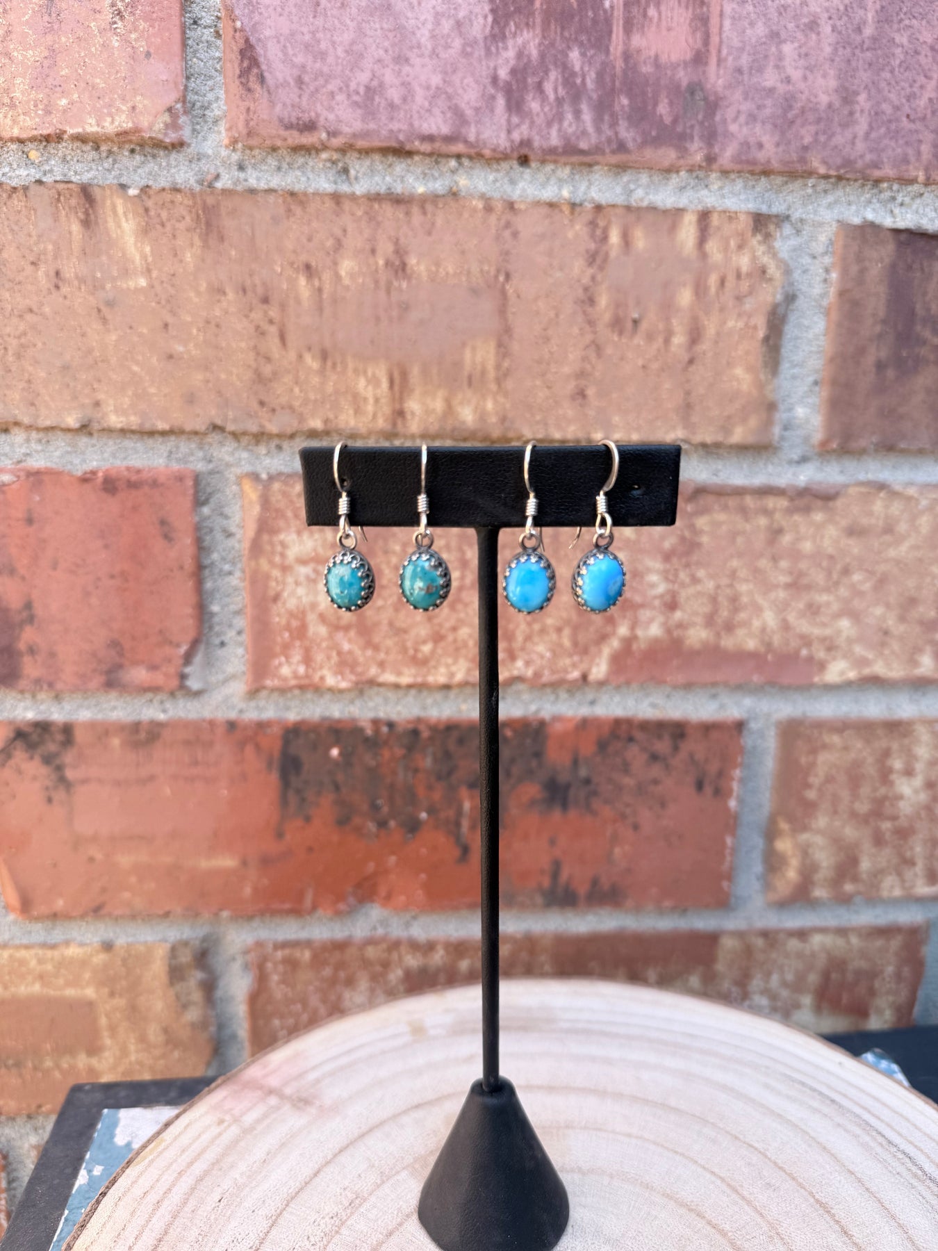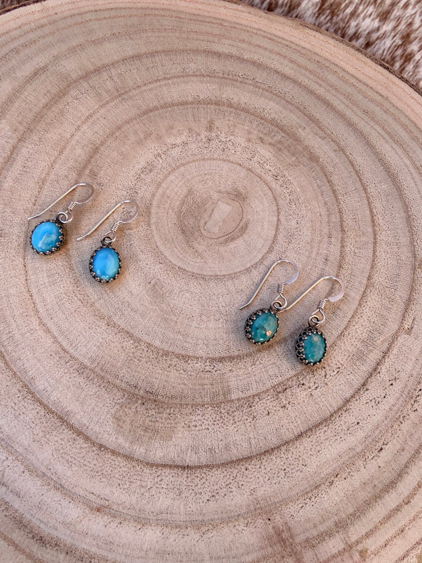 .925 sterling crown bezels and genuine Kingman turquoise. These are a perfect everyday wear earring. Available in green or blue turquoise.