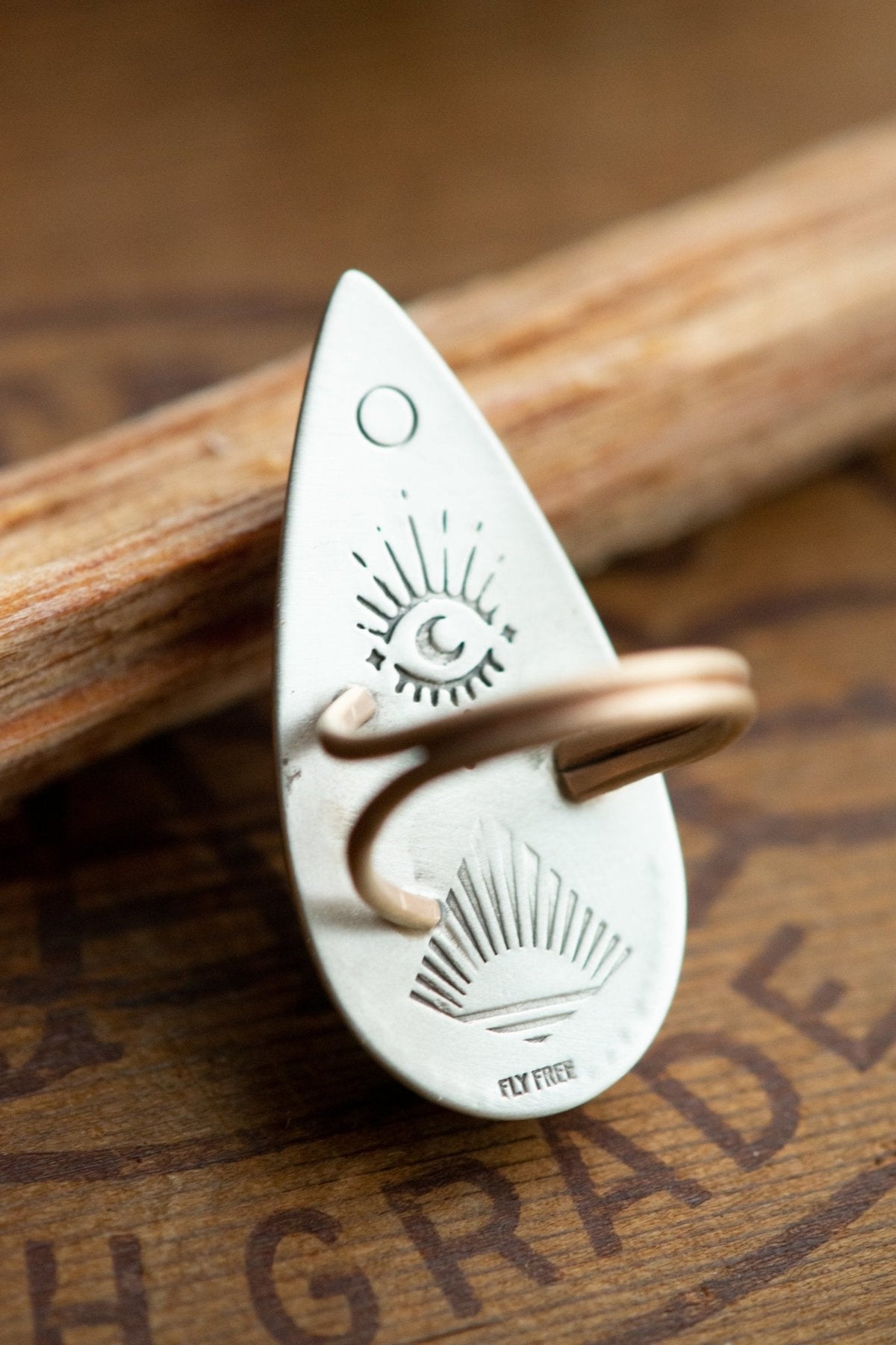 A semi-transparent chevron amethyst. Set in silver with a gold-fill band.