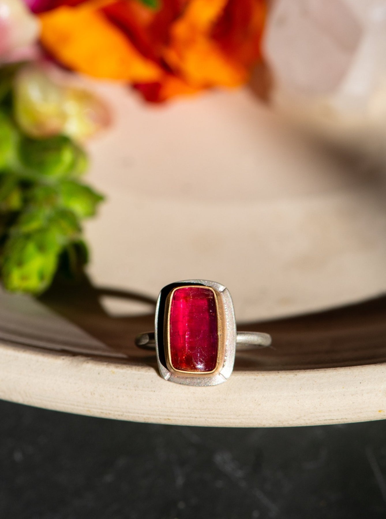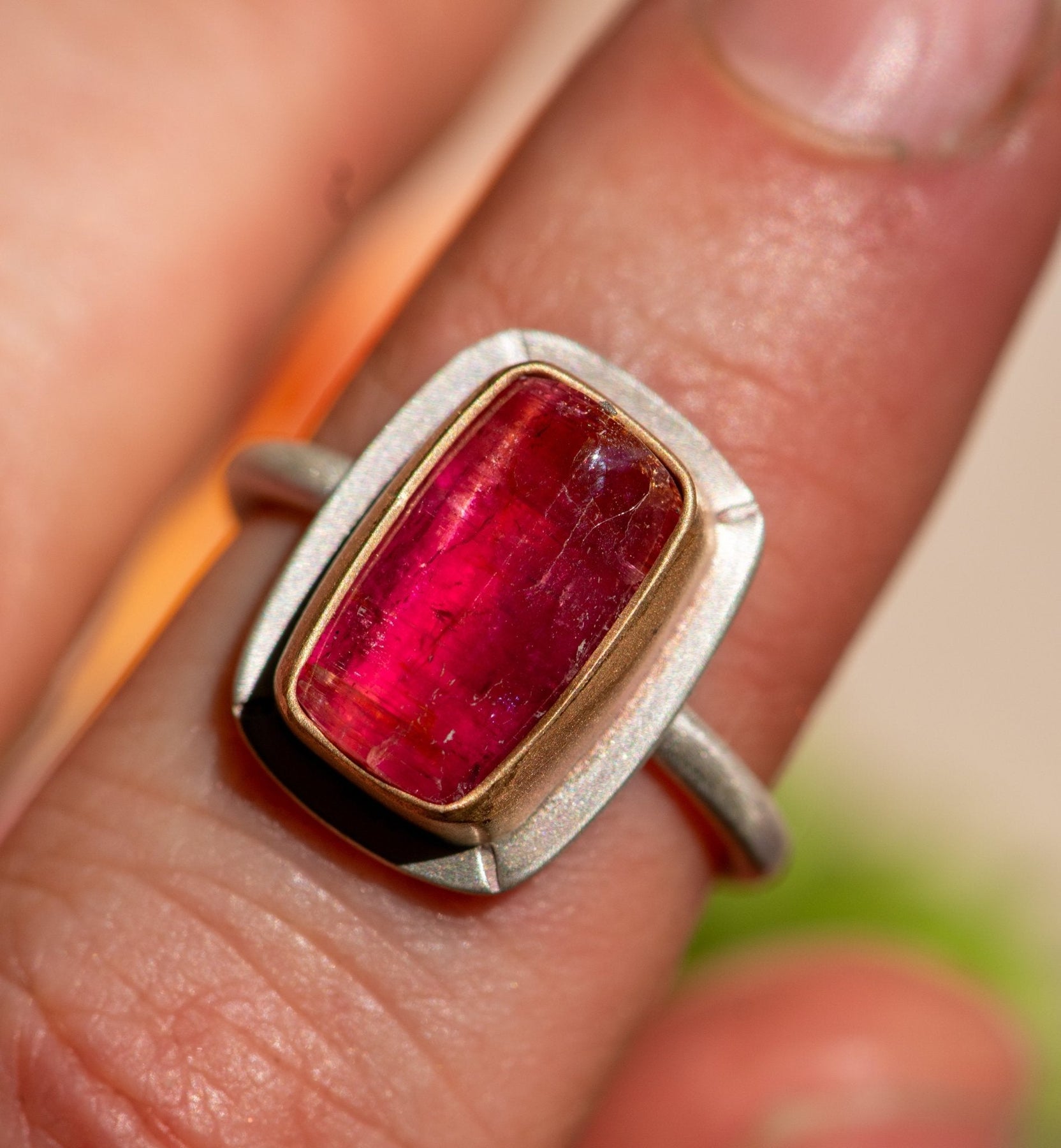 Rubellite tourmaline set in sterling with a gold-fill accent