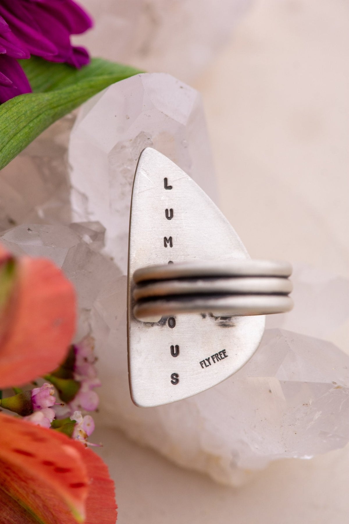 Turquoise be crazy. As a secondary phosphate mineral, it comes in a range of colors, not just the bright blue we think of when we think of the name turquoise. I like that. The band is kinda thick, the back says luminous