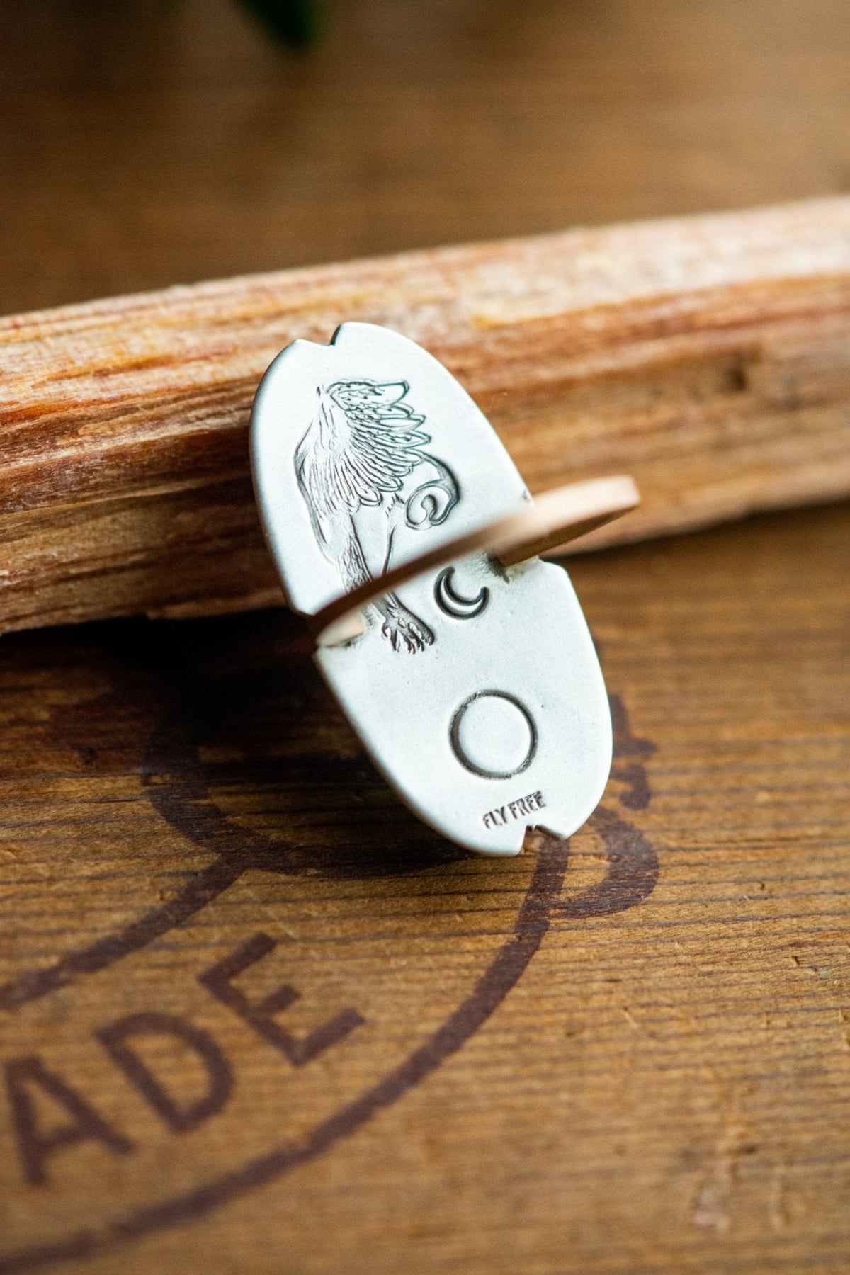 A kaleidoscopic chevron amethyst. Set in silver with a gold-fill band.