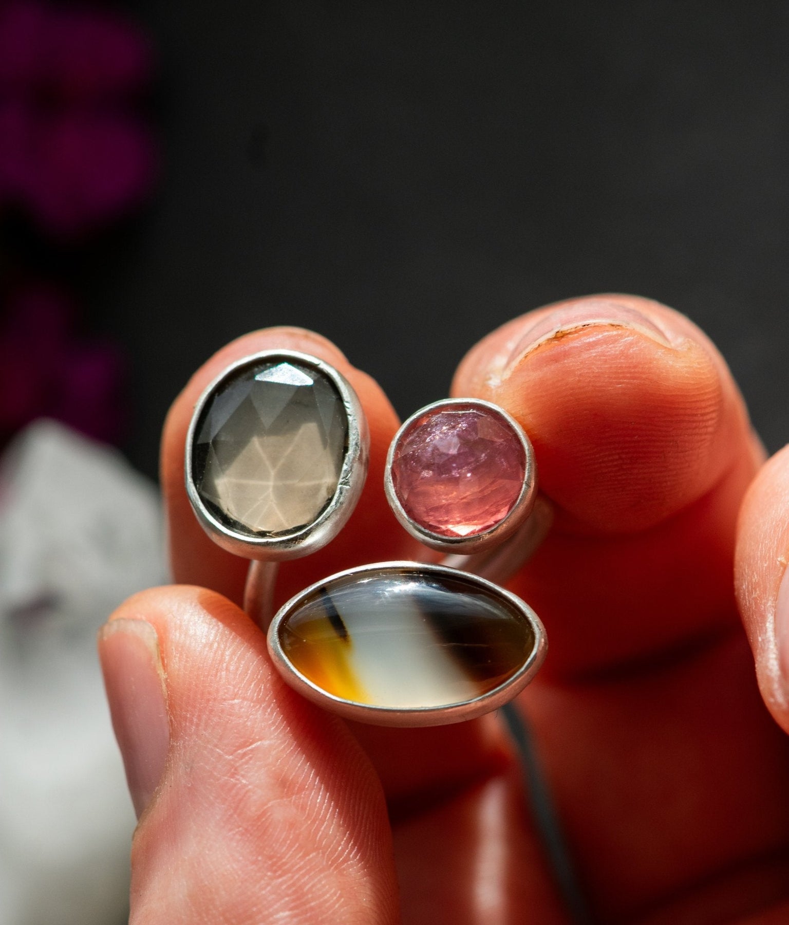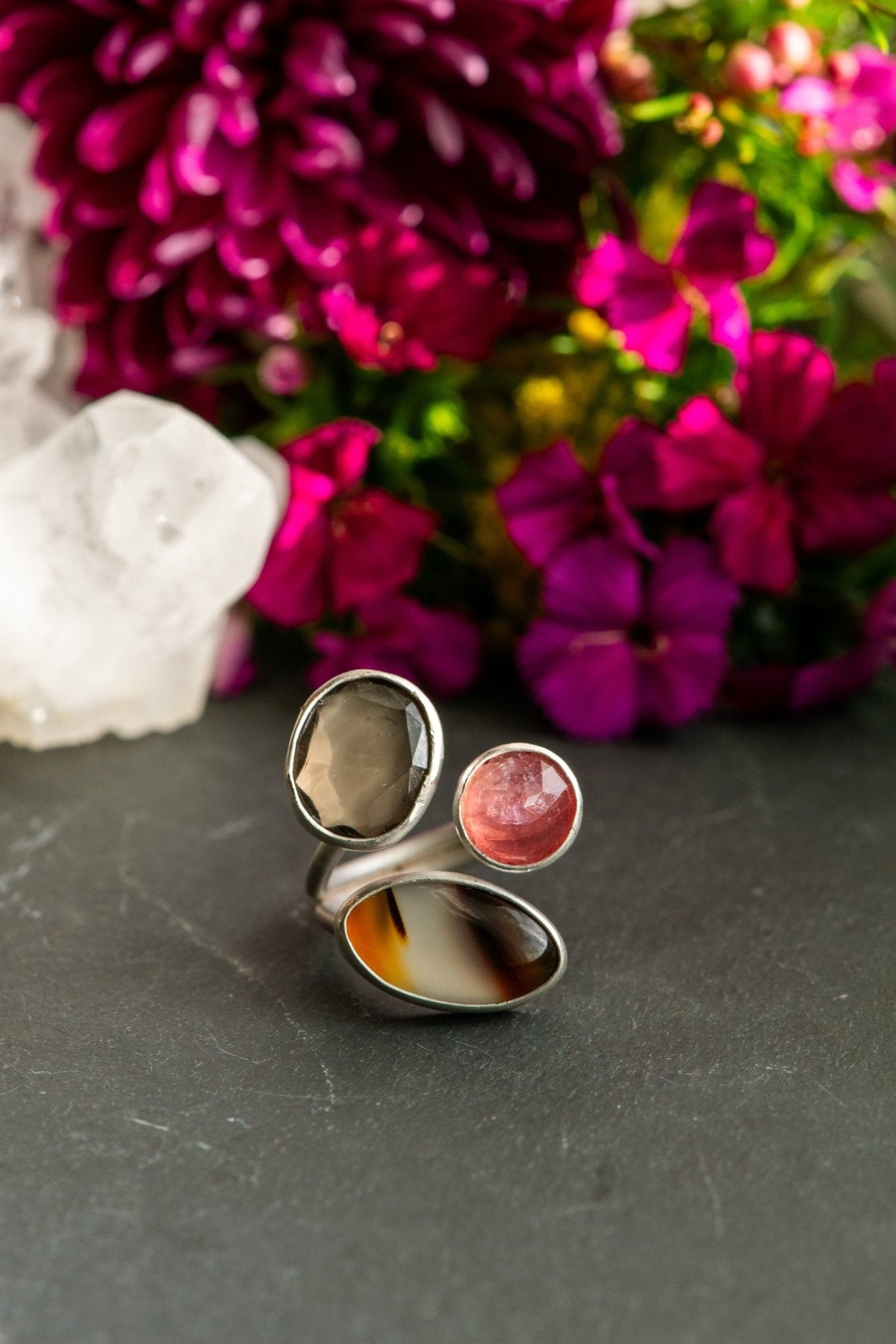 Calming Montana agate, glowing ember tourmaline, peaceful smoky quartz