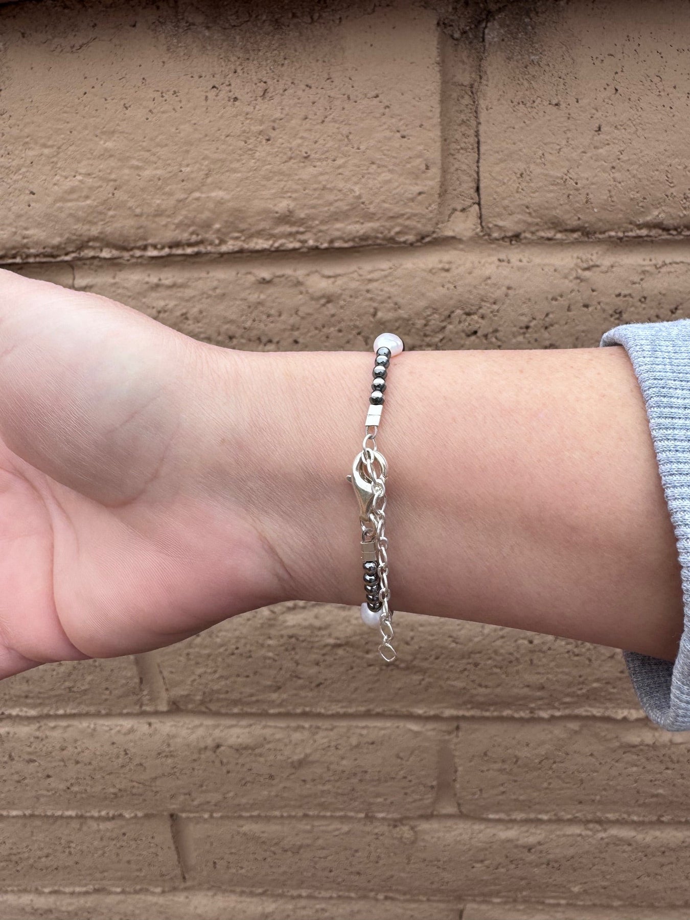 Beautiful Handcrafted Mother of Pearl & Sterling Silver Pearl Bracelet. Measures 6 1/2 inches long with an additional 2 inch extender. Sterling silver Pearls measure 3-12mm. Stamped Sterling on the clasp. Such a beautiful piece!