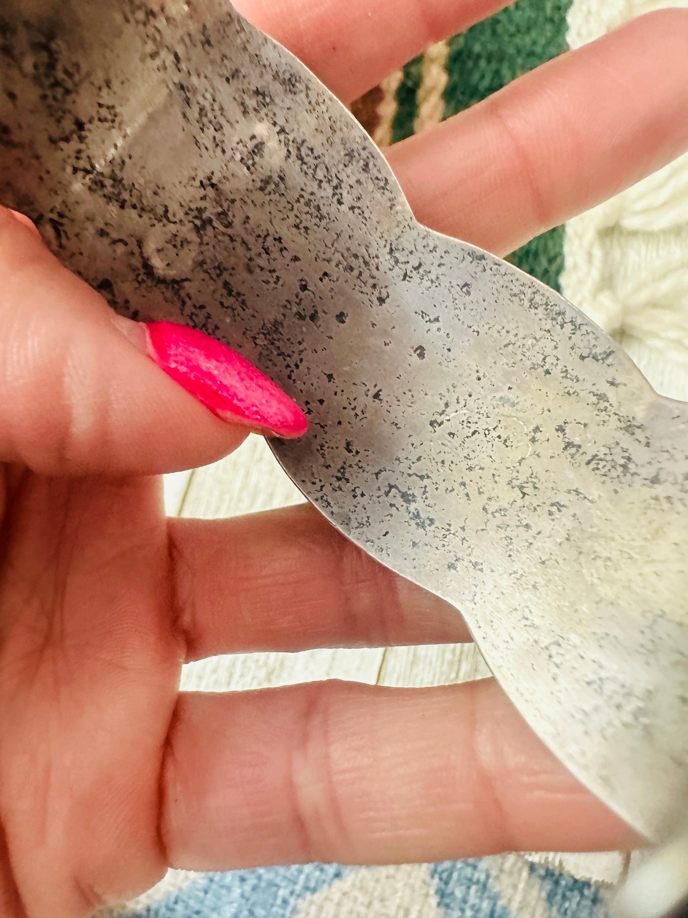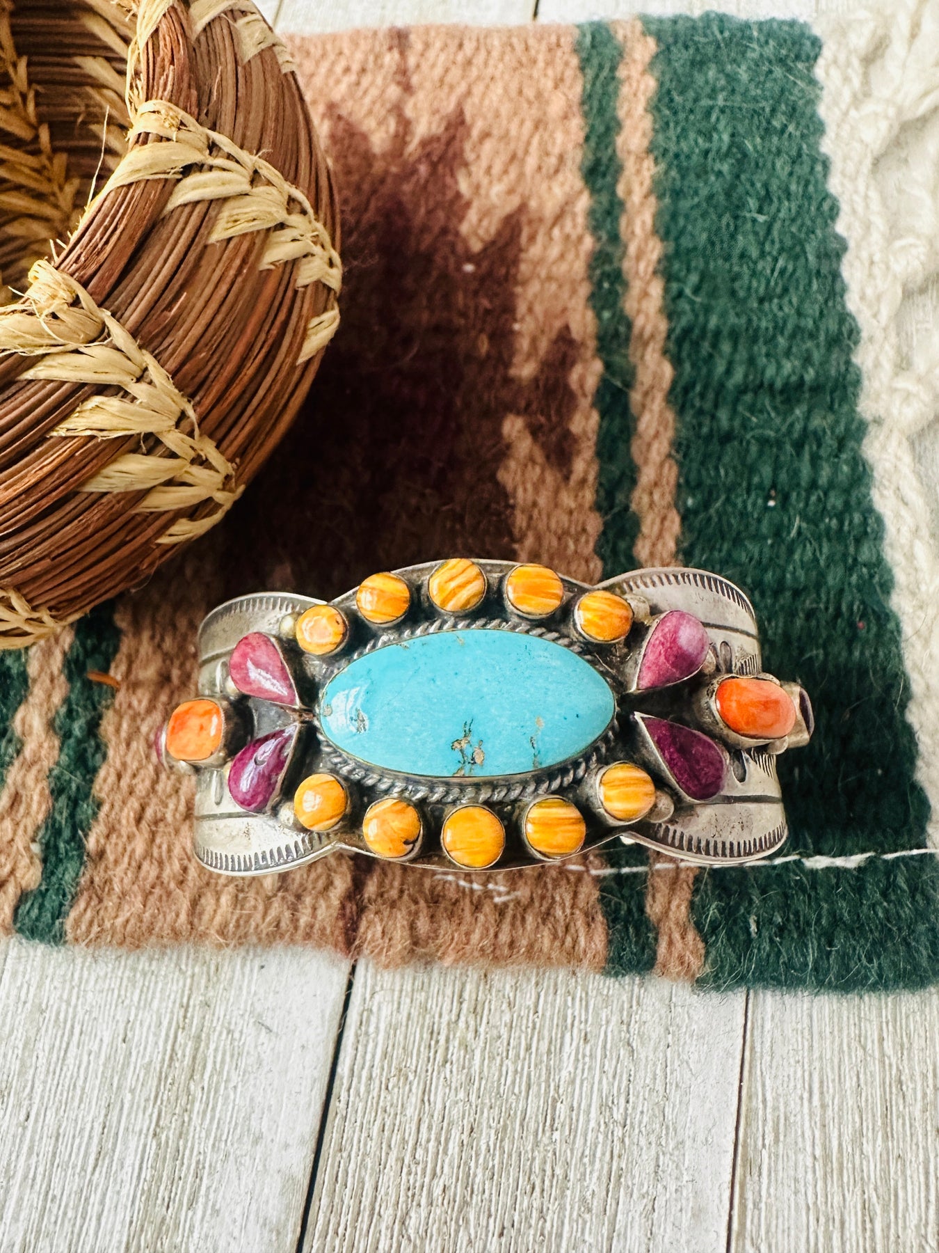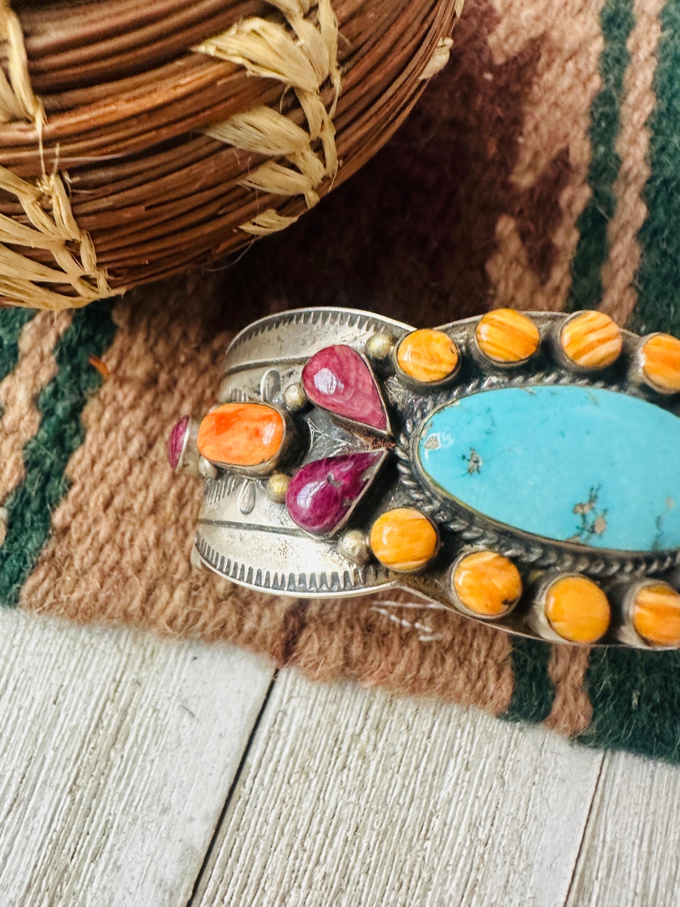 Gorgeous Old Pawn handcrafted Sterling Silver, Spiny Oyster Shell and Turquoise Cuff Bracelet. Such beautiful craftsmanship on this cuff! Cuff has an inside circumference of 5 1/4 inches with an 1 3/8 inch gap. Width is 1 1/4 inches. Stamped Sterling and signed by the artist.