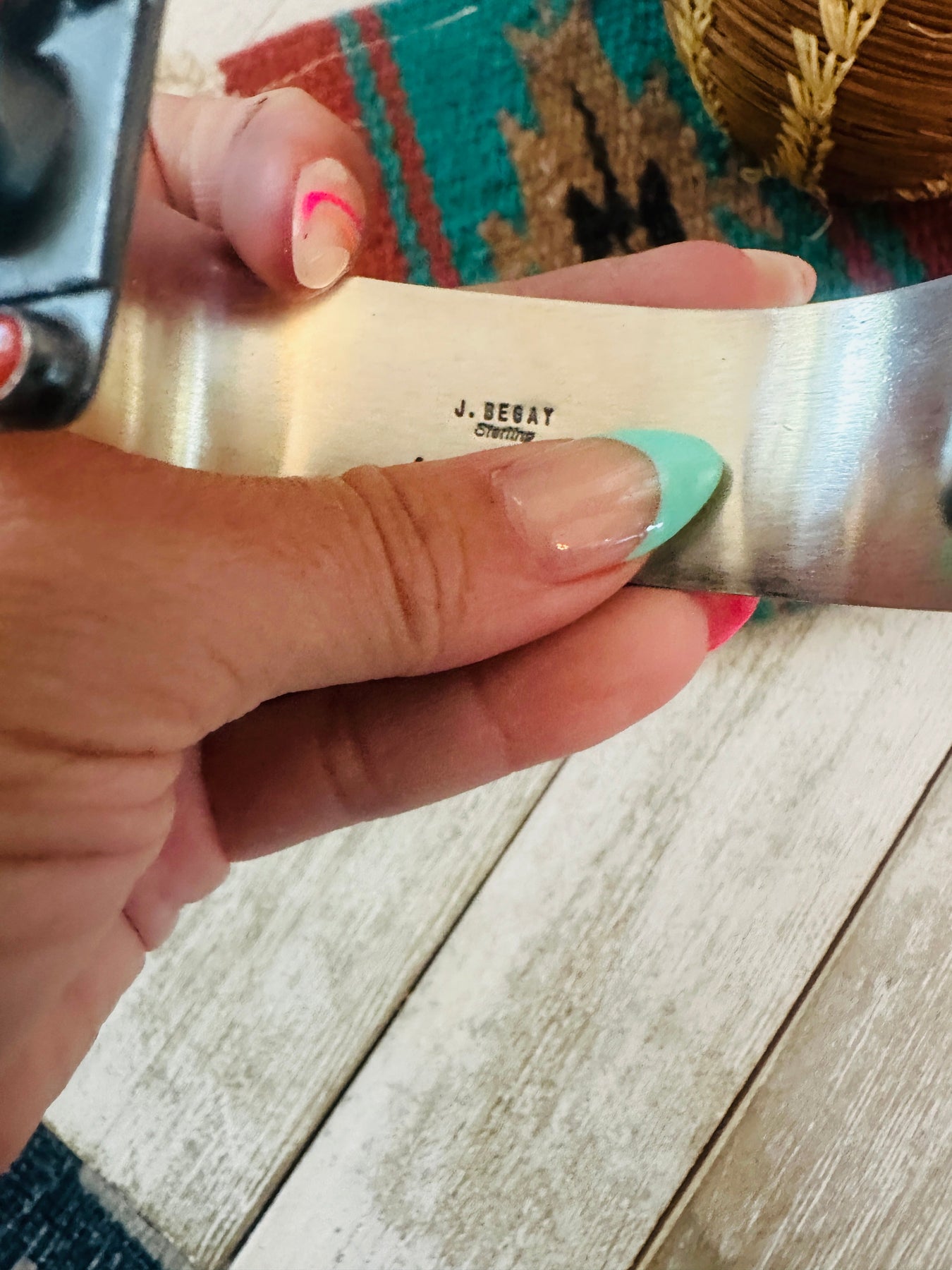 Amazing handcrafted Sterling Silver, Turquoise and Coral Cuff Bracelet. Such beautiful craftsmanship! Cuff has an inside circumference of 5 3/4 inches with a 1 3/8 inch gap. Width is 1 1/8 inches. Signed by the artist J. Begay and stamped Sterling.