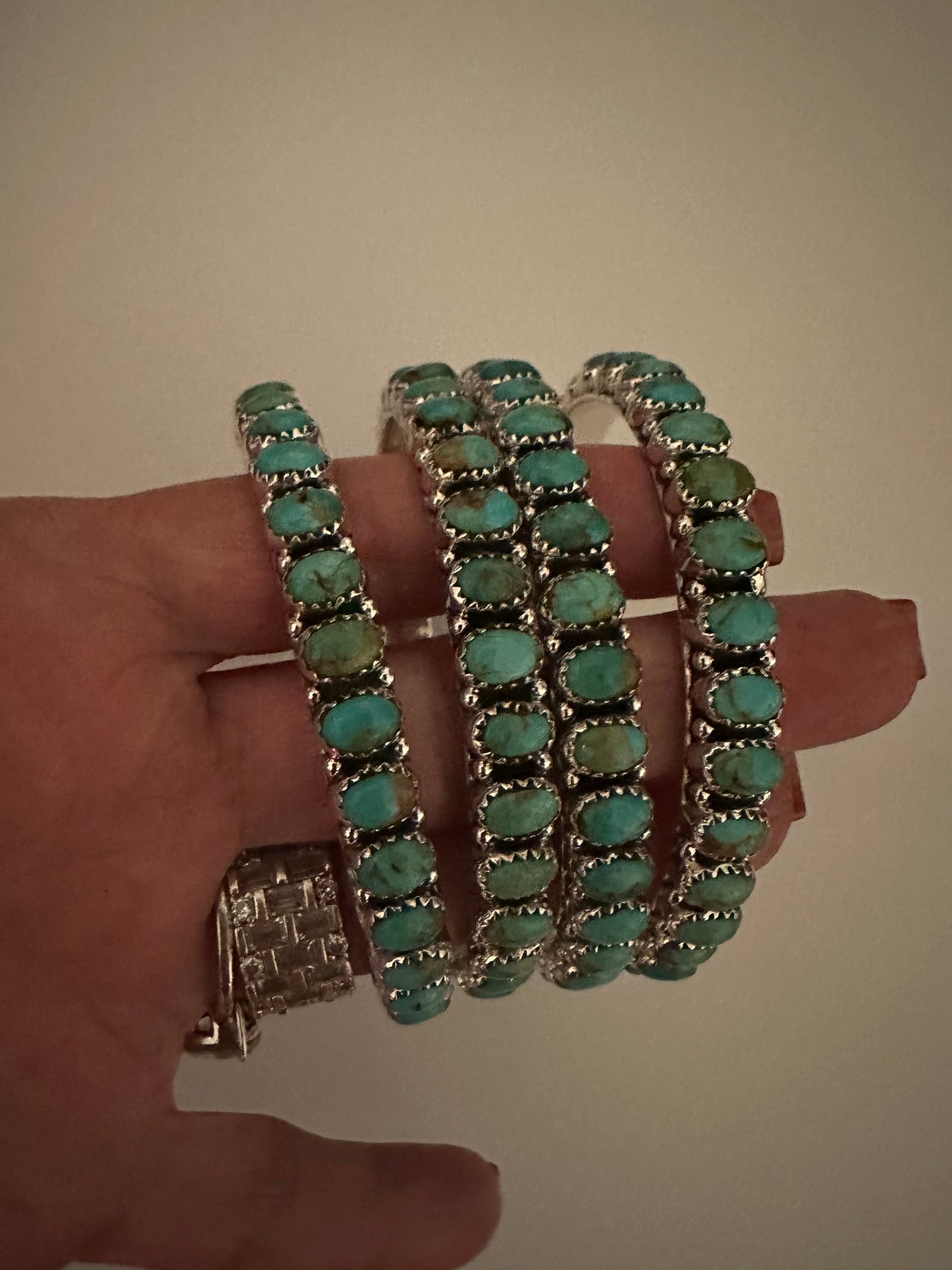 Gorgeous Handmade Turquoise and Sterling Silver Bangle Bracelet. Beautiful craftsmanship! Bangle measures 7.5 inches around. Width is 3/8 of an inch. Stamped Sterling and Nizhoni. Such a pretty piece! Listing is for one bangle.