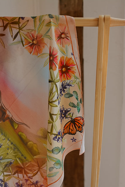 Inspired by western heritage and designed in Oregon, this western silk scarf blends wild west spirit with effortless style. Made from a soft and luxurious silk and tencel blend, it’s ultra-vibrant, lightweight, and flowy — the perfect cowgirl accessory for year-round wear. Tie it around your neck, in your hair, or on your bag for a pop of western charm.