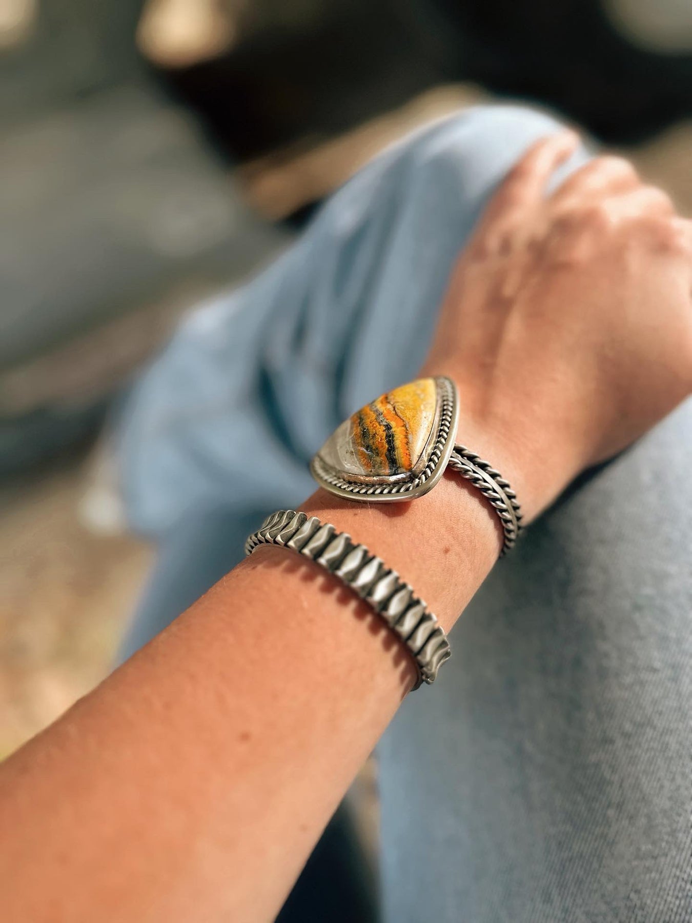 Sterling Silver Adjustable Cuff Bracelet. Gorgeous silver work on this cuff. Great by itself or layered with your favorites. Cuff has an inside circumference of 6 1/2 inches with a 1 inch gap. Width is 1/2 inch.