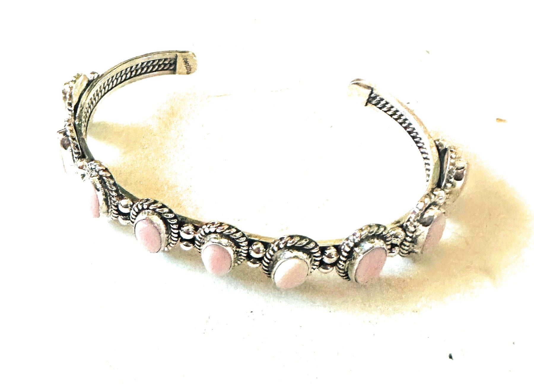 Beautiful Navajo Sterling Silver and Queen Pink Conch Shell Cuff Bracelet. Such a pretty bracelet! Cuff has an inside circumference of 5 1/4 inches with a 1 1/4 inch gap. Width is 5/8 of an inch. Stamped Sterling.
