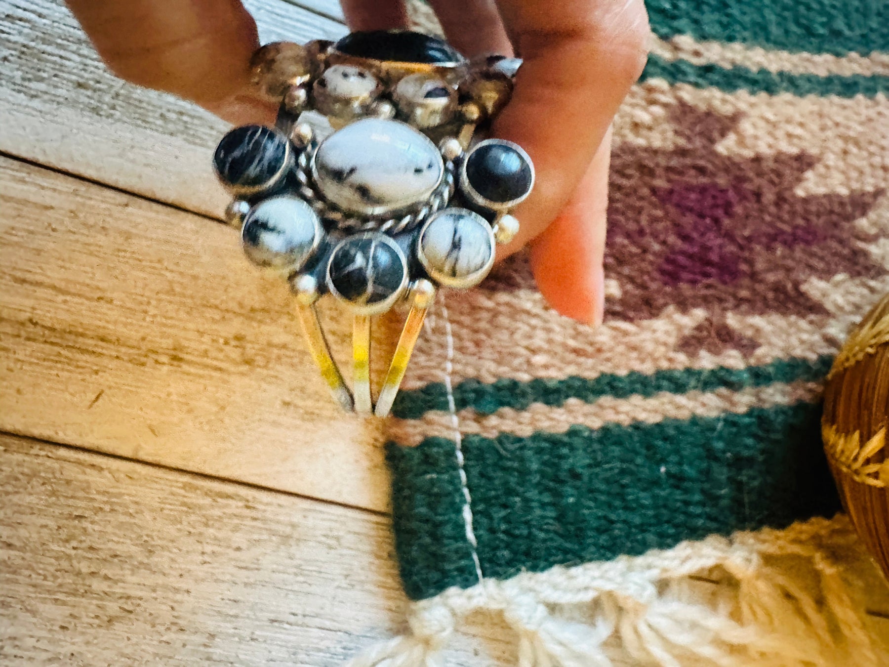 Gorgeous Navajo White Buffalo & Sterling Silver Cuff Bracelet. Such pretty stones in this cuff! Inside circumference measures 5 1/4 inches with a 1 1/4 inch gap. Width is 1 5/8 inches. Stamped Sterling and signed by the artist.