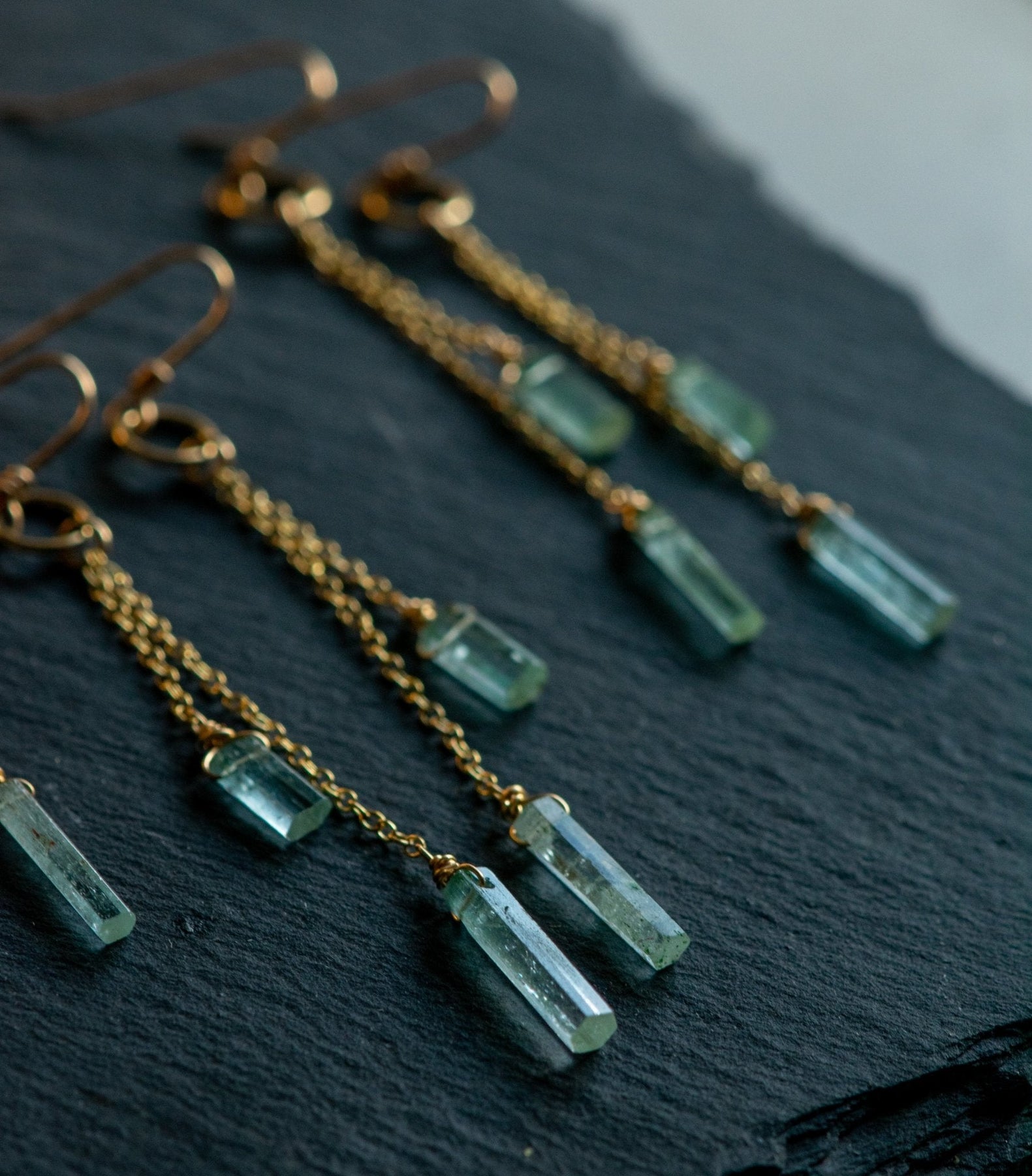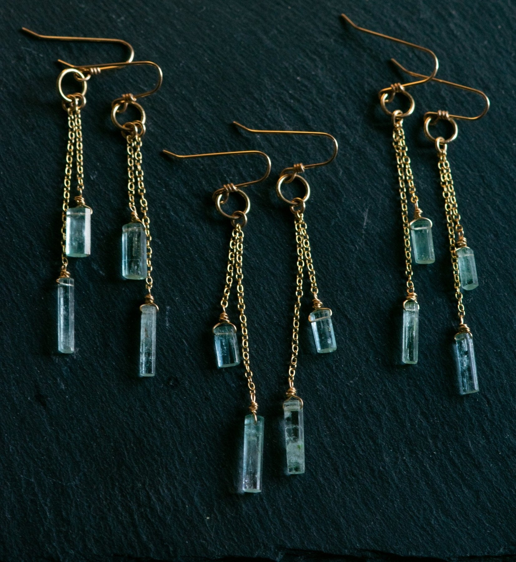 Yep I'm very infatuated with aquamarine in columnar form. I went a little nuts. But that's okay because these were made. Two pieces of aquamarine suspended on 14/20 gold-fill chain and earwires. Each pair is a little different than the others because of the nature of raw natural stone, but each pair is approximately 3 inches in length.