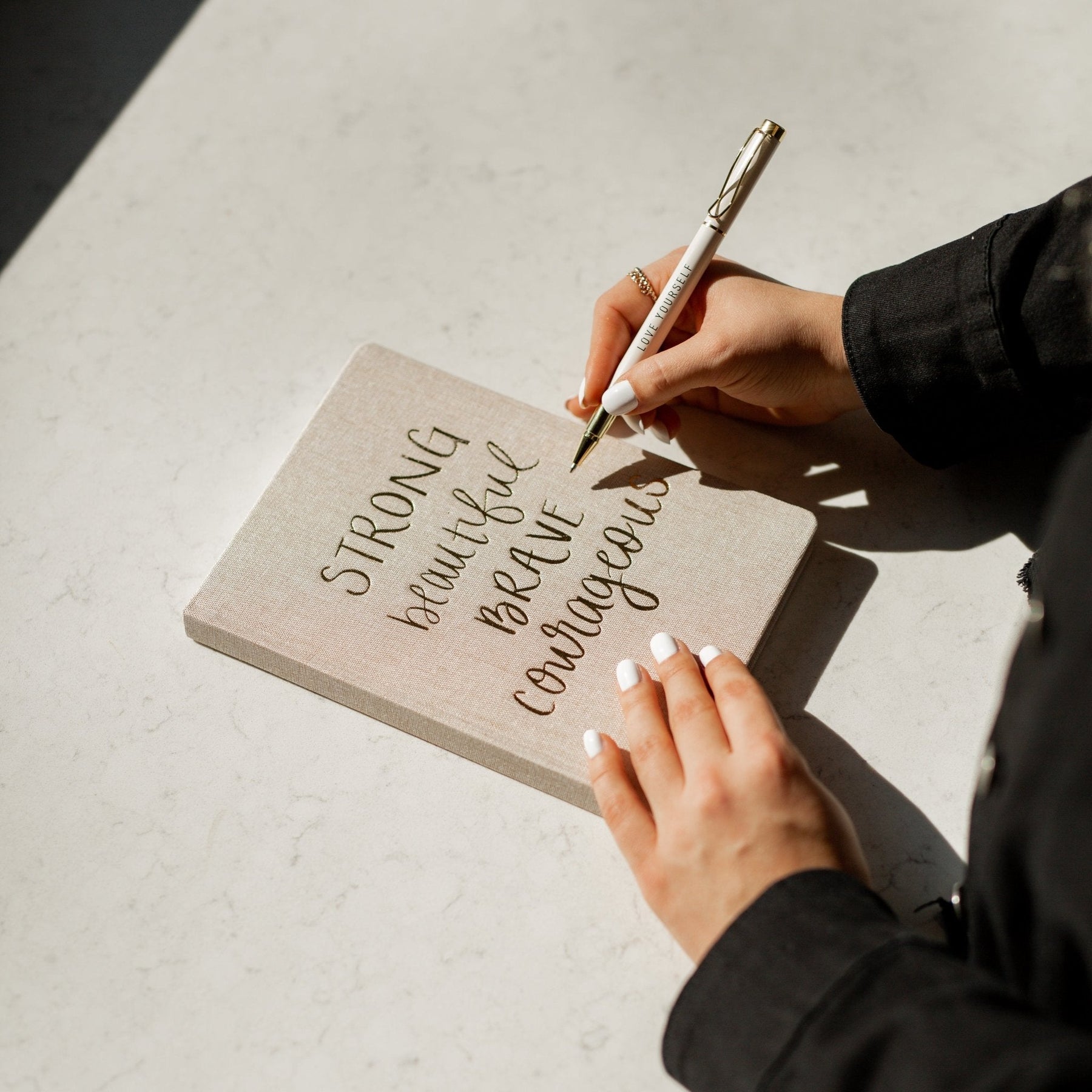 Write down all of your goals and dreams in our hand lettered Strong Beautiful Brave Courageous, Tan and Gold Fabric Journal! With this chic, stylish, easy to write on notebook, there's no better place to jot down motivational notes, inspirational quotes, lists, and all of your great ideas! Perfect for work or school. This desk/office accessory makes a great gift!