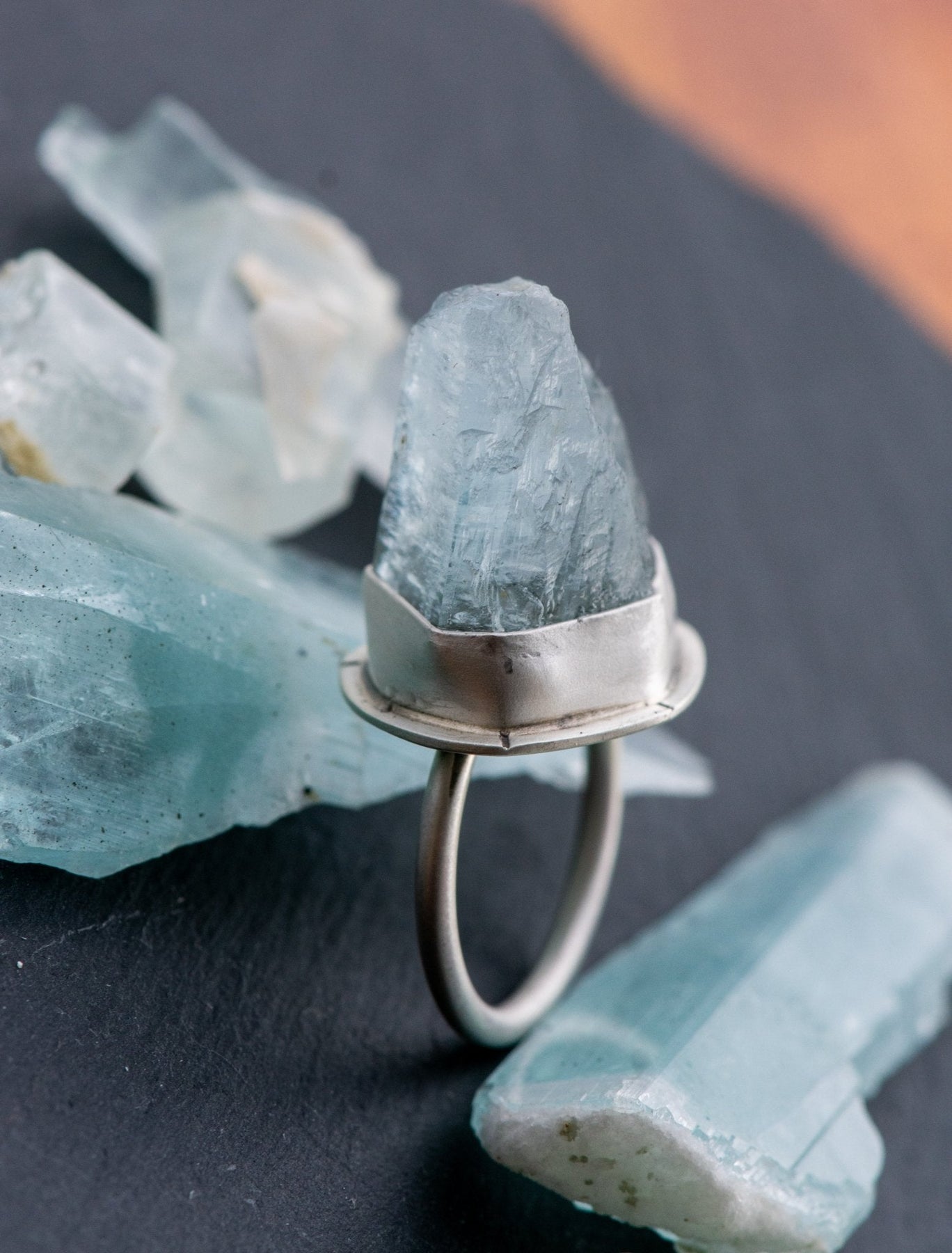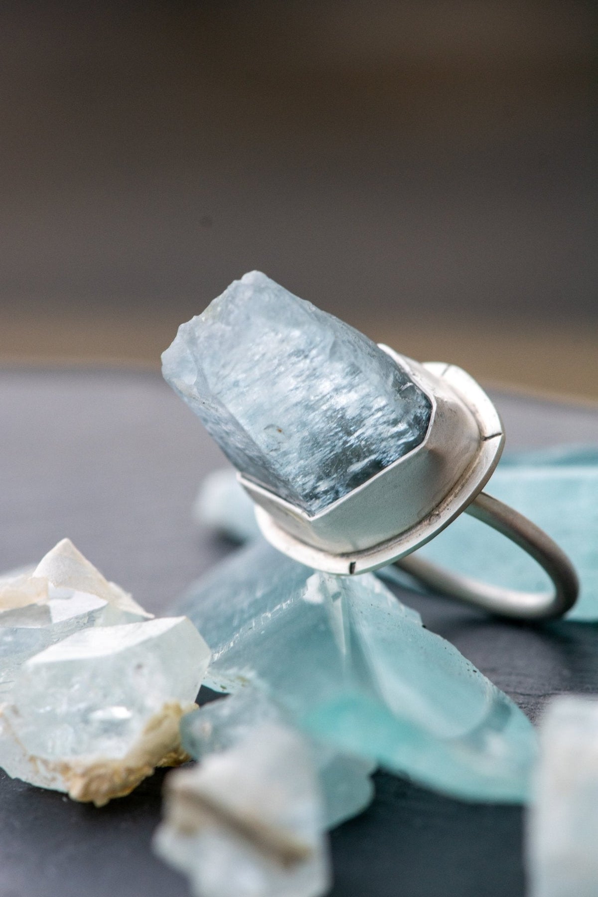 I know there is a level of impracticality in the wearability of this ring. This aquamarine is massive. But it is so cool. One side has been polished to a smooth finish. The other side is raw aquamarine crystal. Watching the light enter from different sides is an epiphany I would recommend. Maybe not an everyday ring, but a ring for thinking big thoughts.