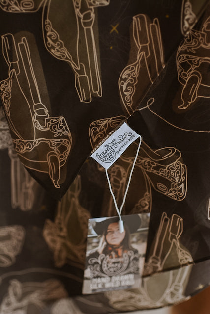 Inspired by western heritage and designed in Oregon, this western silk scarf blends wild west spirit with effortless style. Made from a soft and luxurious silk and tencel blend, it’s ultra-vibrant, lightweight, and flowy — the perfect cowgirl accessory for year-round wear. Tie it around your neck, in your hair, or on your bag for a pop of western charm.