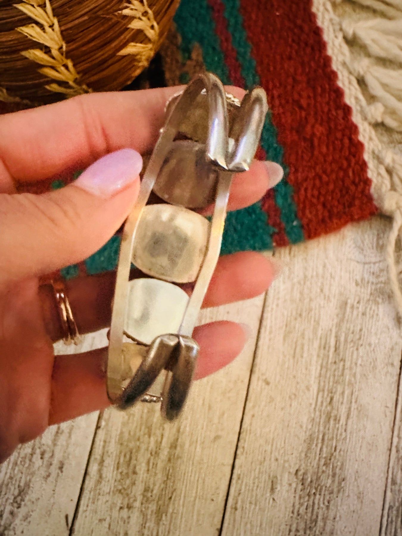 Amazing handcrafted Sterling Silver and Dyed Green Kingman Turquoise Cuff Bracelet. Such beautiful craftsmanship! Cuff has an inside circumference of 5 3/4 inches with a 7/8 of an inch gap. Width is 1 inch. Signed by the artist and stamped Sterling.