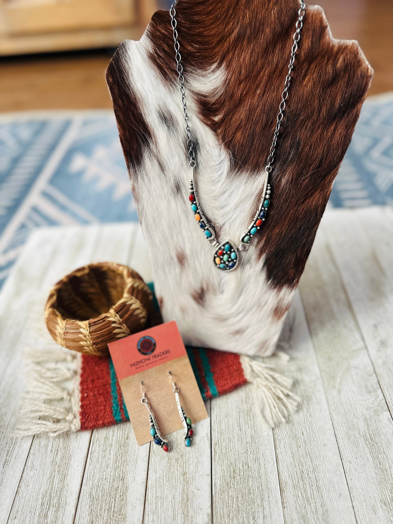 Beautiful Handcrafted Multi Stone and Sterling Silver Necklace and Earrings Set. Necklace measures 20 inches long. Pendant measures an additional 1 1/4 inches long. Matching earrings measure 1 3/8 inches long and 1/4 of an inch wide. Signed by the artist and stamped Sterling. Such a gorgeous set!