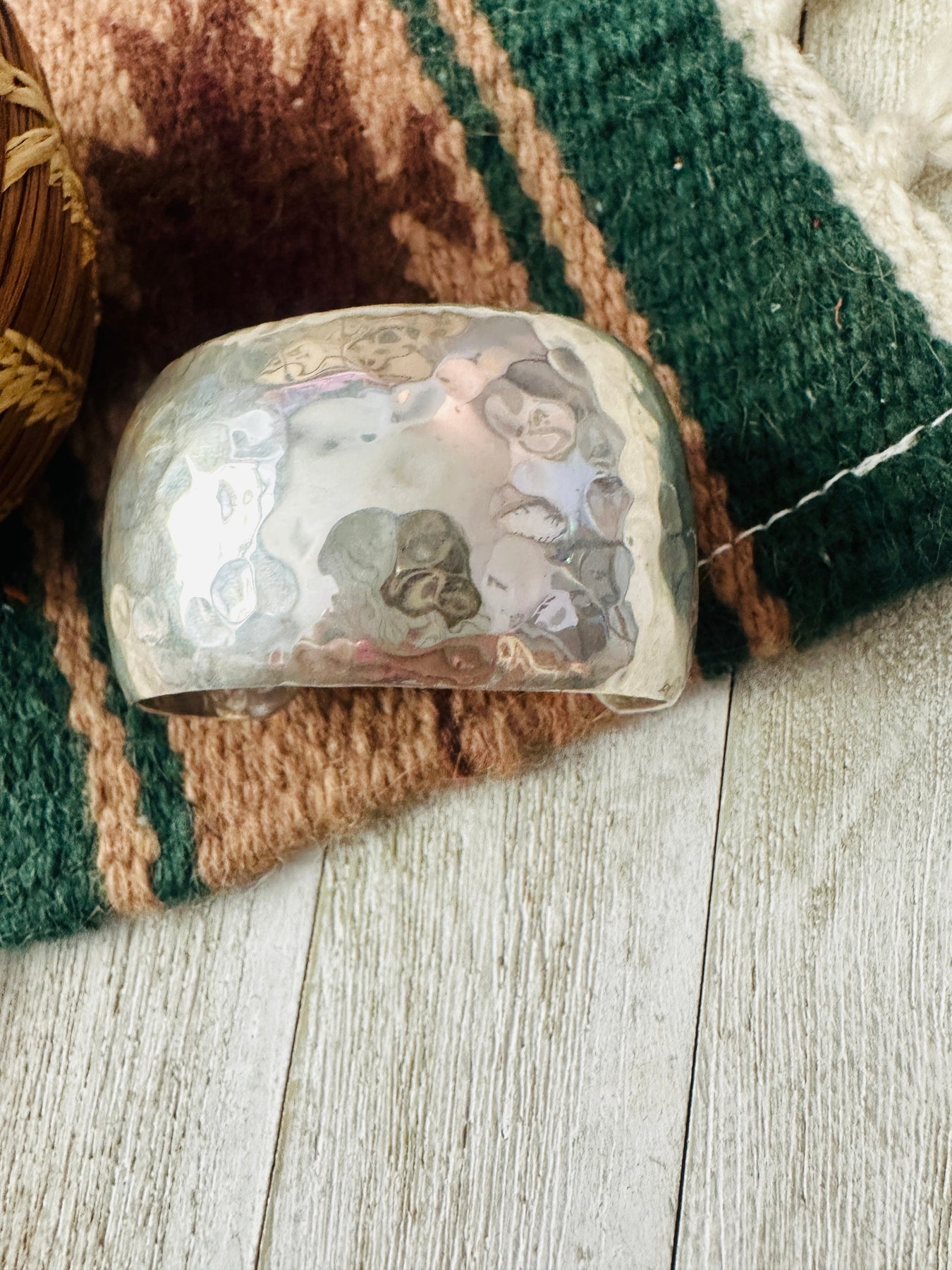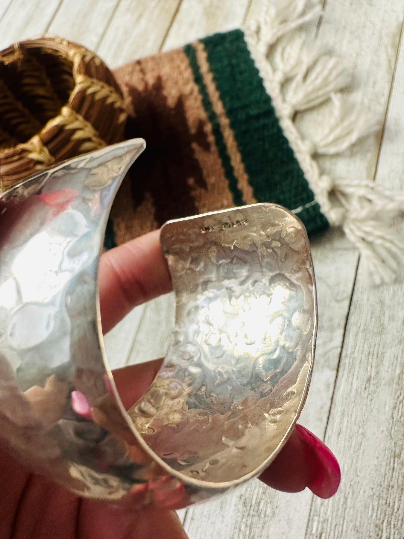 Gorgeous Old Pawn handcrafted Hammered Sterling Silver Cuff Bracelet. Such beautiful craftsmanship on this cuff! Cuff has an inside circumference of 5 1/2 inches with an 1 1/2 inch gap. Width is 1 1/2 inches. Stamped Sterling and signed by the artist.