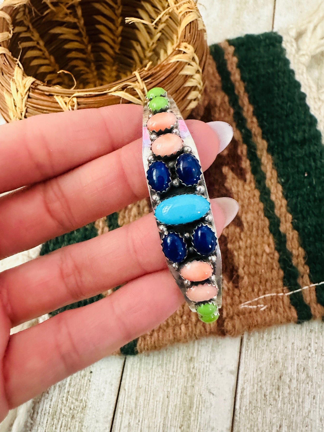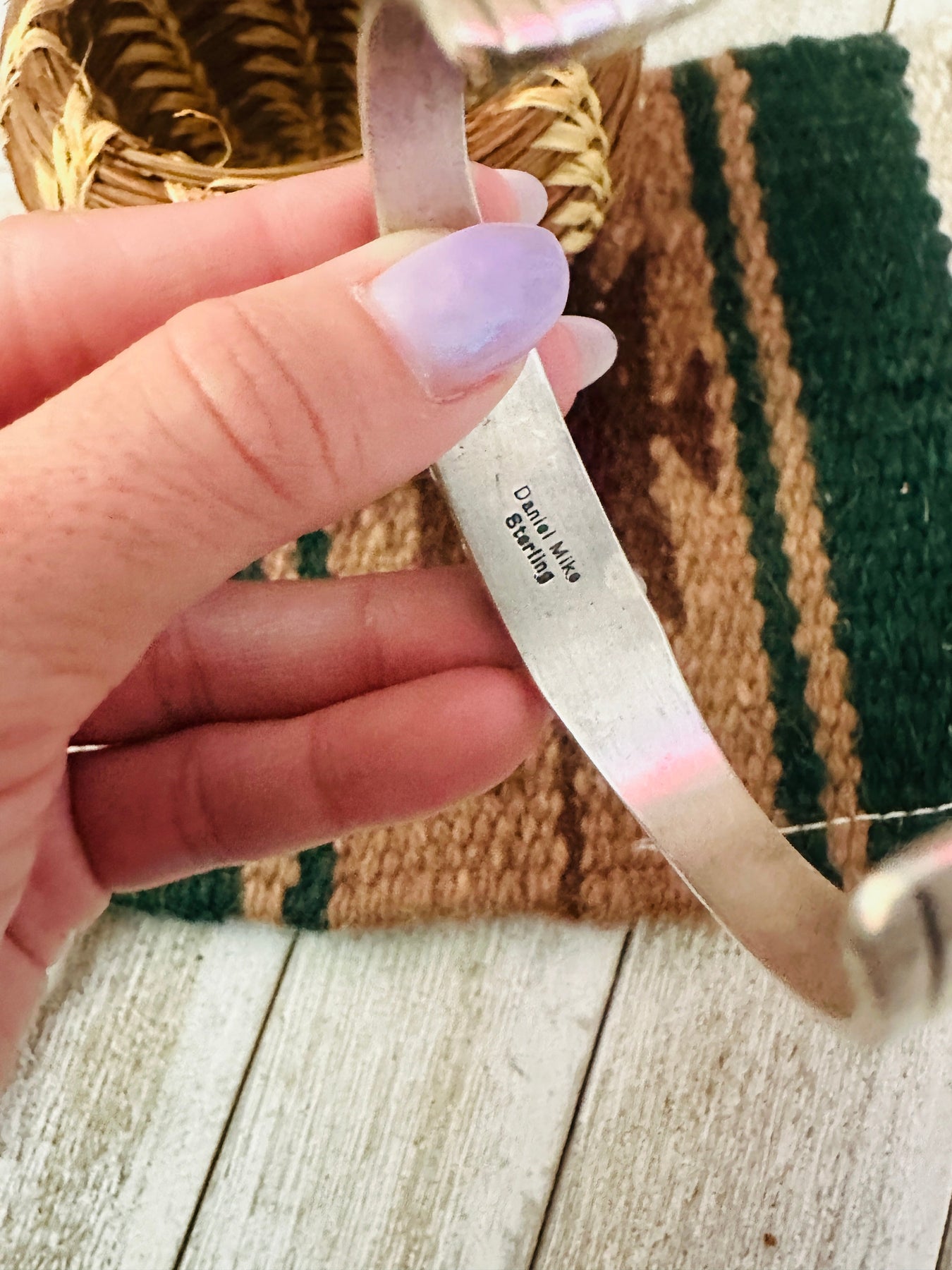 Gorgeous Old Pawn Sterling Silver and Multi Stone Cuff Bracelet. Such beautiful craftsmanship on this cuff! Cuff has an inside circumference of 5 1/2 inches with a 1 1/4 inch gap. Width is 1/2 of an inch. Signed by the artist Daniel Mike and stamped Sterling.
