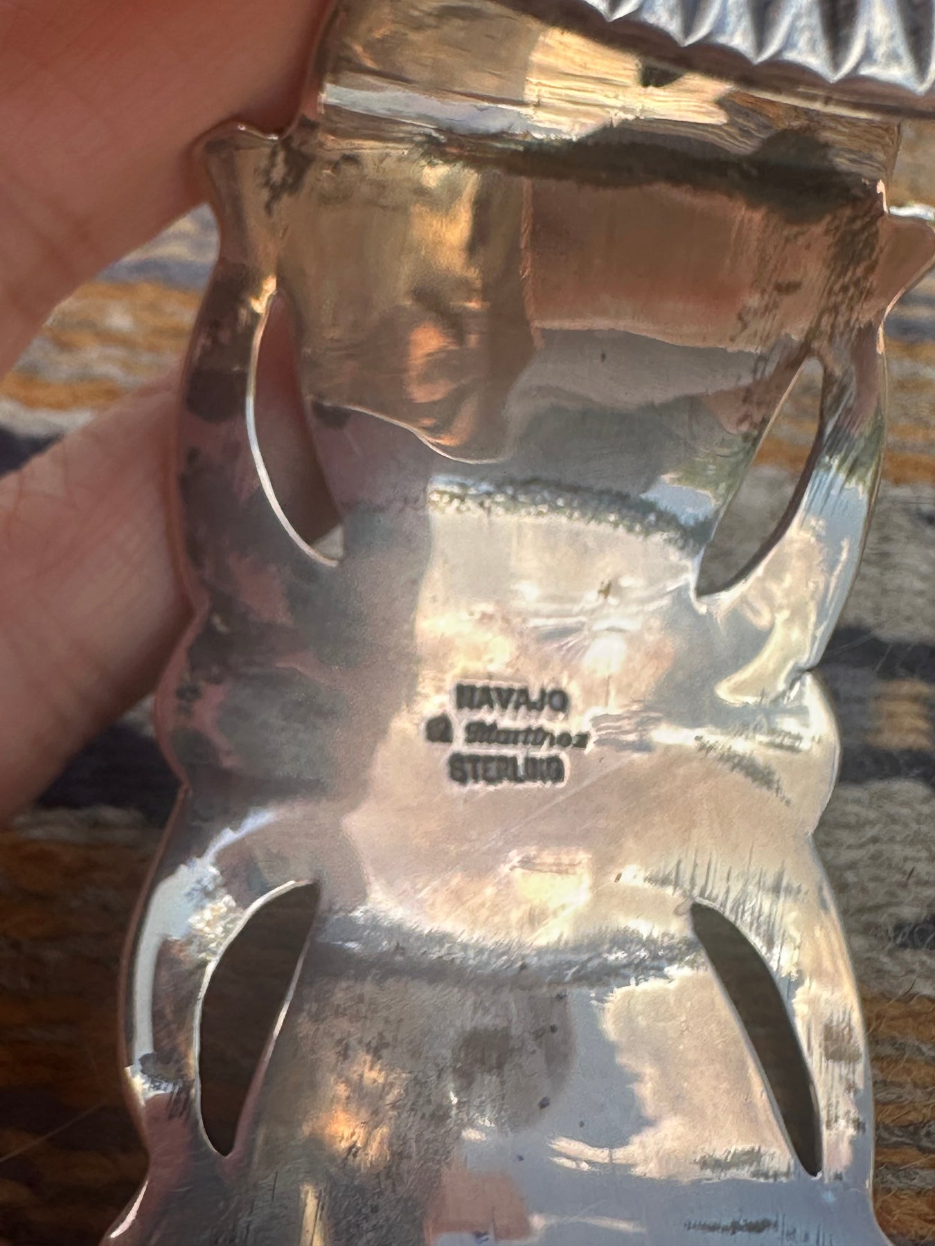Here is a fabulous old pawn sterling cuff boasting a classic piece Kingman turquoise and exquisite Silver work. The width is 1-1/2 inches and the inside measures 5-1/2 inches + a 1-1/2 inch gap for a total inner circumference of 6-7/8 inches. It is seen in the photos fitting an 7 inch wrist well with some wiggle room. Signed by the artist Rick Martinez and is stamped Sterling. This gorgeous cuff has nice weight and a lot of life left - ready for its next adventure!