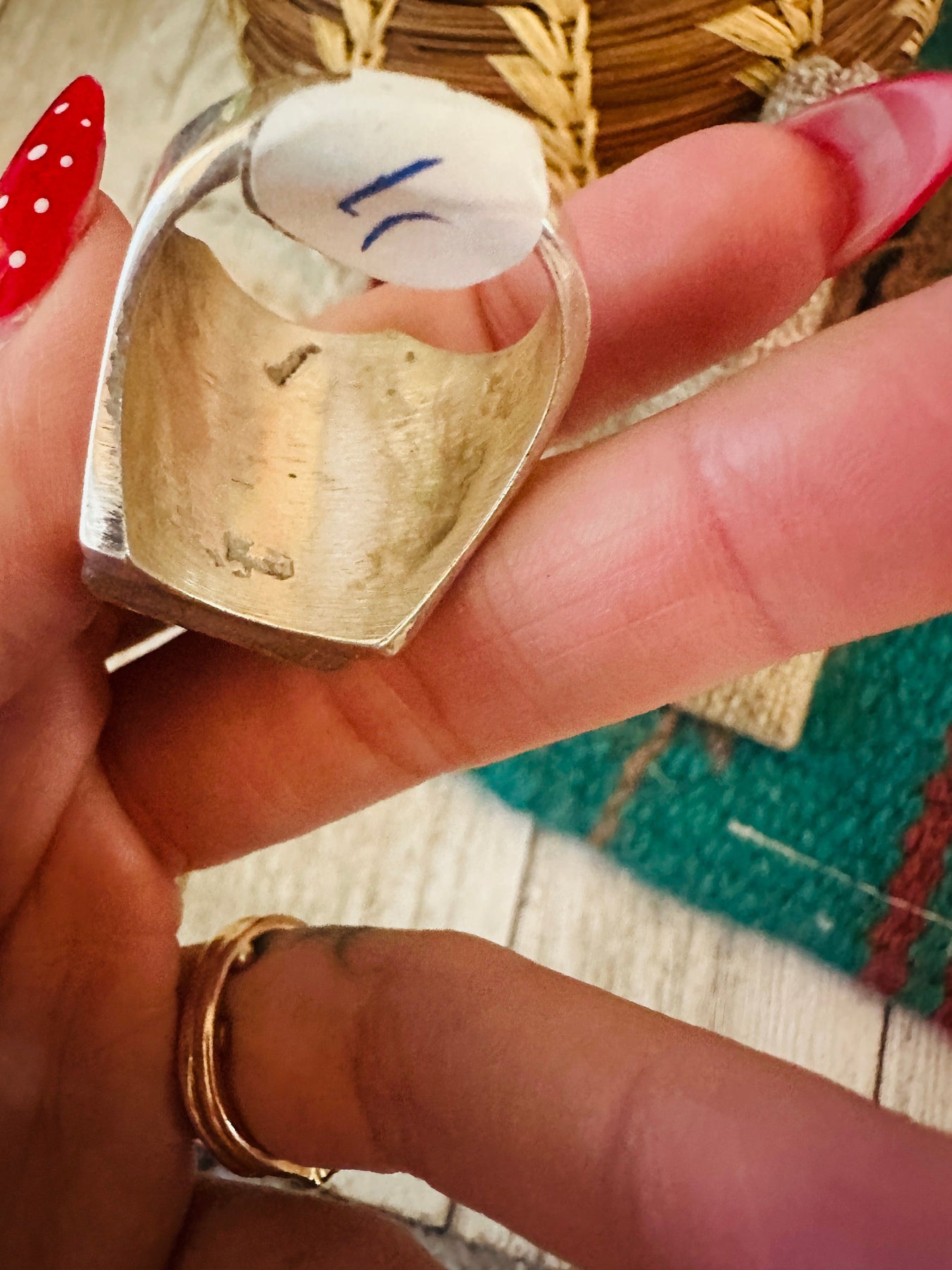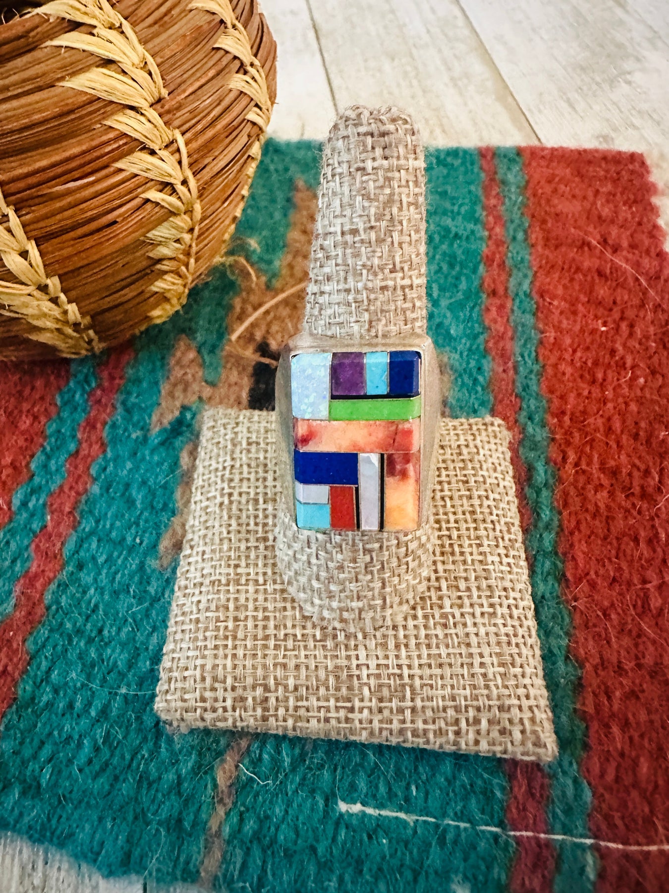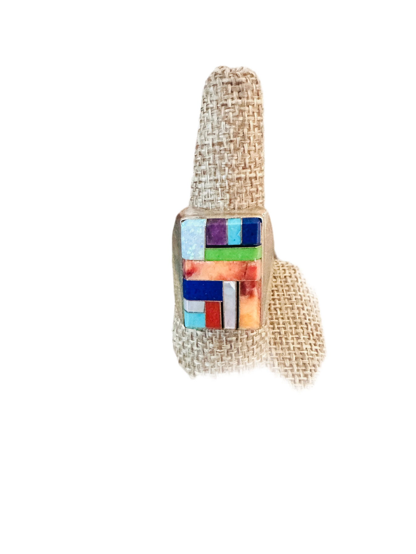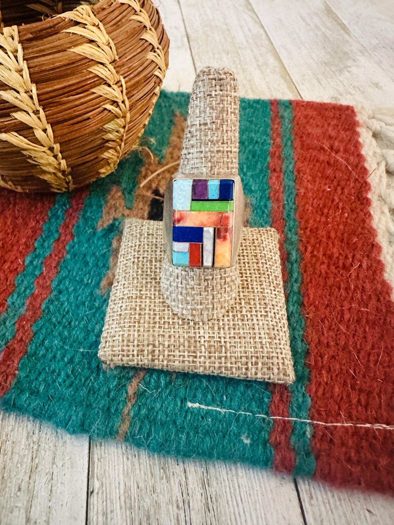 Beautiful Old Pawn handcrafted Multi Stone and Sterling Silver Inlay Ring. Size 11. Excellent vintage condition! Measures 1 inch wide. Signed by the artist and stamped Sterling. Great ring!