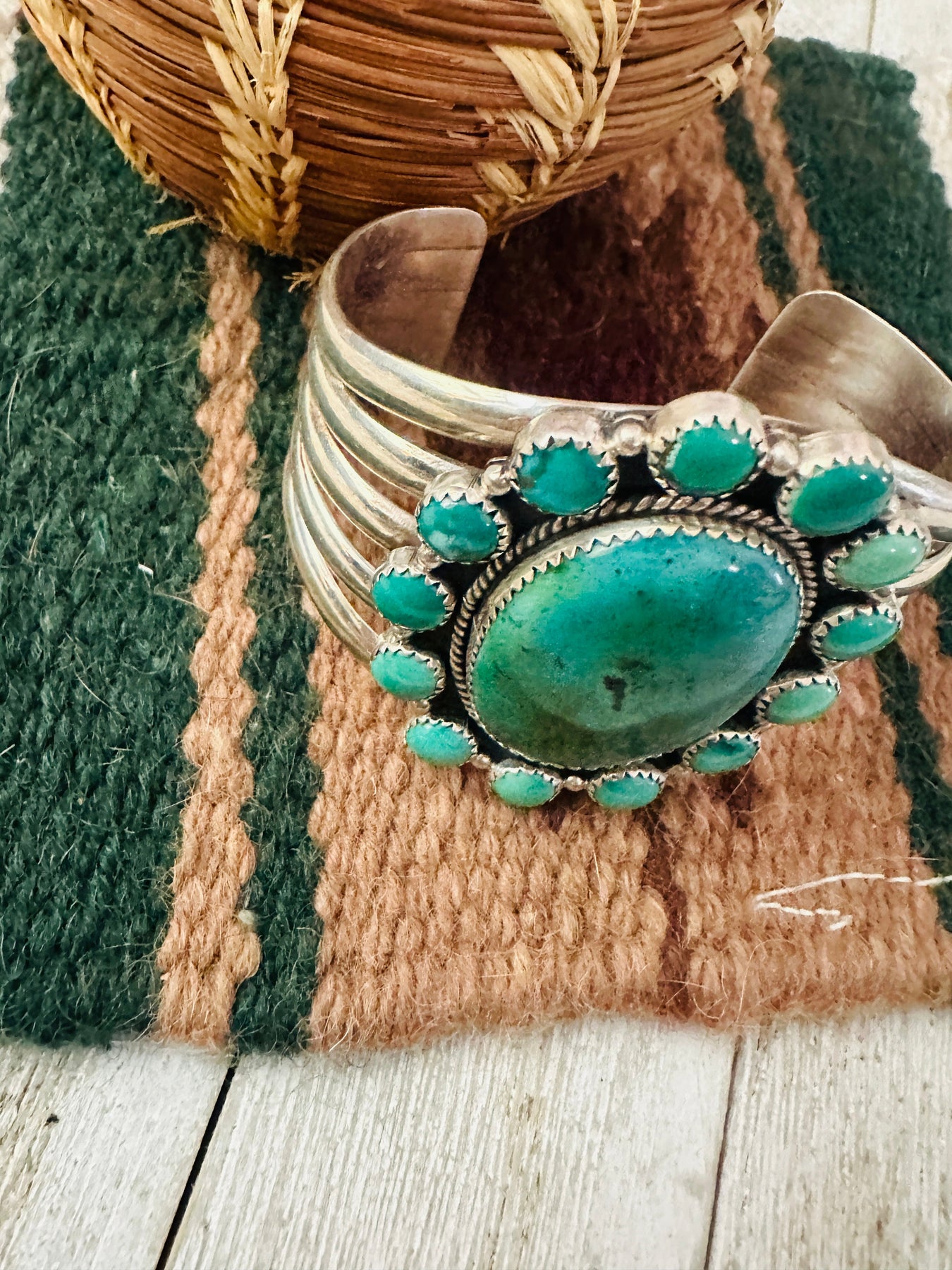 Gorgeous Old Pawn Sterling Silver and Turquoise Cluster Cuff Bracelet. Such beautiful craftsmanship on this cuff! Cuff has an inside circumference of 5 3/4 inches with an 1 1/2 inch gap. Width is 2 1/4 inches. Signed by the artist and stamped Sterling.