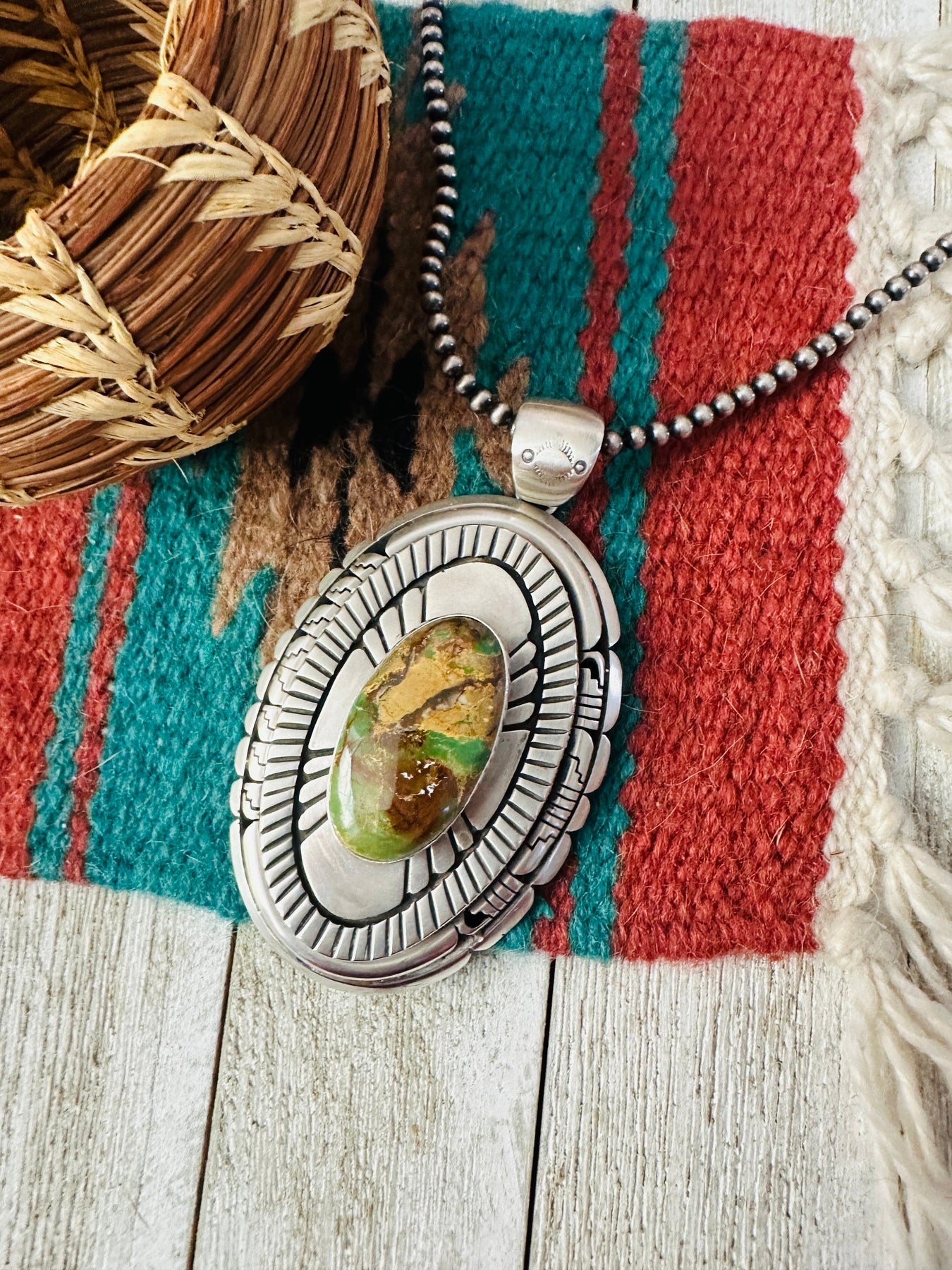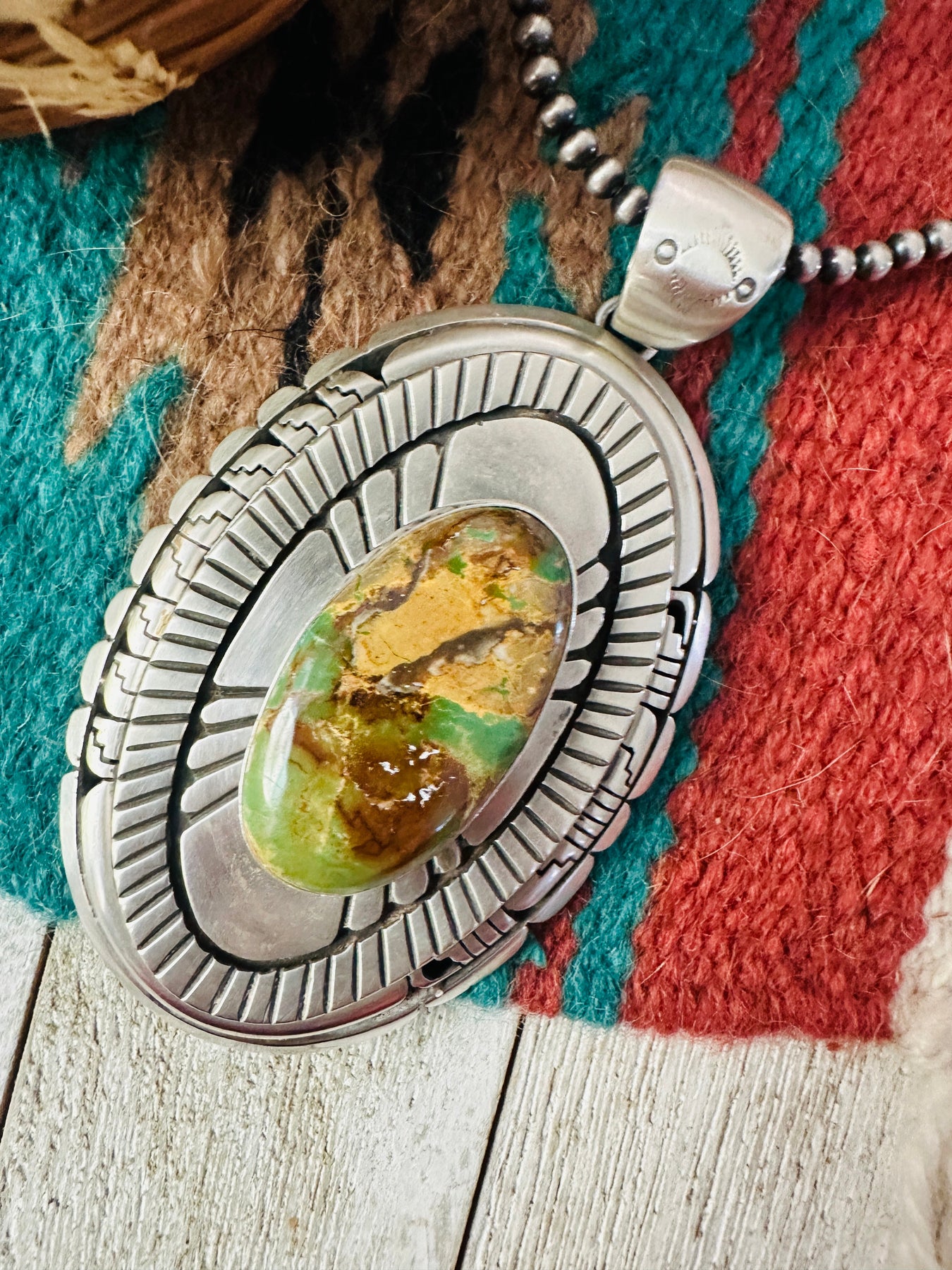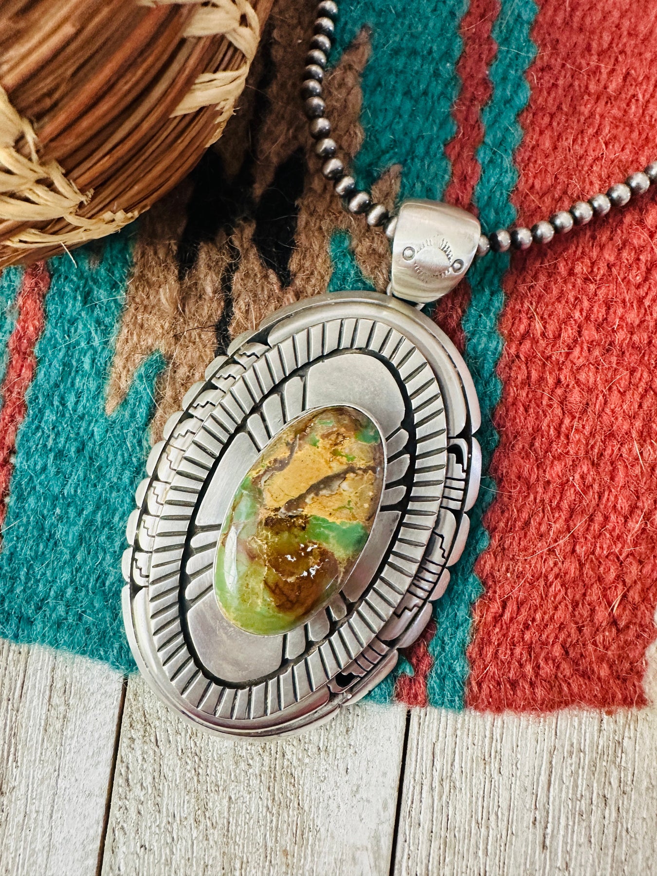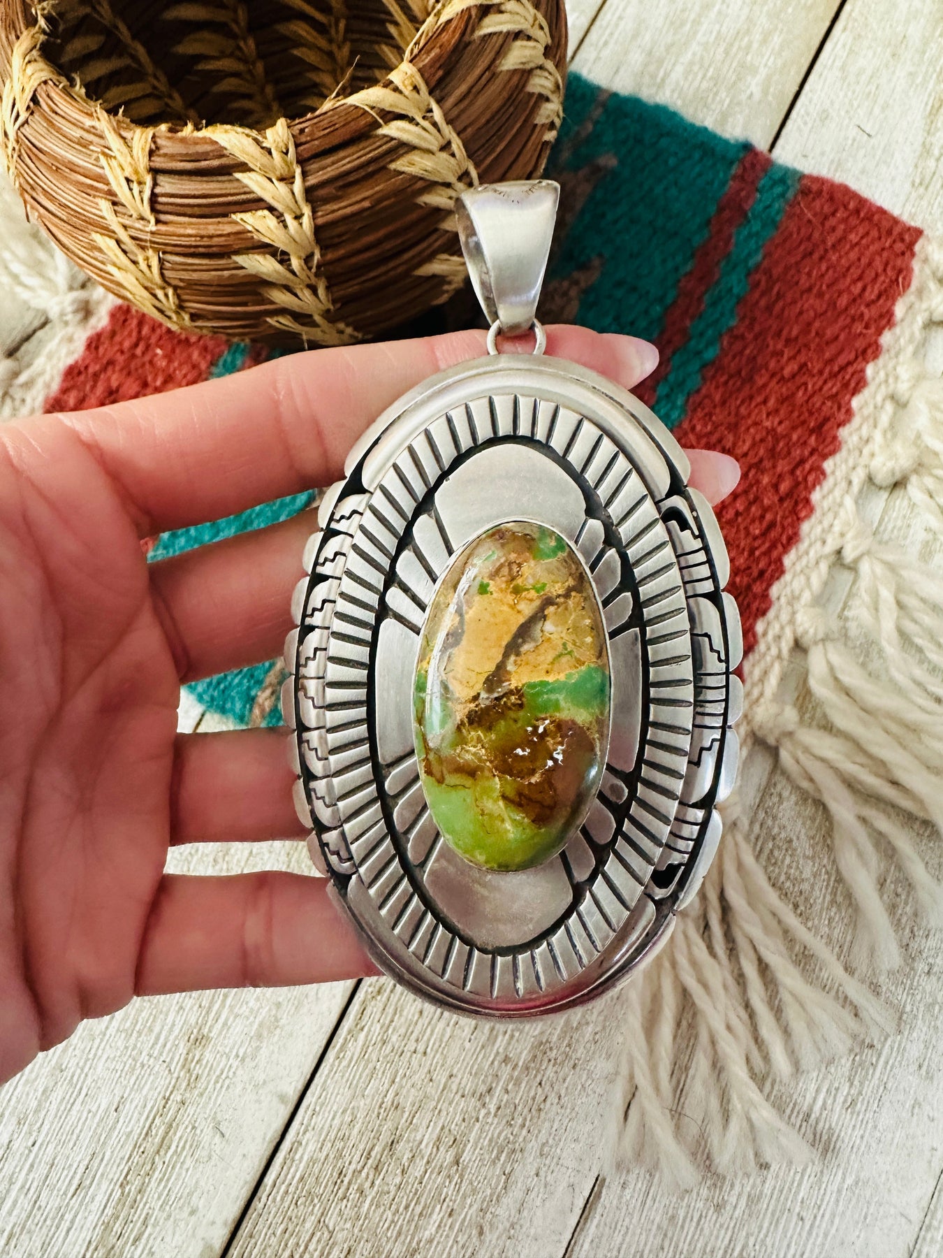 Beautiful Handcrafted Ribbon Turquoise & Sterling Silver Pendant. Such amazing craftsmanship! This pendant measures 4 1/4 inches long and 2 3/8 inches wide. Bale measures just over 1/2 of an inch across. Signed LK by the artist and stamped Sterling.