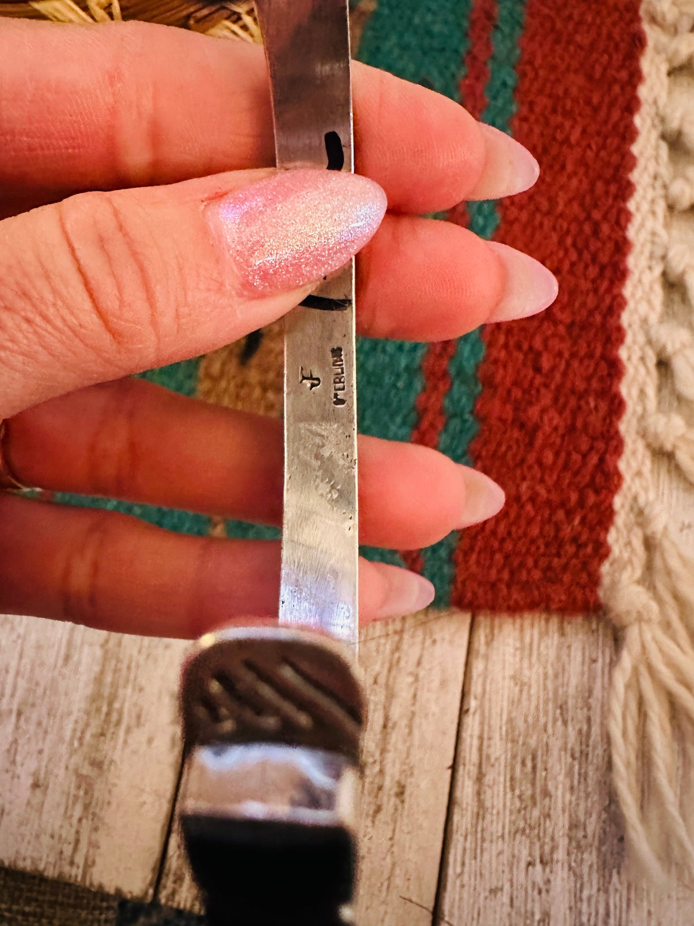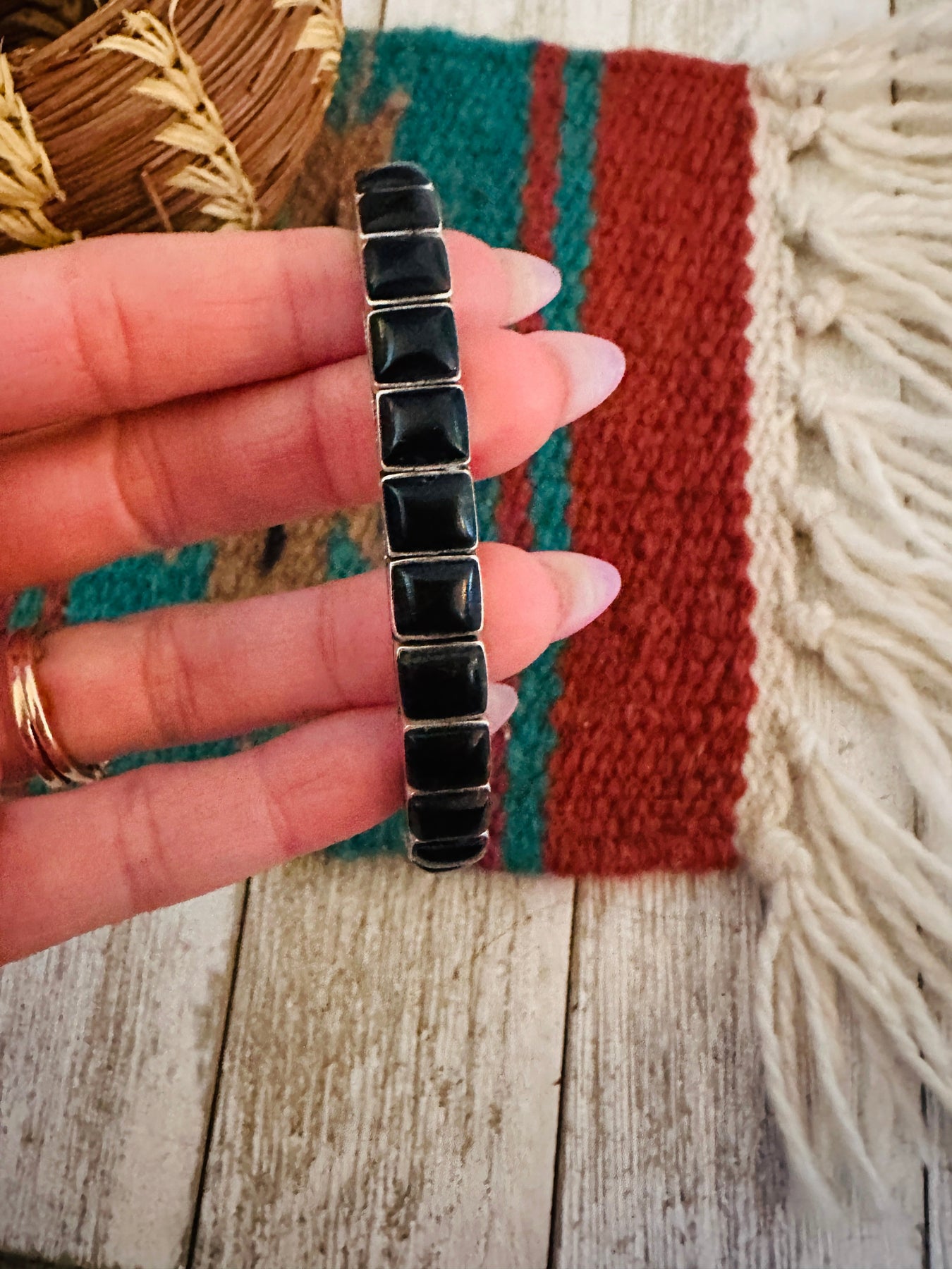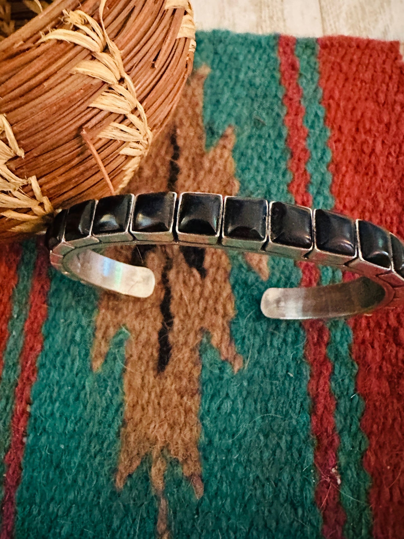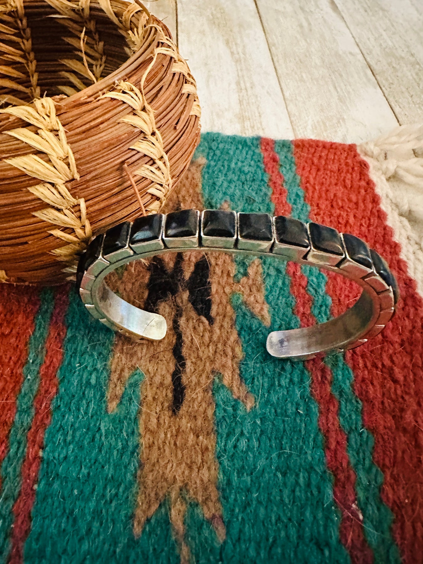 Beautiful Handcrafted Sterling Silver and Black Onyx Cuff Bracelet. This cuff has an inside circumference 5 3/4 inches with an 1 1/8 inch gap. Width is 3/8 of an inch. Stamped Sterling and signed by the artist Federico Jimenez.
