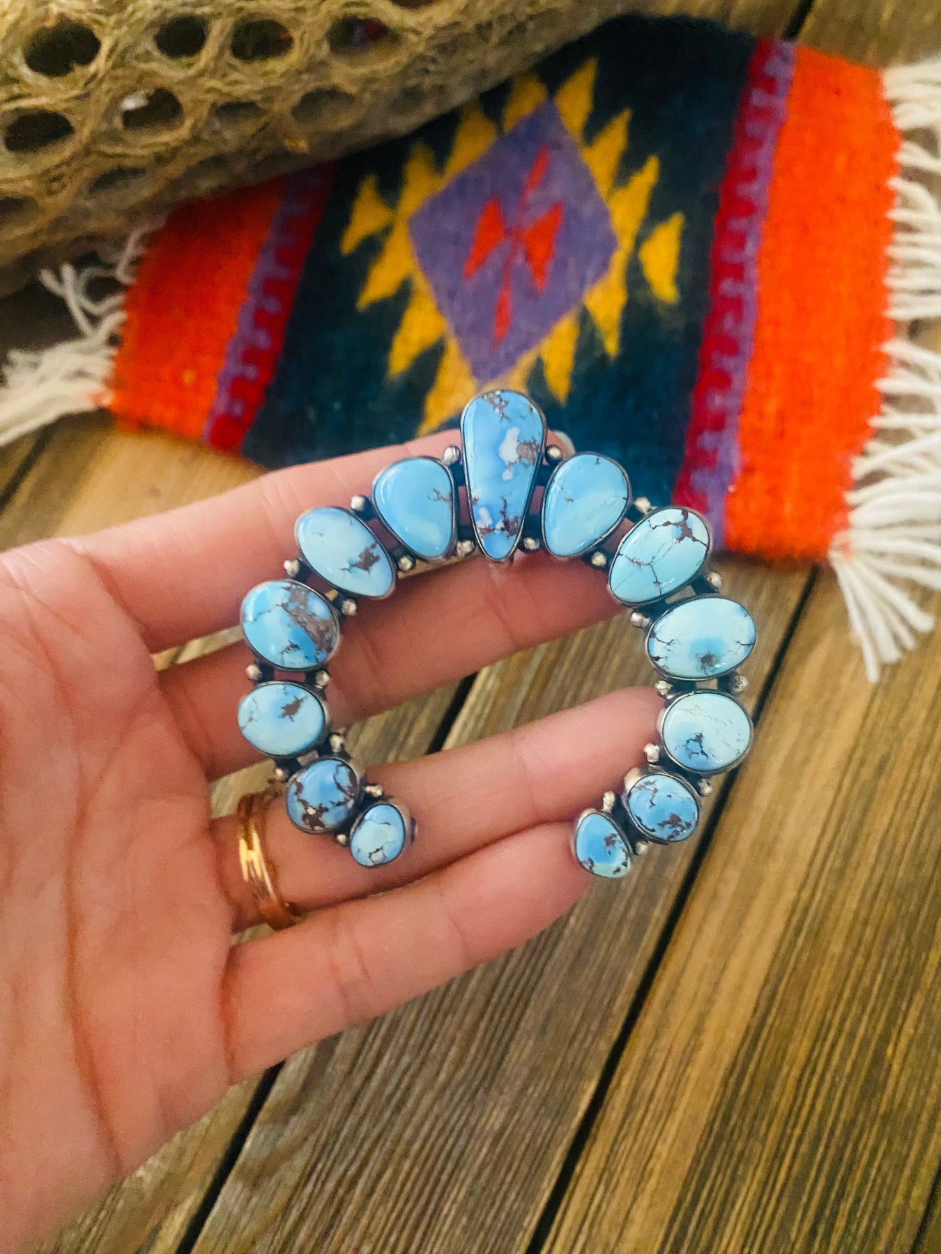 Handcrafted Golden Hills Turquoise and Sterling Silver Naja Pendant. Such beautiful stones in this piece! Measuring 2 1/2 inches long and wide. Bale measures 3/8 of an inch across. Signed by the artist Bernyse Chavez and stamped Sterling. Beads sold separately.