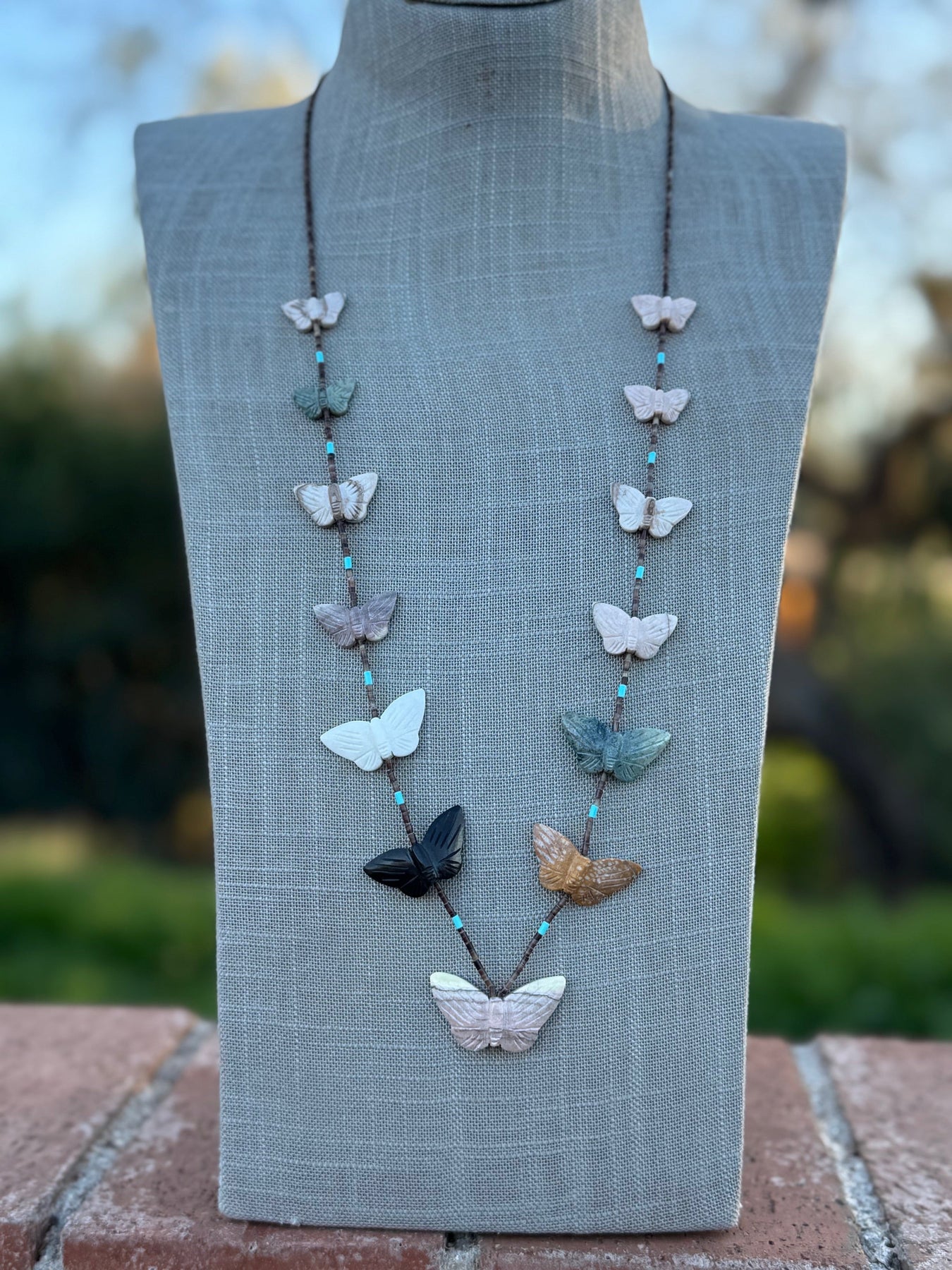 Beautiful Handcrafted Sterling Silver & Beaded Butterfly Fetish Necklace. Incredible hand carved fetish beads! Measuring 30 inches long.