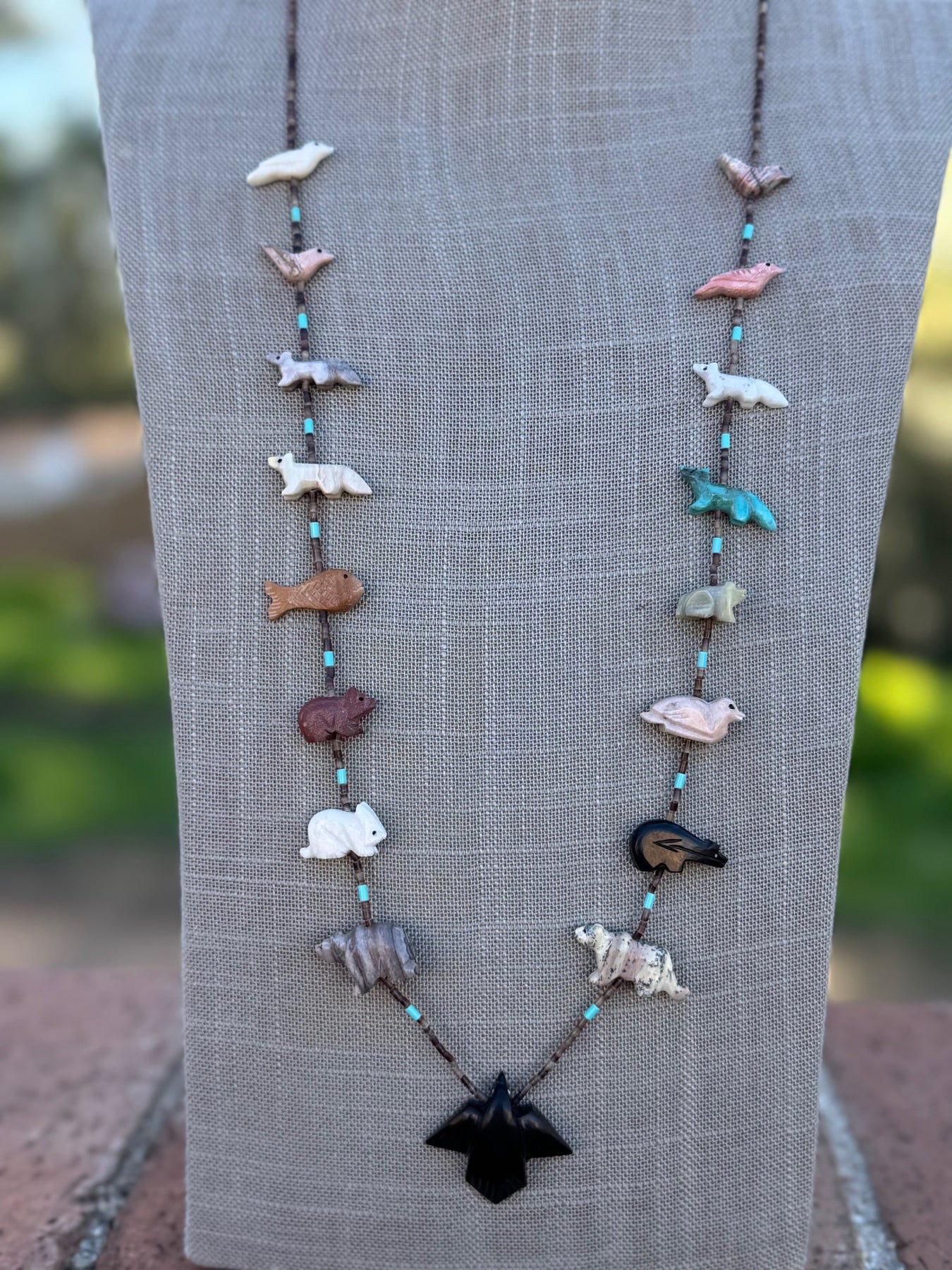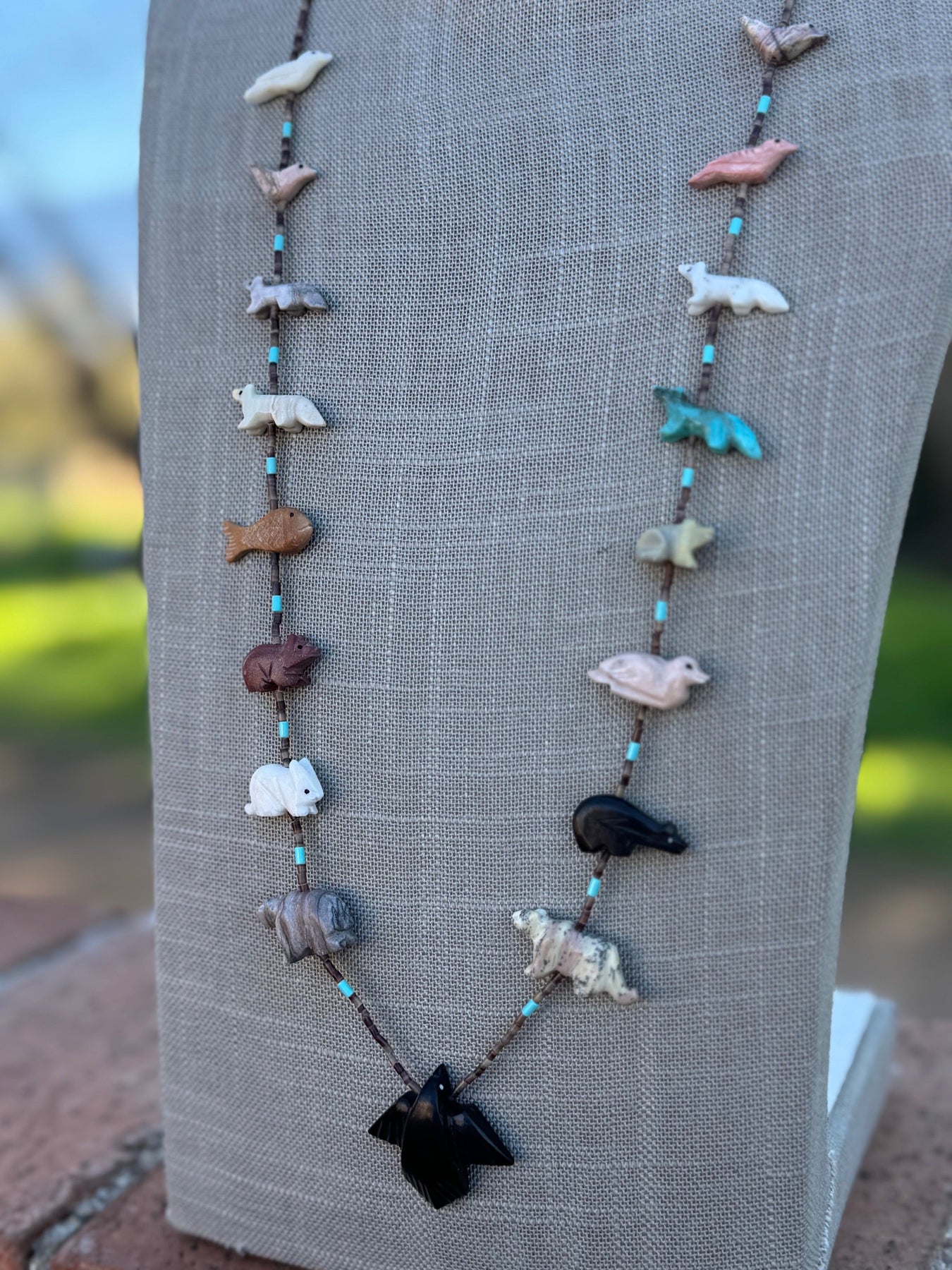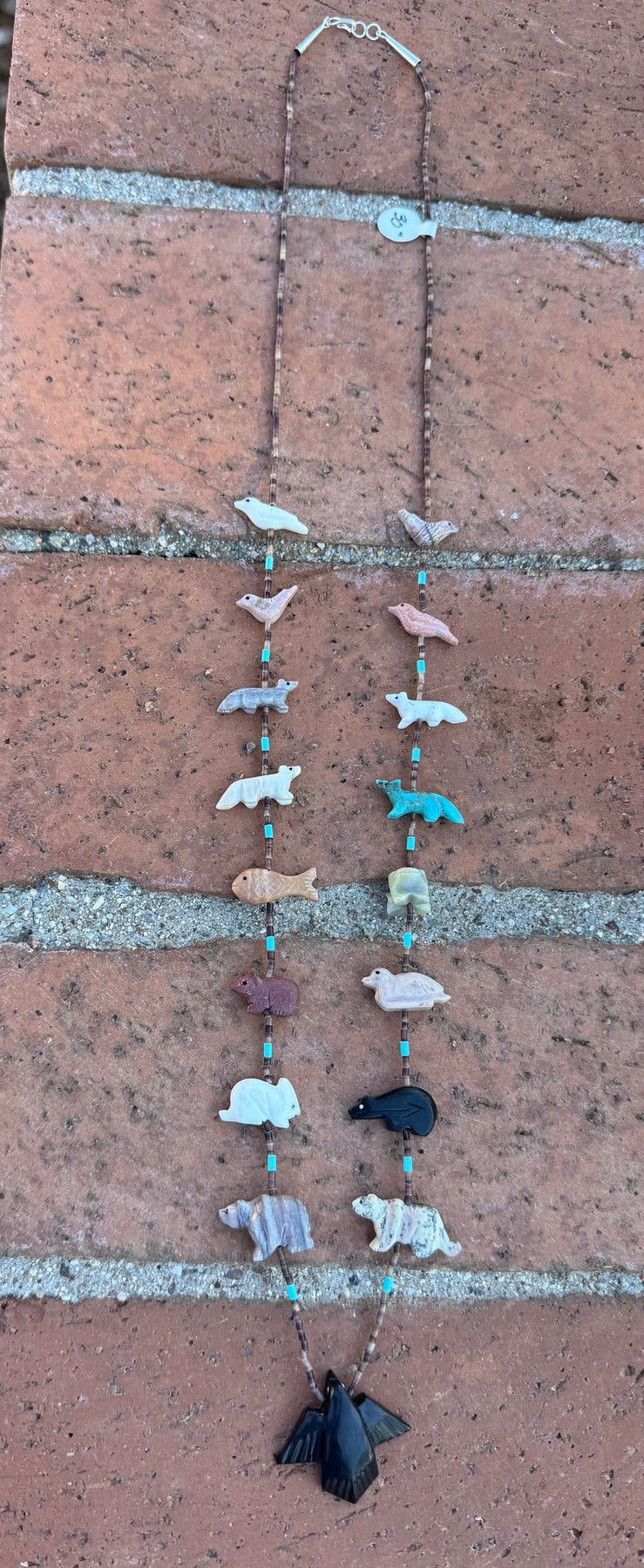Beautiful Handcrafted Sterling Silver & Beaded Fetish Necklace. Incredible hand carved fetish beads! Measuring 30 inches long.
