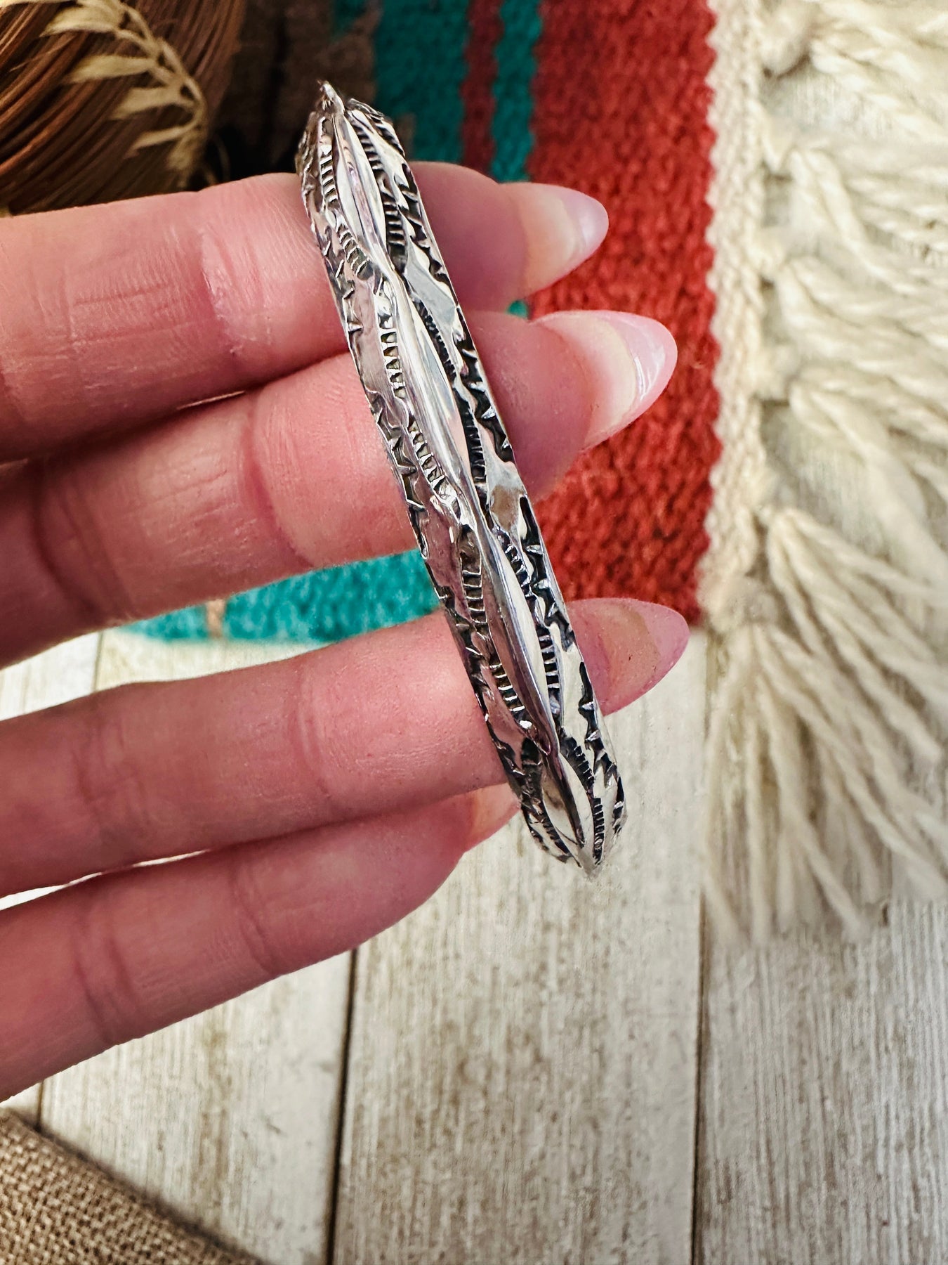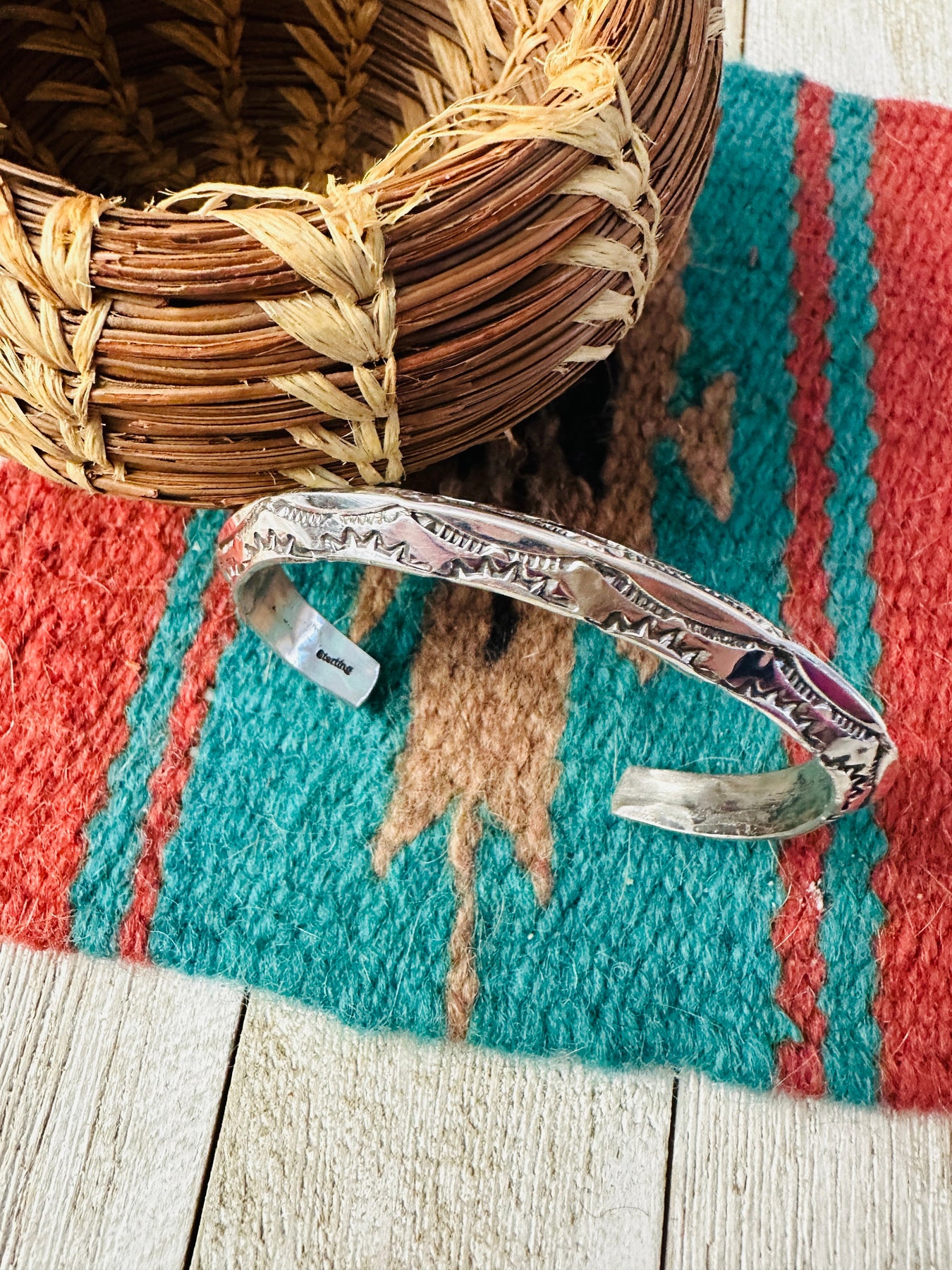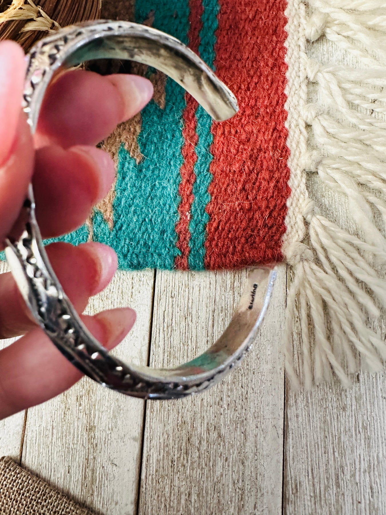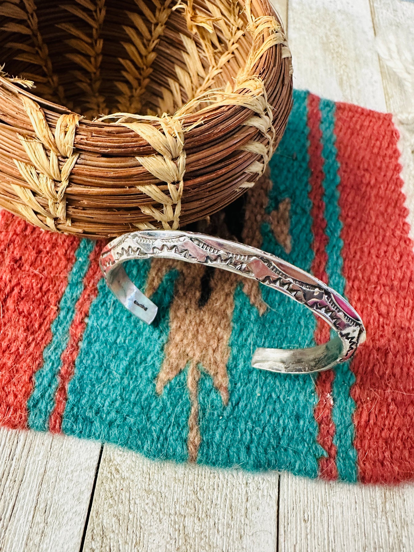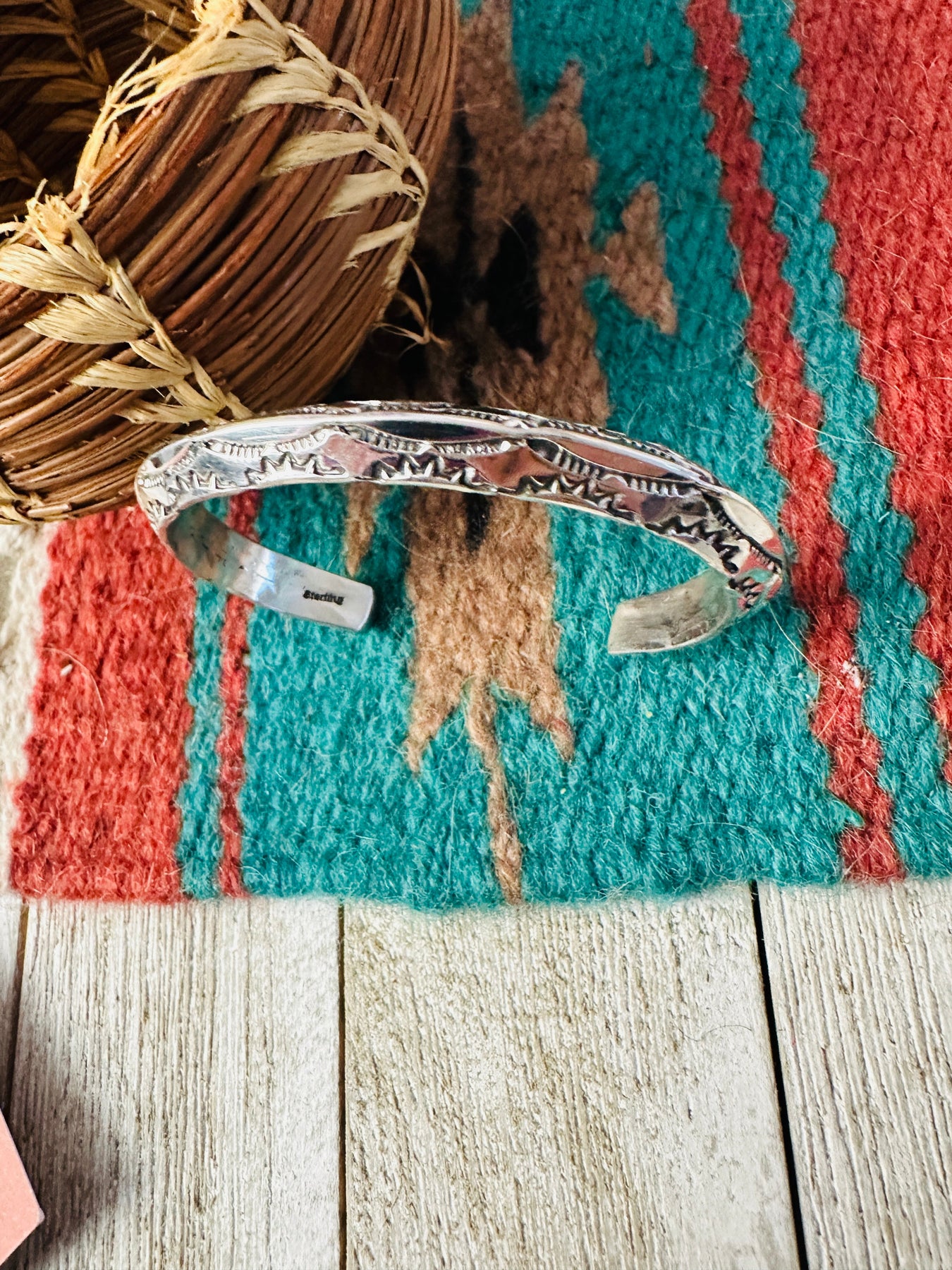 Beautiful Handcrafted Sterling Silver Cuff Bracelet. Such gorgeous stamp work on this piece! This cuff has an inside circumference 5 1/4 inches with a 1 1/4 inch gap. Width is 3/8 of an inch. Stamped Sterling.