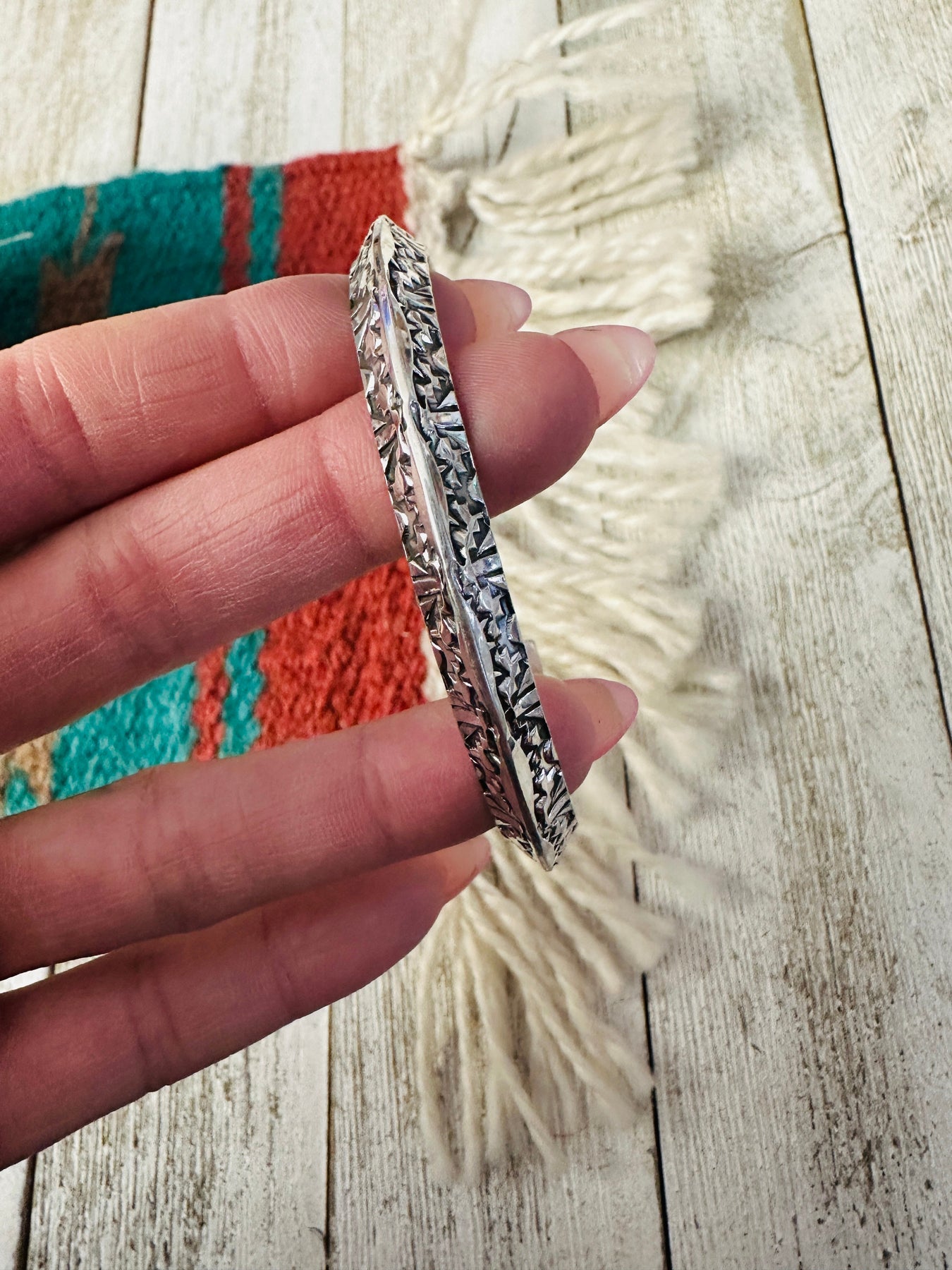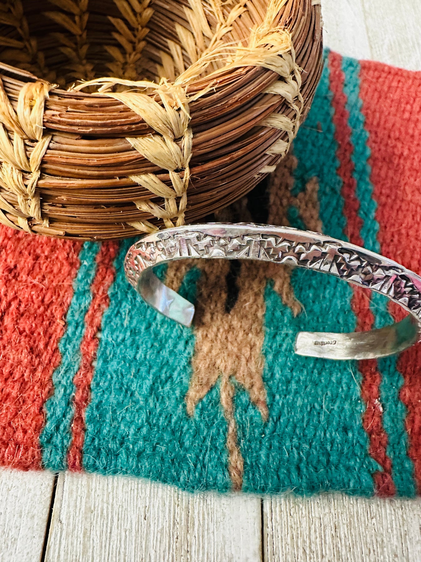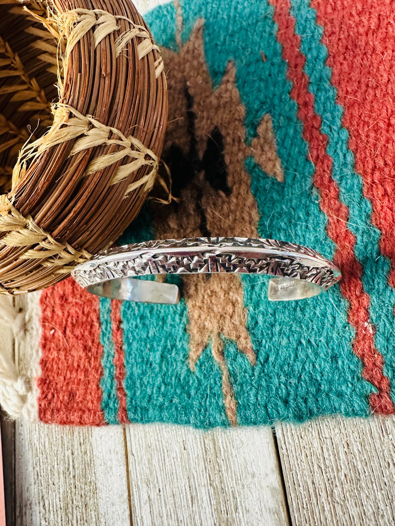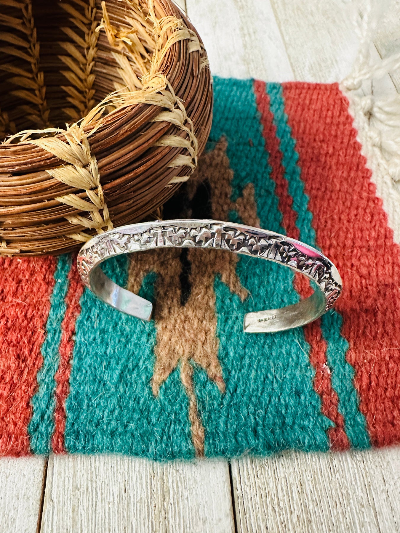 Beautiful Handcrafted Sterling Silver Cuff Bracelet. Such gorgeous stamp work on this piece! This cuff has an inside circumference 5 3/8 inches with a 1 1/8 inch gap. Width is 3/8 of an inch. Stamped Sterling.