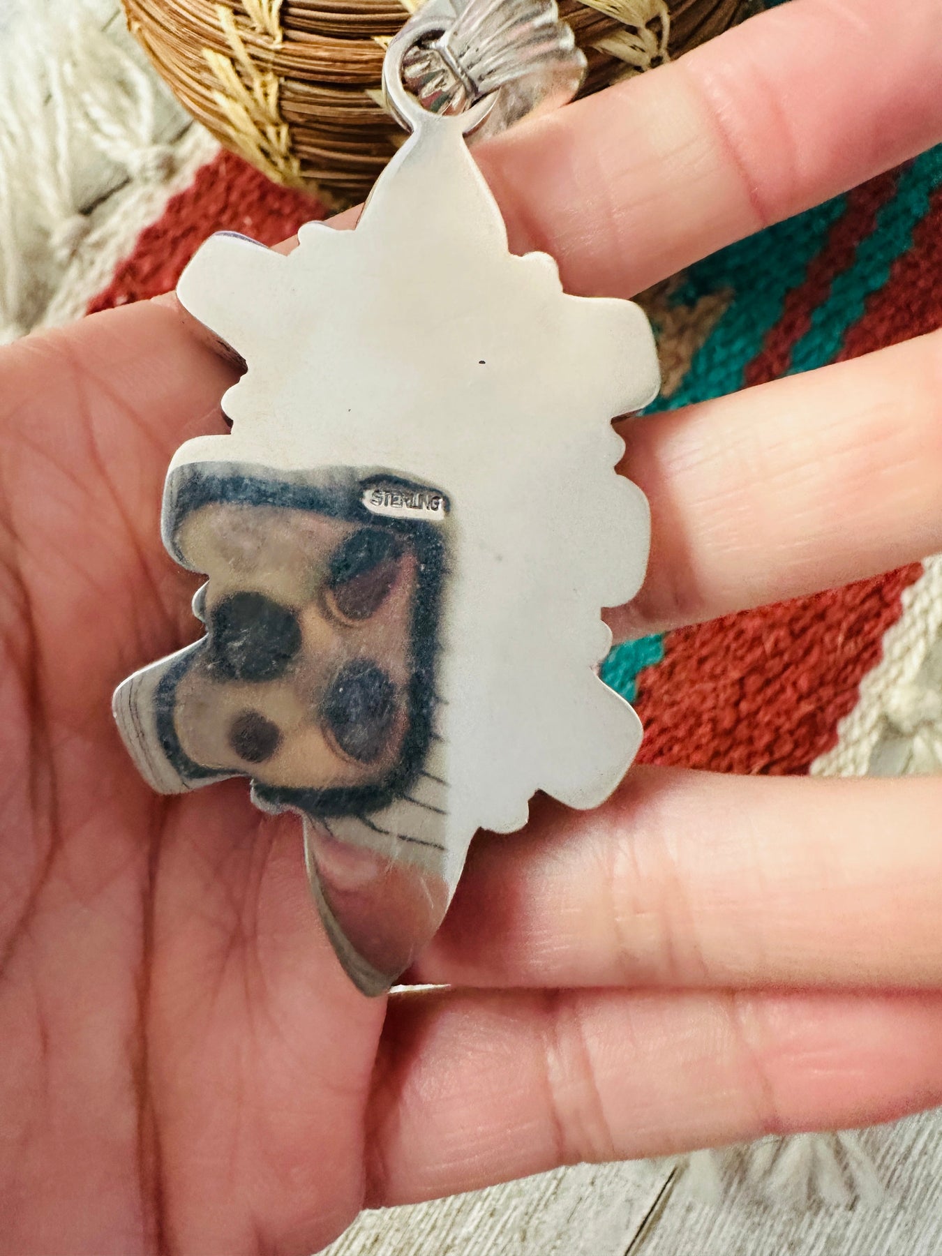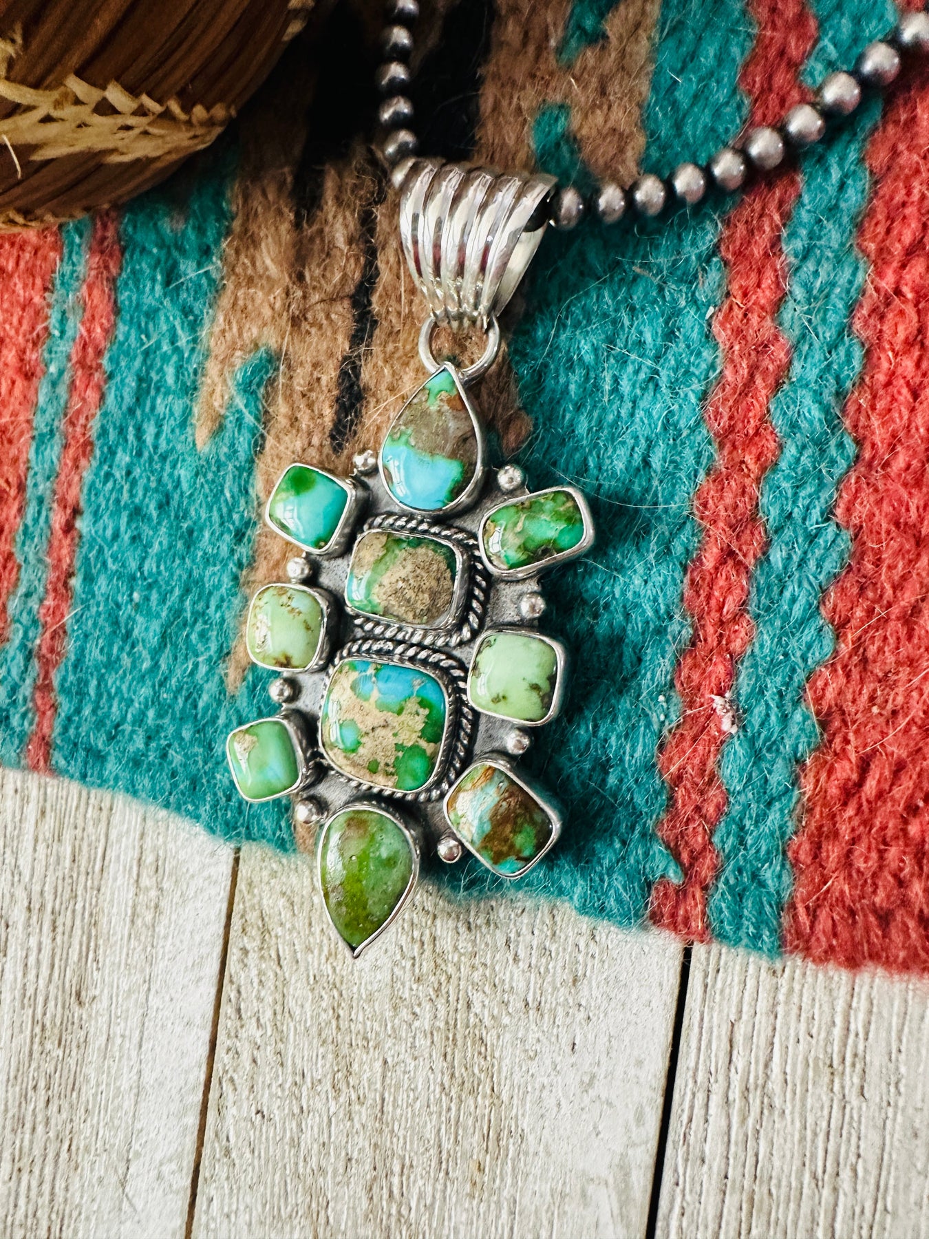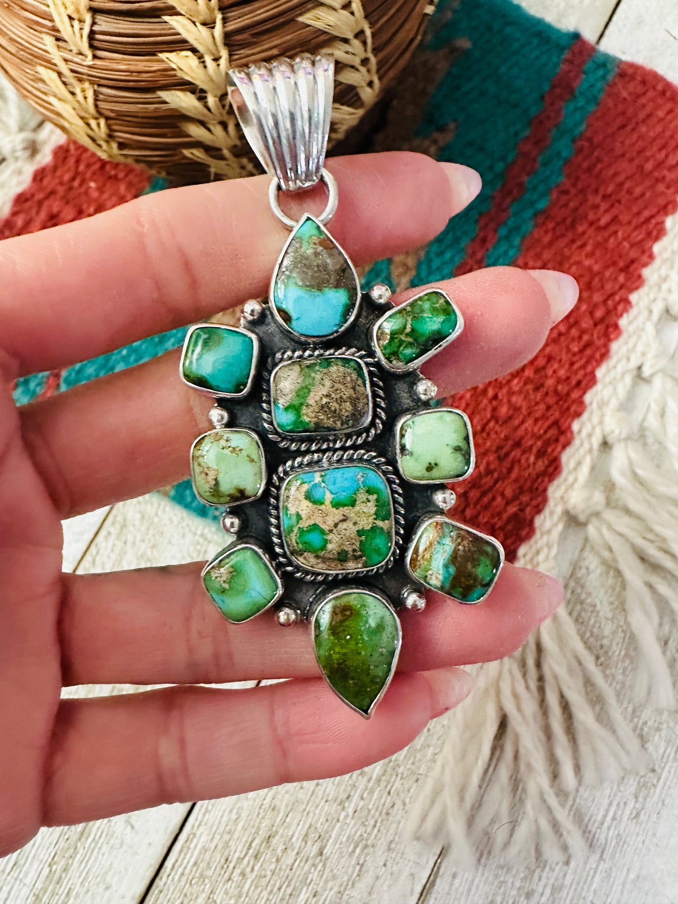 Beautiful Handcrafted Sonoran Mountain Turquoise and Sterling Silver Cluster Pendant. This pendant measures 3 3/8 inches long and 1 1/2 inches wide. Bale measures just over 3/8 of an inch across. Stamped Sterling.