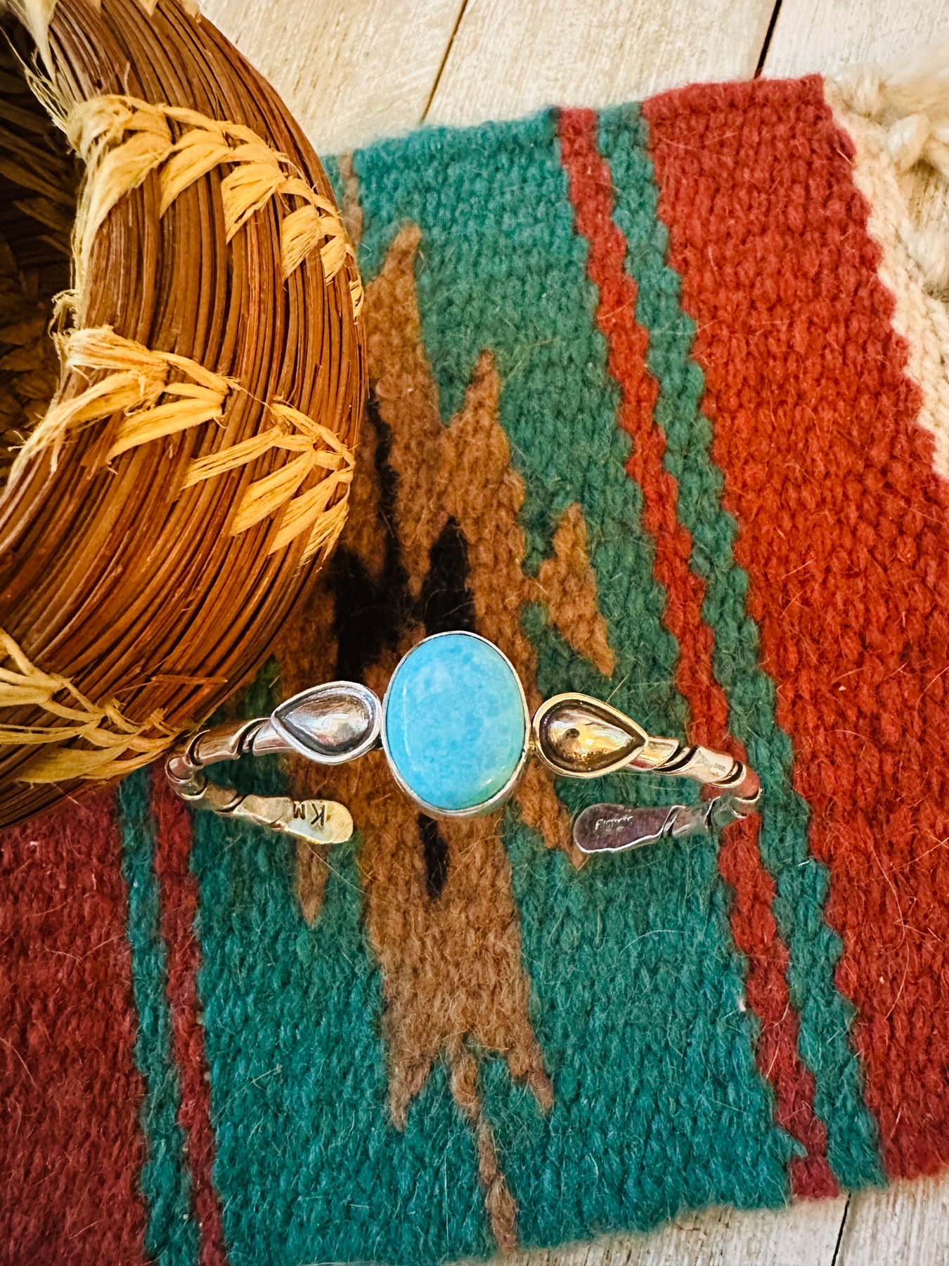 Beautiful Handcrafted Turquoise and Sterling Silver Cuff Bracelet. This cuff has an inside circumference 5 1/2 inches with a 1 1/4 inch gap. Width is 5/8 od an inch. Stamped Sterling and signed by the artist.