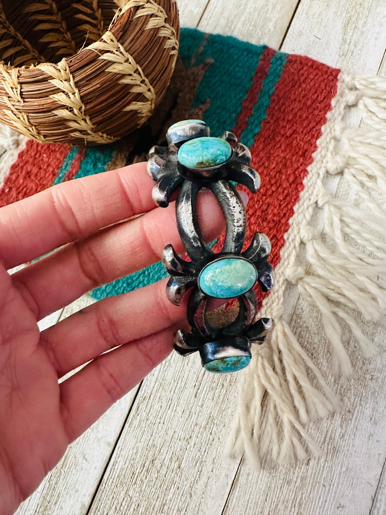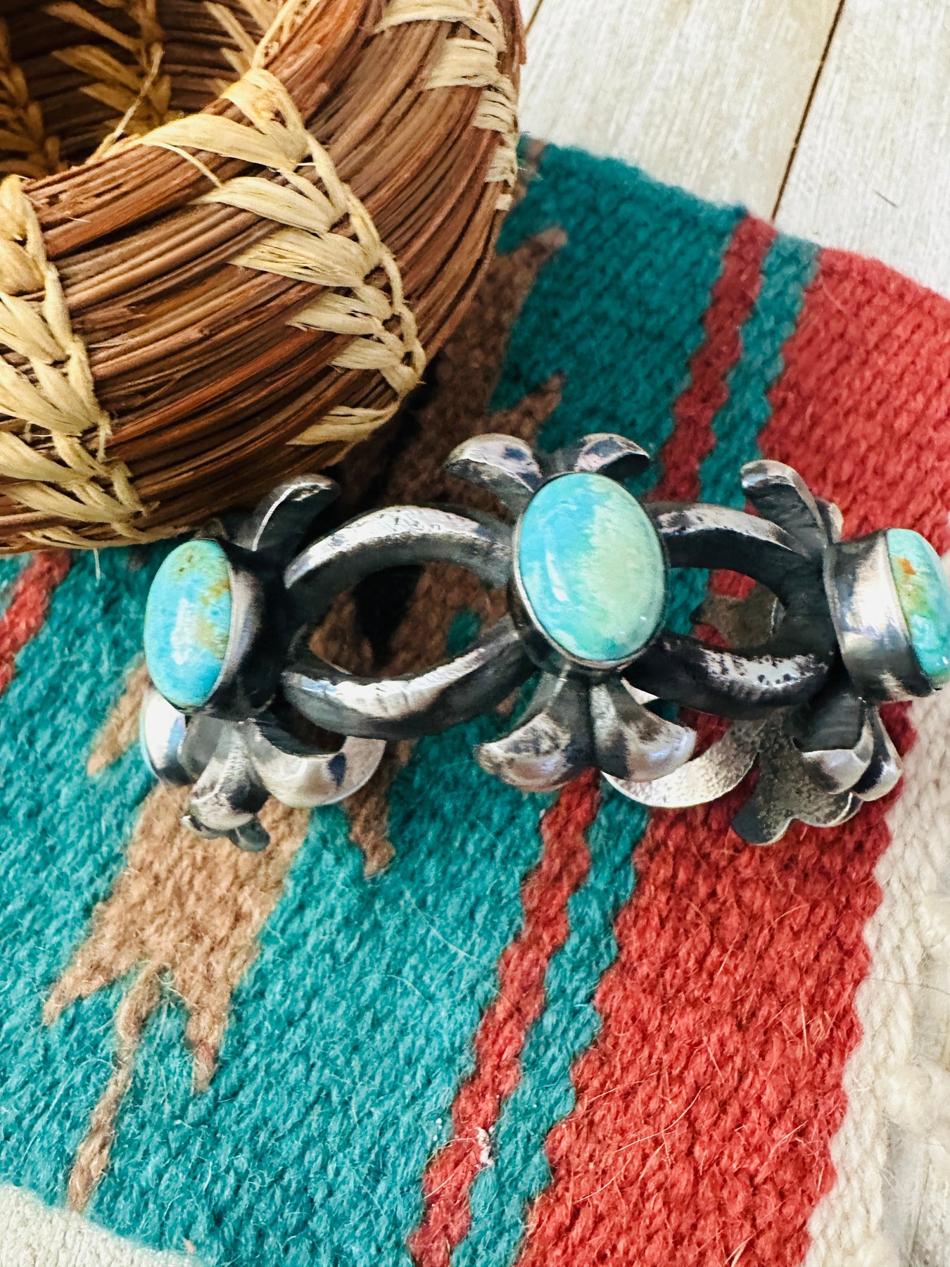 Beautiful Handcrafted Turquoise and Sterling Silver Cuff Bracelet. This cuff has an inside circumference 5 7/8 inches with an 1 inch gap. Width is 1 1/4 inches. Stamped Sterling and signed by the artist Chimney Butte.