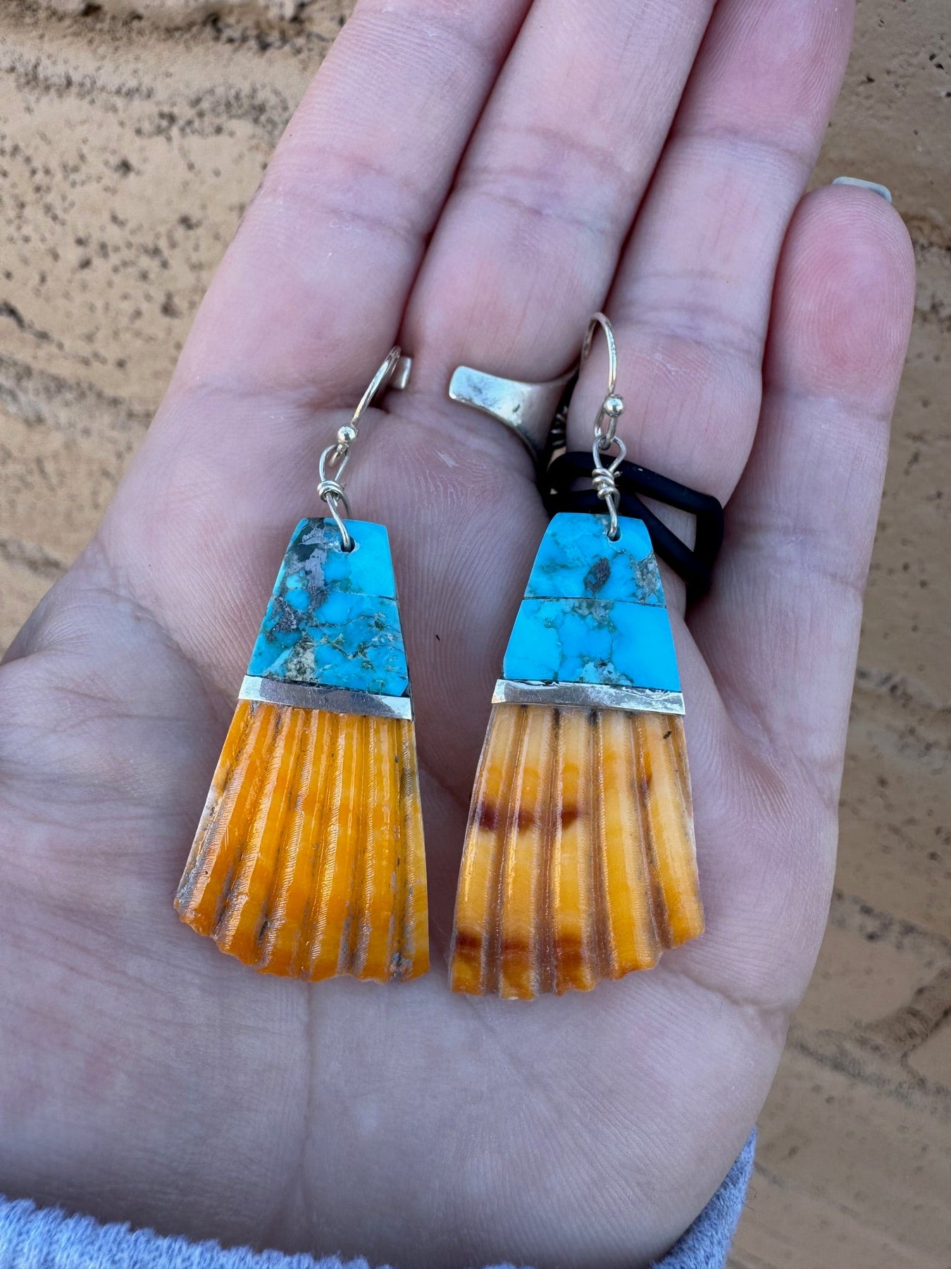 Gorgeous Handcrafted Turquoise Stone Inlay Shell Dangle Earrings. Such beautiful craftsmanship! These measure 2 inches long from top of wire and ,75 of an inch wide.