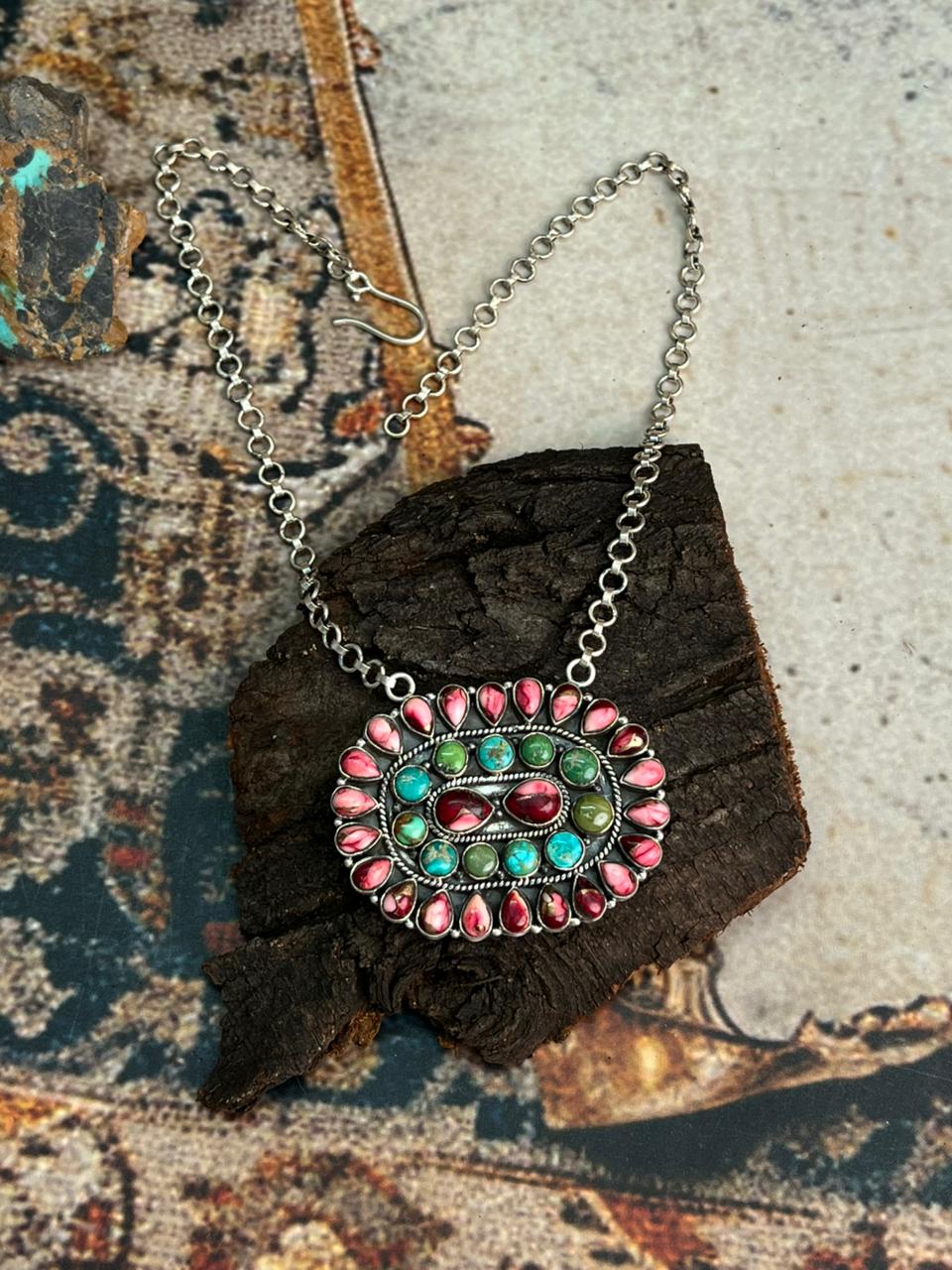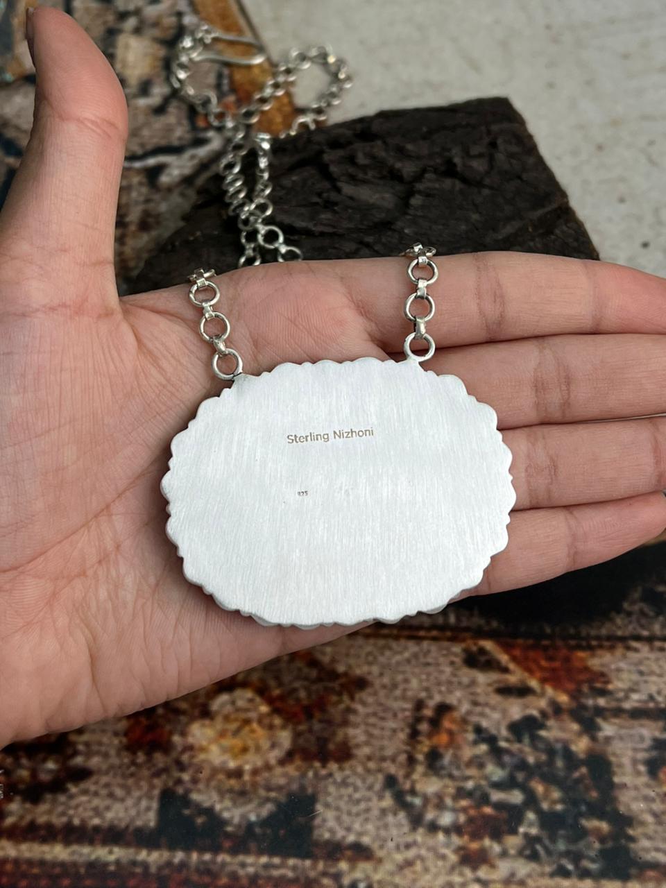 Such gorgeous craftsmanship! Sterling Silver Dahlia Rose with Emerald Valley Turquoise Necklace Measures Length 11+9" Extension, Width 2 3/8".