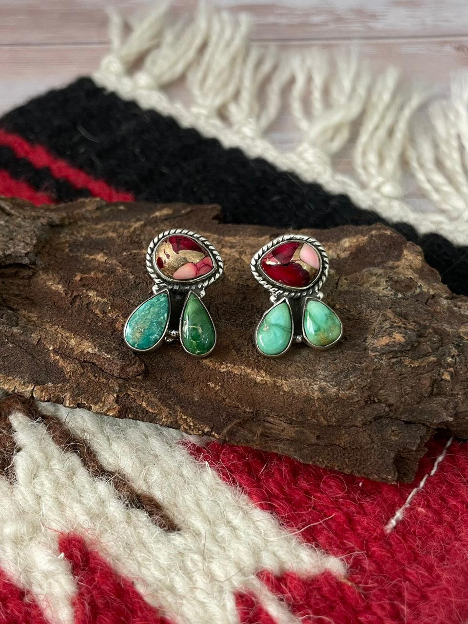 Handmade Sterling Silver Dahlia Rose with Emerald Valley Turquoise Post Earrings "Signed Nizhoni"