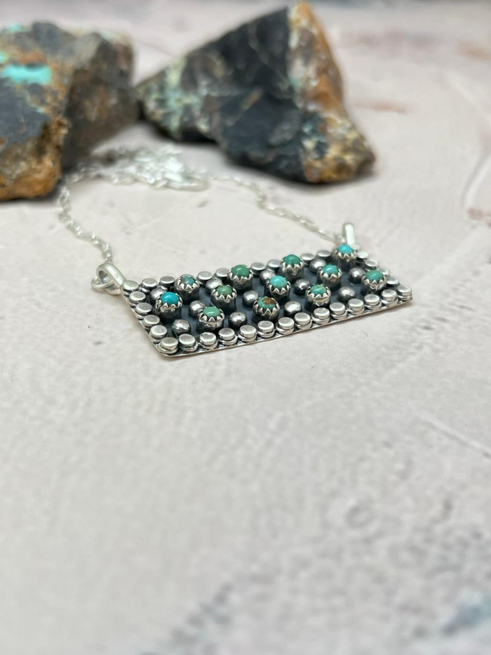 Such gorgeous craftsmanship! Sterling Silver Kingman Turquoise Necklace Measures Length 18+2" Extension, Width 1 6/8" .