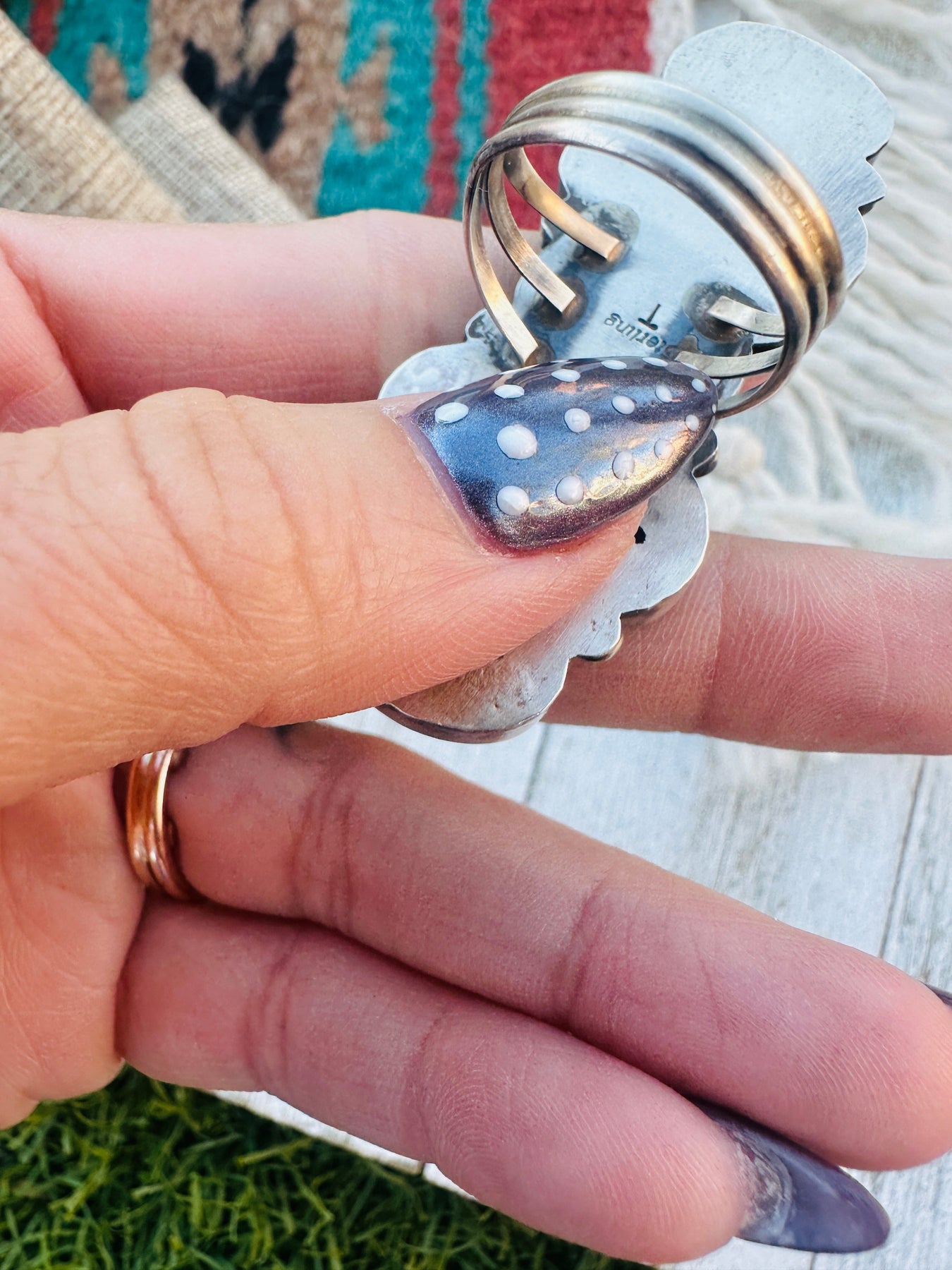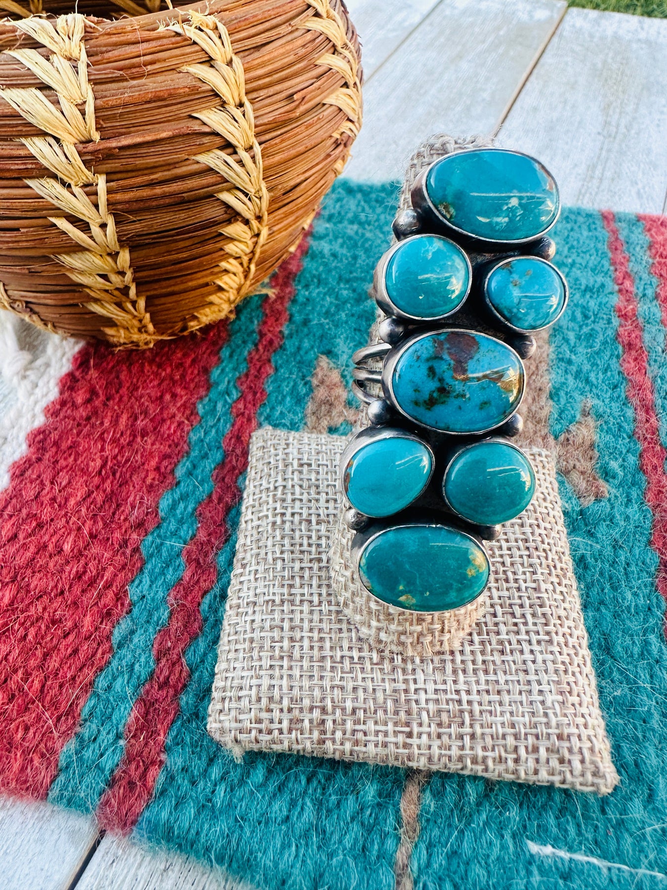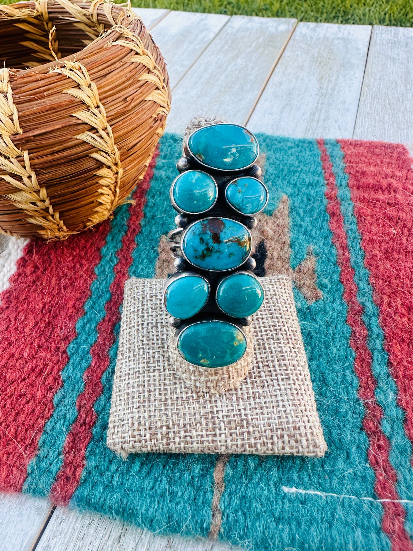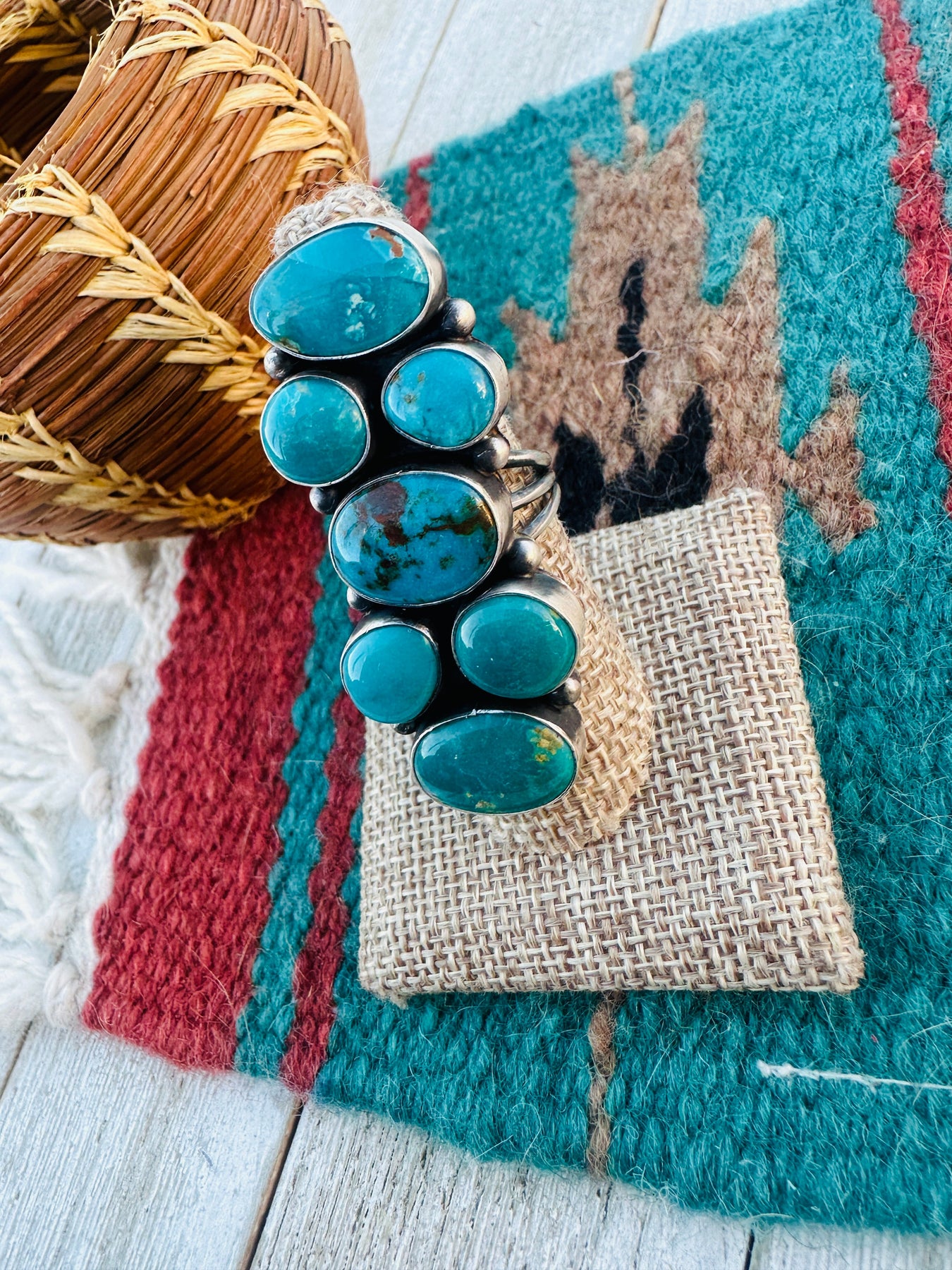 Beautiful Old Pawn Handcrafted Sterling Silver and Turquoise Cluster Ring. Size 8. Measures 2 1/4 inches long and 1 inch wide. Signed by the artist and stamped Sterling. Excellent condition!