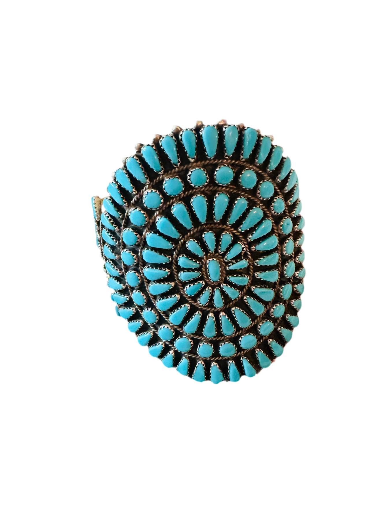 Beautiful Old Pawn Sterling Silver and Turquoise Cluster Cuff Bracelet. Cuff has an inside circumference of 5 5/8 inches with an 1 1/8 inch gap. Width is 3 inches. Signed by the artist and stamped Sterling. Such a pretty bracelet!